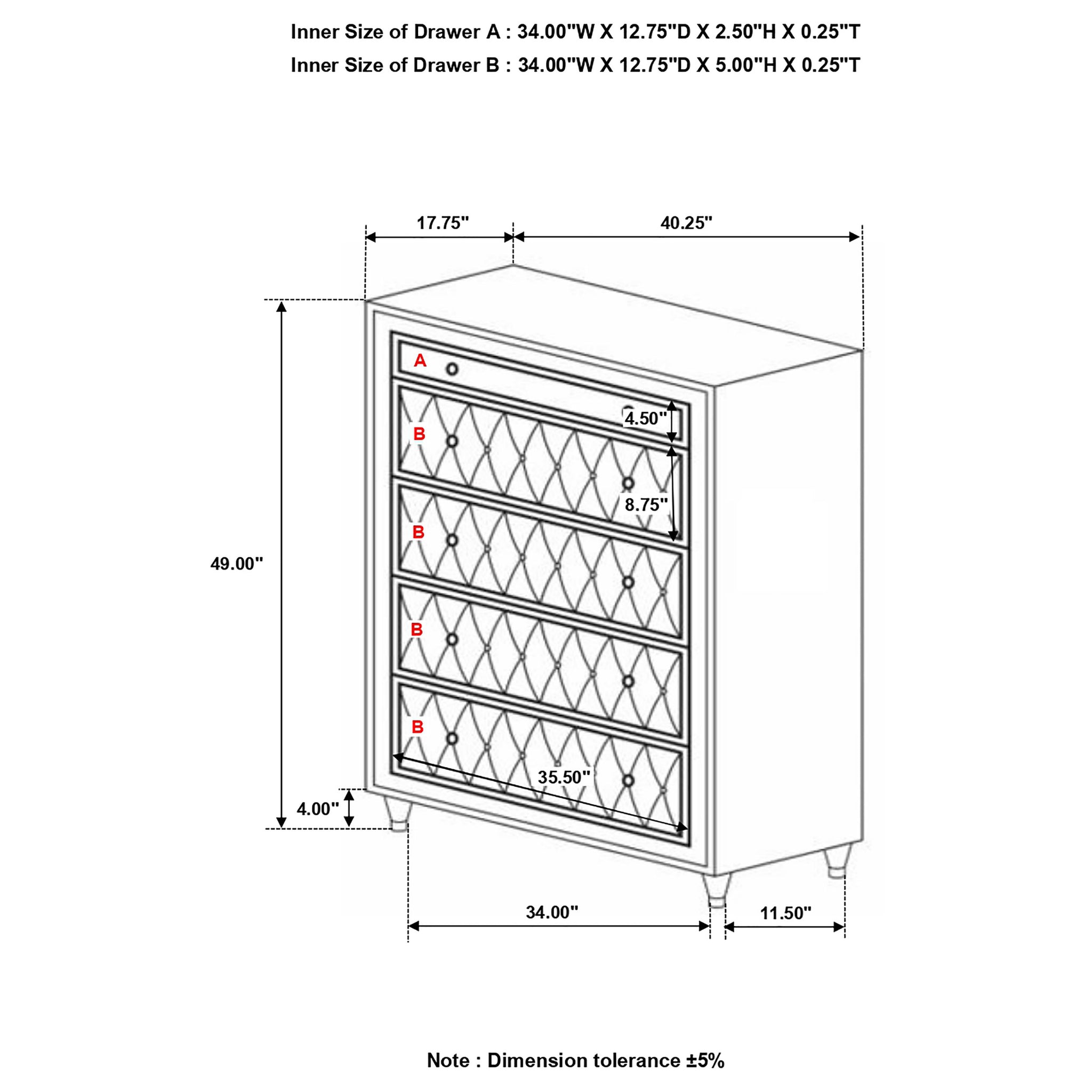 This five-drawer chest is ornately designed with French Provincial decor in mind. The perfect blend of traditional and modern, this upholstered chest comes in a gorgeous ivory and camel color. Button tufting makes this chest a masterpiece with its crystal-like accents. Tapered legs provide this chest with support while adding to the chest's aesthetics. Use the expansive tabletop for displaying decor. Key Features: • Five-drawer chest fully upholstered in ivory velvet with camel accents • Button-tufted drawer fronts include faux crystal buttons for a glam effect • Crystal hardware adds reflective sparkle and matches other case pieces • Champagne-finished tapered legs with capped feet add a refined base • Ample vertical storage perfect for wardrobe overflow or bed linens • Engineered wood structure with soft fabric overlay and foam cushioning