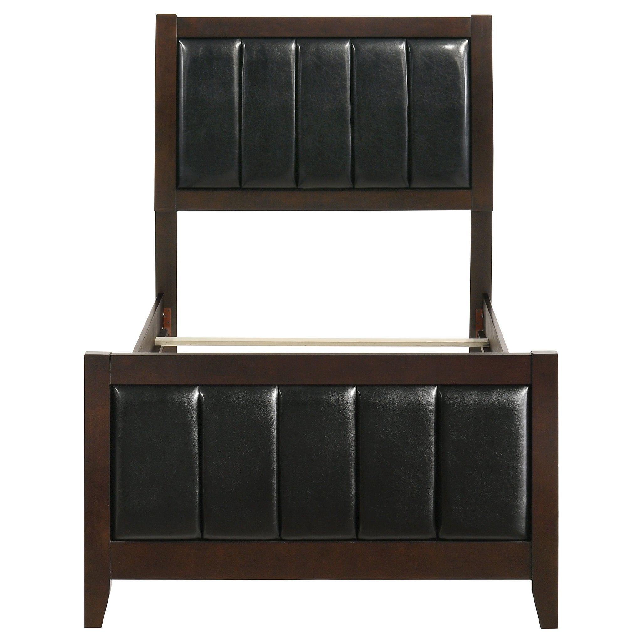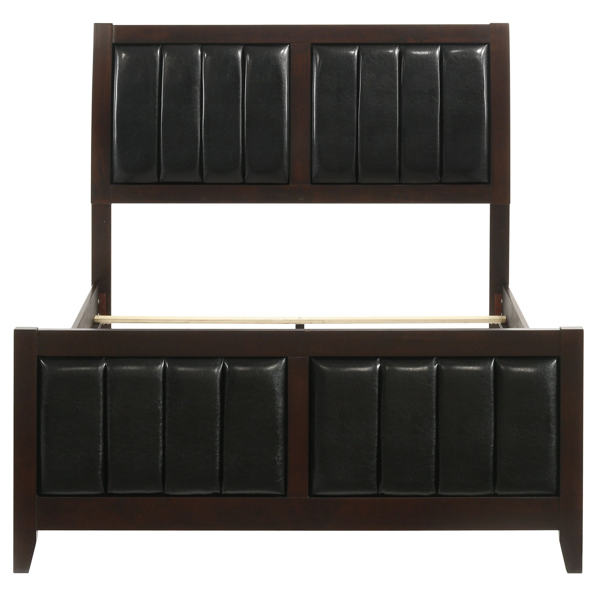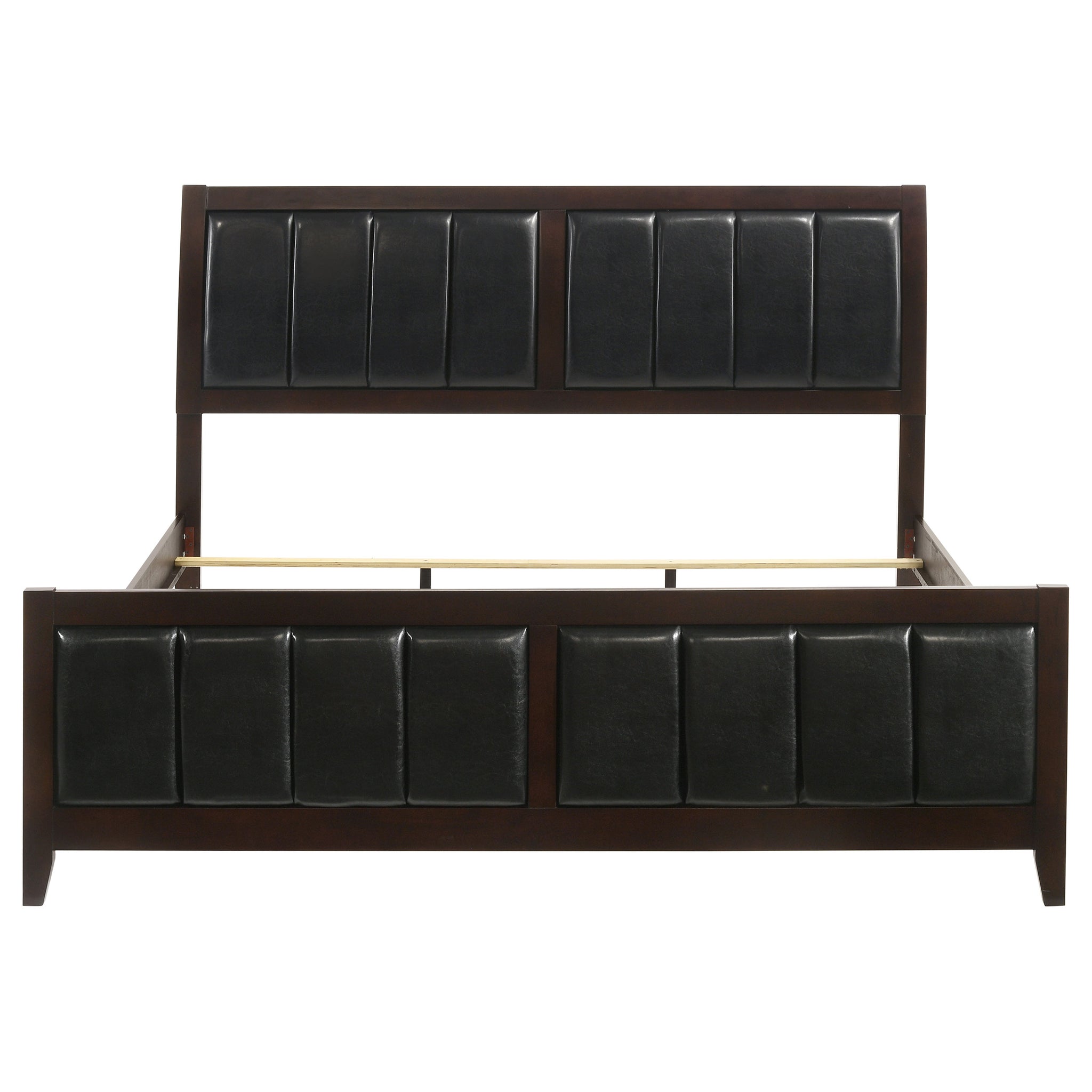A timeless centerpiece, this panel bed blends mid-century inspiration with modern sophistication. Crafted with clean lines and a bold silhouette, it showcases a rich cappuccino wood finish for warmth and depth. The headboard and footboard feature black padded leatherette panels with vertical channel detailing, offering both comfort and refined texture. Constructed from rubberwood, veneer, and engineered wood, this bed delivers enduring strength and style that enhances any bedroom retreat._x005F_x000D_ Key Features: • Queen panel bed with bold profile and mid-century modern flair • Rich cappuccino wood finish complements black padded upholstery • Headboard and footboard feature vertical channel stitch detailing • Leatherette surface adds soft texture and easy-care durability • Crafted from engineered wood, rubberwood, and okume veneer • Creates a refined focal point for any master or guest bedroom