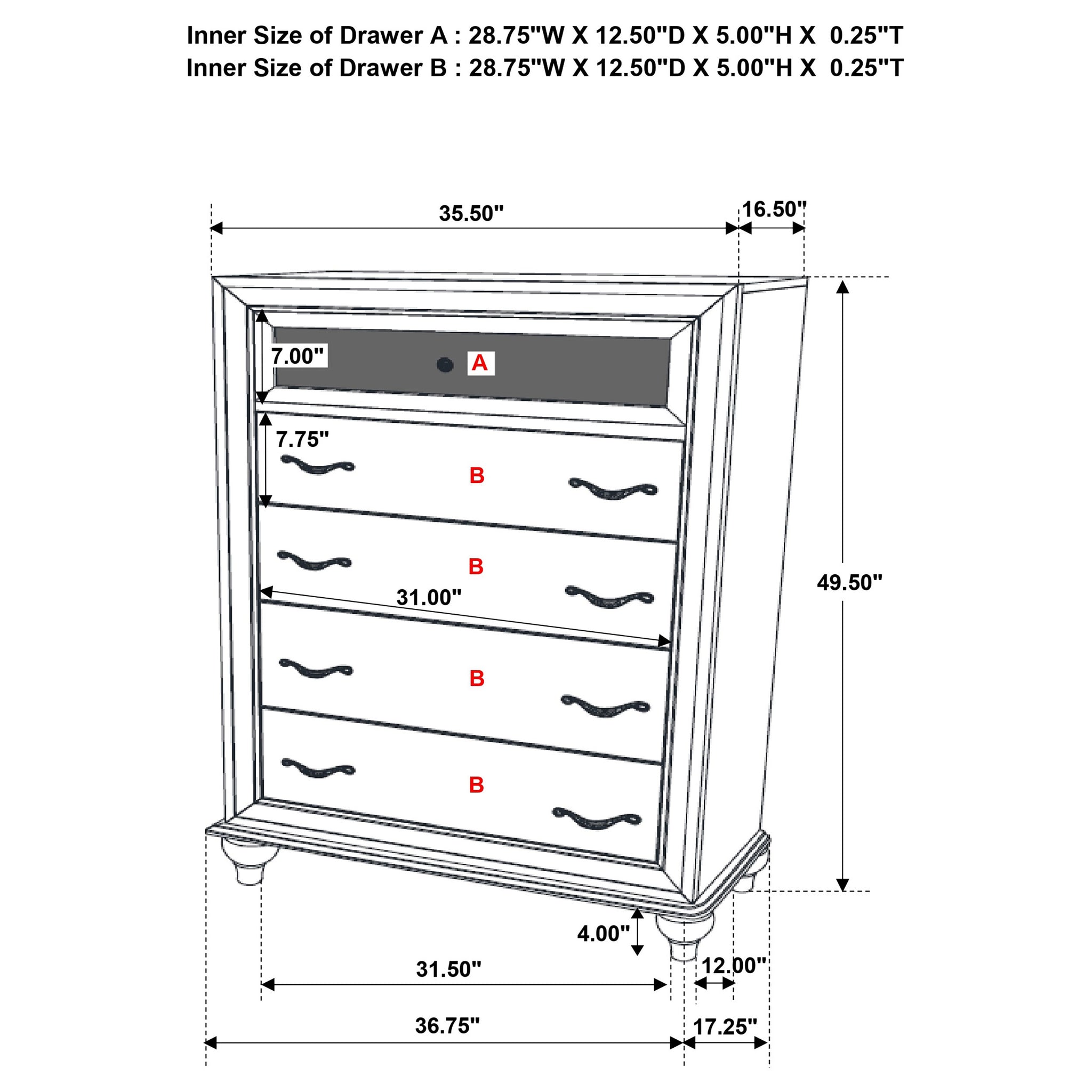 Bring sparkling sophistication to your bedroom with this five-drawer chest. The top drawer is accented with glittery acrylic panels that shimmer against the crisp white finish, while faceted crystal hardware adds a glamorous finishing touch. Sculpted bun feet introduce a classic detail that balances the modern design. Built with a sturdy frame of solid rubberwood and engineered wood with okume veneer, this chest offers durability along with generous storage space for everyday essentials._x000D_ Key Features: • White chest with five drawers and sparkling decorative panel accents • Top drawer includes glittery acrylic paneling for shimmering dimension • Faceted crystal hardware adds a glamorous sparkle to each drawer front • Generous storage capacity keeps clothing and essentials neatly organized • Frame is built with solid rubberwood, engineered wood, and okume veneer • Classic bun feet complete the design with elegant and timeless character