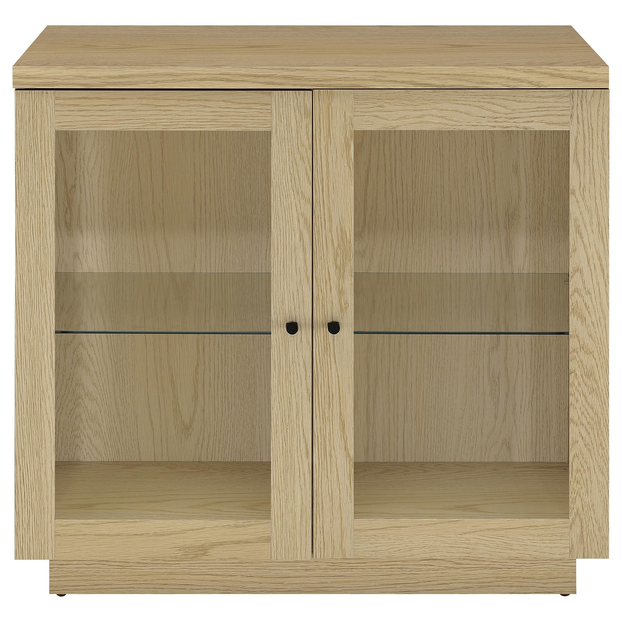 Refined symmetry meets purposeful display in this light oak accent cabinet. Framed glass doors open to reveal twin compartments divided by a central panel, each fitted with an adjustable tempered glass shelf. The soft grain of wood flows along clean lines, while black hardware adds grounding contrast. Designed to elevate living areas, dining rooms, or entryways, this cabinet blends function and harmony through thoughtfully balanced storage. Key Features: • Accent cabinet with framed glass doors and a center divider for dual storage zones • Light oak finish reveals wood-like texture for warmth and natural visual dimension • Two adjustable tempered glass shelves offer flexible organization and display • Black-finished hardware provides crisp contrast against light grain surfaces • Crafted from engineered wood, honeycomb board, and laminate veneer • Designed with tip-over restraint and concealed legs for added safety and support