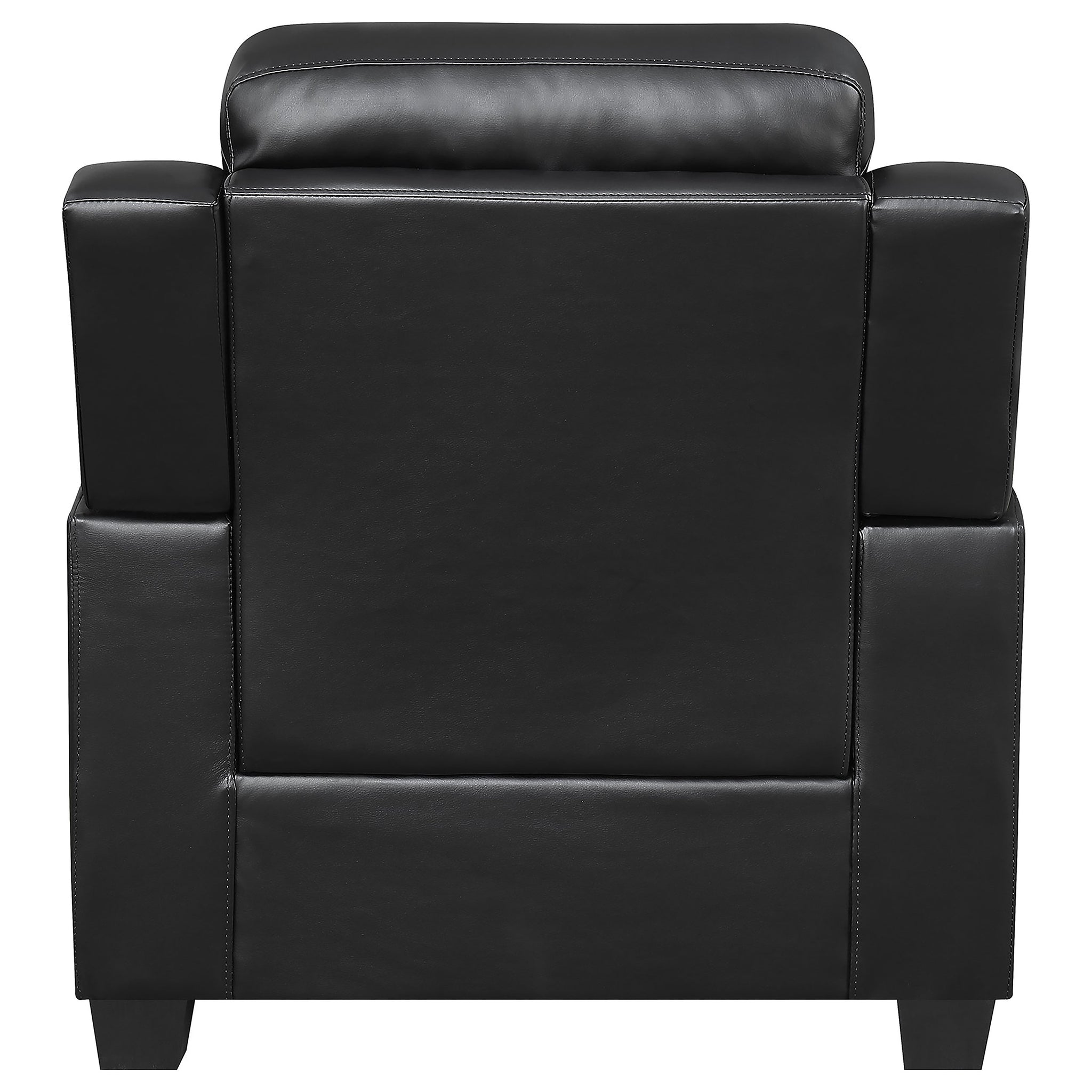 Ease away the stress of the day in this comfortable, versatile armchair. With thickly padded armrests and a plush, supportive headrest, it offers hours of cozy relaxation. Available in a variety of colors, its smooth, leather-like upholstery gives it a sumptuous look and feel. Its back is accentuated by subtle tufted stitching, adding a hint of classic glamour to its tasteful design. Paired with a matching sofa and loveseat, this chair pulls a room together in stylish harmony. Key Features: • Stylish stationary sofa collection • Perfect for small spaces • Soft, breathable, black leatherette upholstery • Ultra-plush headrest and armrests • Subtle tufting on backrests for added style • Durable kiln dried hardwood frame