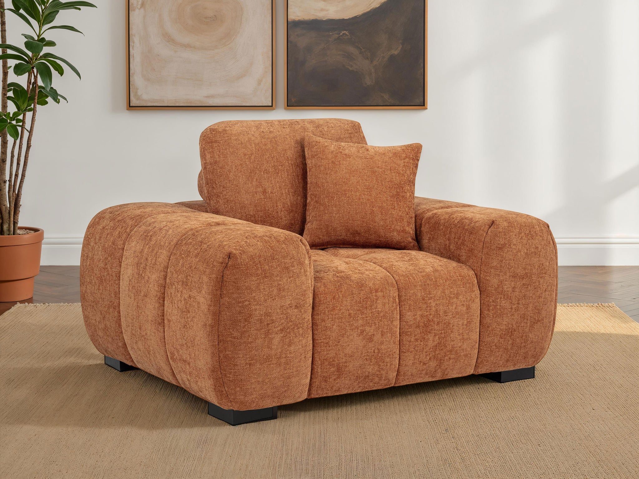 Transform your reading nook or living area into a haven of comfort with this mid-century inspired chair. Its wide, rounded arms and plush, tufted waterfall seat invite you to relax, while soft, neutral upholstery enhances its cozy appeal. A durable frame ensures long-lasting support, and reversible back cushion offer adjustable comfort. This versatile chair captures a refined yet inviting look, seamlessly blending style with everyday usability. Key Features: • Accent chair in camel fabric features sculptural curves and deep vertical channel tufting • Wide seat with plush waterfall cushioning offers bold form and full-body comfort • Reversible back cushion and accent pillow provide flexibility and cozy support • Fully upholstered from base to back for a soft, cohesive visual appearance • Padded with layered foam over a durable wood frame for lasting everyday use • Perfect as a statement seat in living rooms, bedrooms, or modern lounge spaces