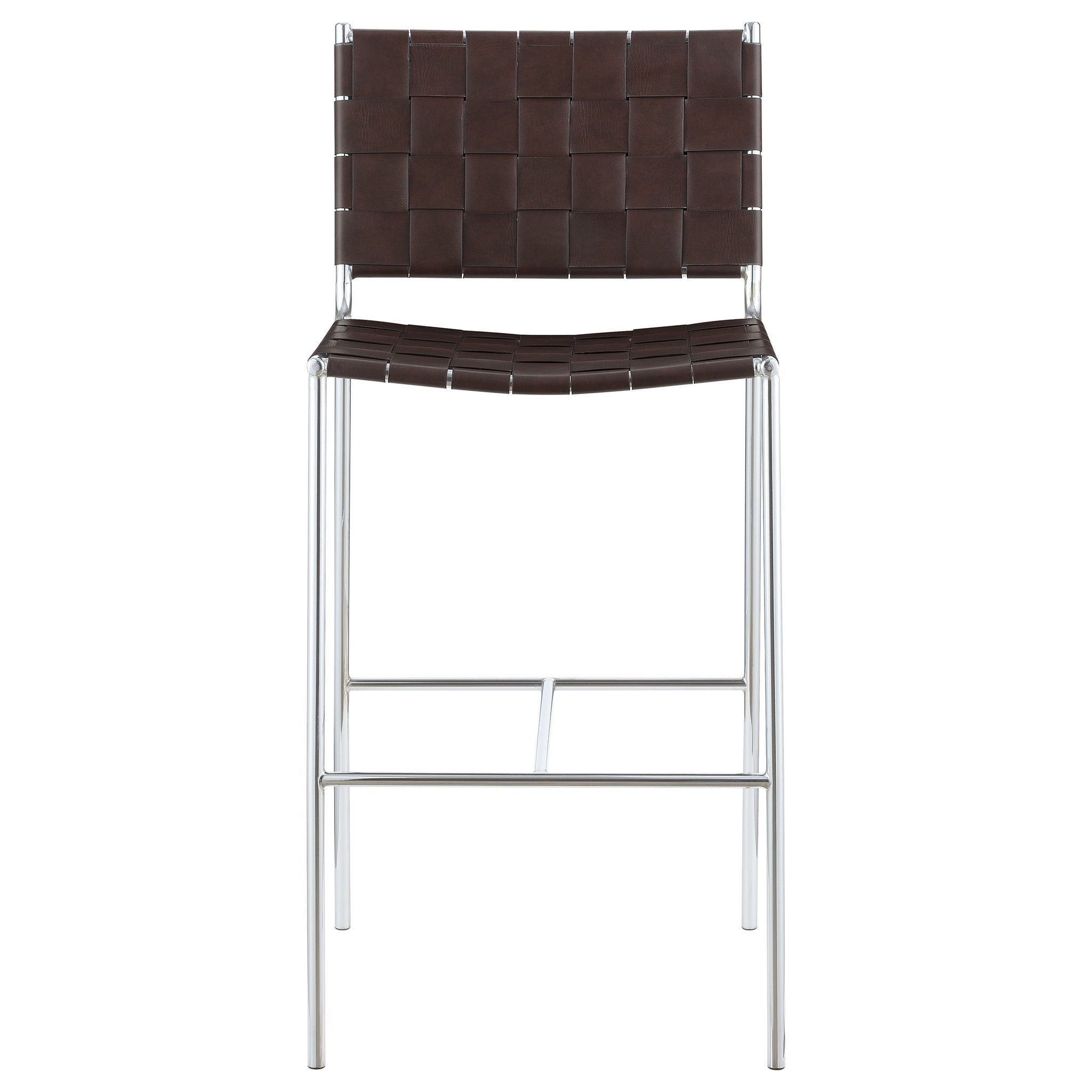 Mid-century elements lead the design aesthetic of this contemporary stool. A slim metal frame in a gleaming chrome finish offers a striking contrast against the brown faux leather accents. Narrow leatherette bands weave together to create a backrest and seat, supported by the metal frame. Slender legs extend to the floor, connected with an H-shape footrest trestle design. Sophisticated and refined, this stool lends itself wonderfully to modern home bars and kitchen counters. Key Features: • Sleek metal frame in chrome finish with brown faux leather accents for a contemporary look • Narrow leatherette bands weave together to form backrest and seat • Slender legs connected with H-shape footrest trestle design for stability • Mid-century elements create sophisticated, refined look perfect for modern home bars and kitchen counters • Slim profile and gleaming chrome finish add striking contrast to any space