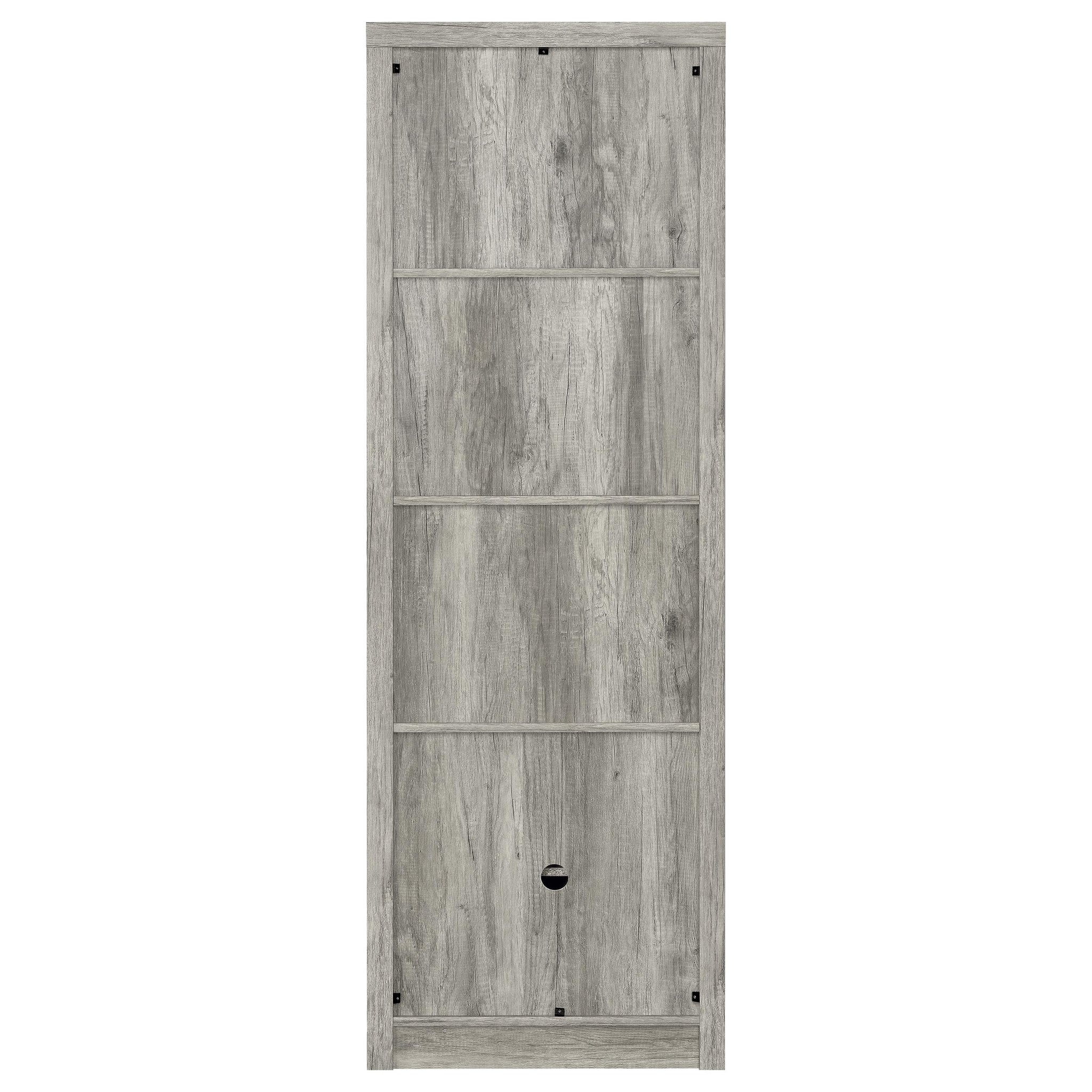 Tall and slender, this modern media tower is the perfect complement for your entertaining needs in both compact and larger spaces. Organize media, books, and implements on shelves and interior shelves, staying organized and uncluttered. Melamine construction features a distressed weathered gray finish with grain-like markings, offering rustic vibes. Find space on three fixed shelves and one adjustable shelf, all ready to separate and store gaming supplies, media, or books. A single black finished metal hardware pull offers an ideal match. Key Features: • Modern media tower suitable for various space sizes • Organize effortlessly with shelves and interior compartments • Distressed weathered gray finish for rustic charm • Three fixed and one adjustable shelf for versatile storage • Single black-finished metal hardware for a cohesive look