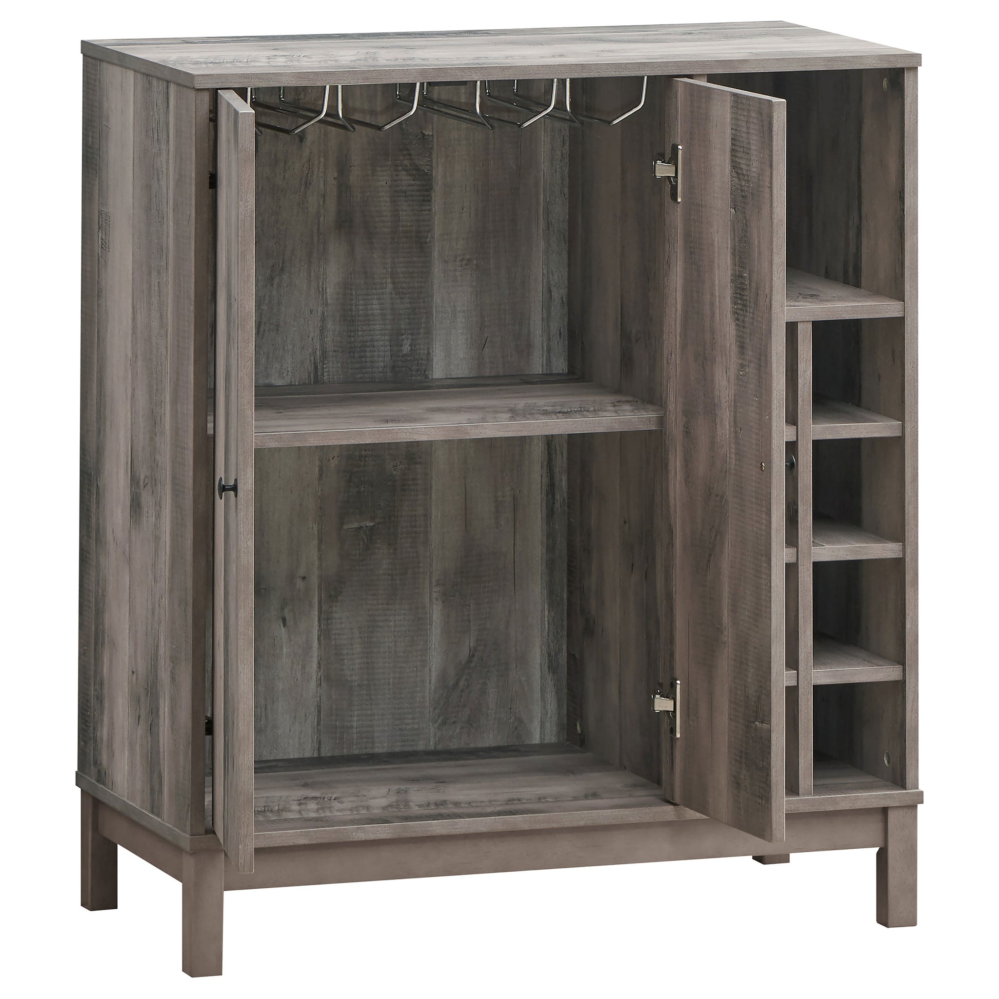 Perfect for compact homes comes this rustic wine cabinet. With a weathered Acacia wood-like finish over the frame, this wine cabinet lends itself to modern farmhouse style living rooms and dining rooms. On the right side are eight wine bottle storage cubbies, along with an open space for storing extra wine accessories. On the left side is a double-door cabinet that hides away all your items neatly inside, with the help of four stemware racks and two open shelves. Each cabinet door also features a matte black round pull that lends a modern flair. Key Features: • Wine cabinet with dual storage configuration and dedicated wine bottle cubbies • Weathered acacia finish adds rustic appeal with a modern farmhouse aesthetic • Two-door cabinet with interior shelving and four integrated stemware racks • Eight bottle compartments and upper cubby offer convenient open display options • Crafted from rubberwood, engineered wood, and laminate veneer surfaces • Matte black hardware and anti-tip kit included for enhanced safety and style