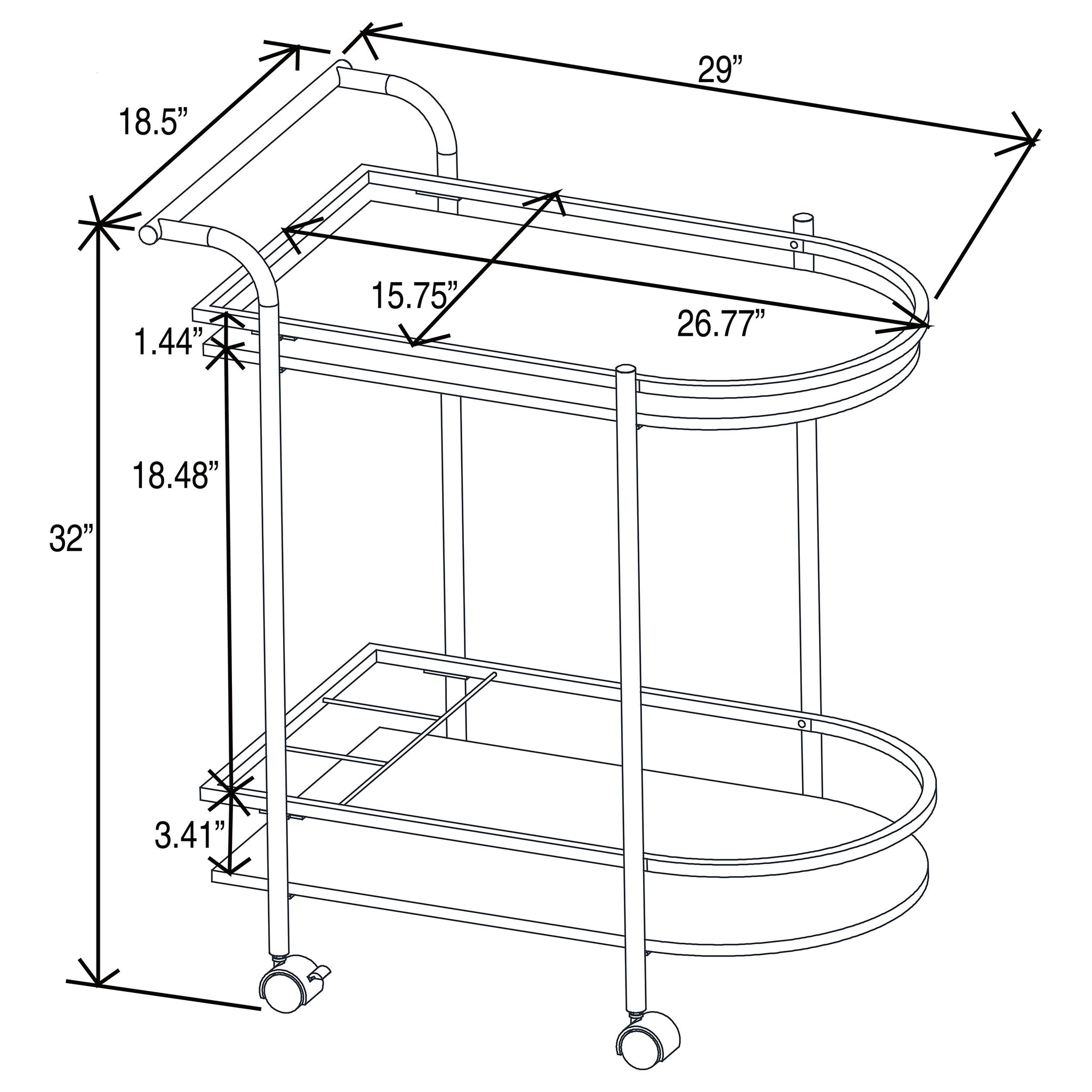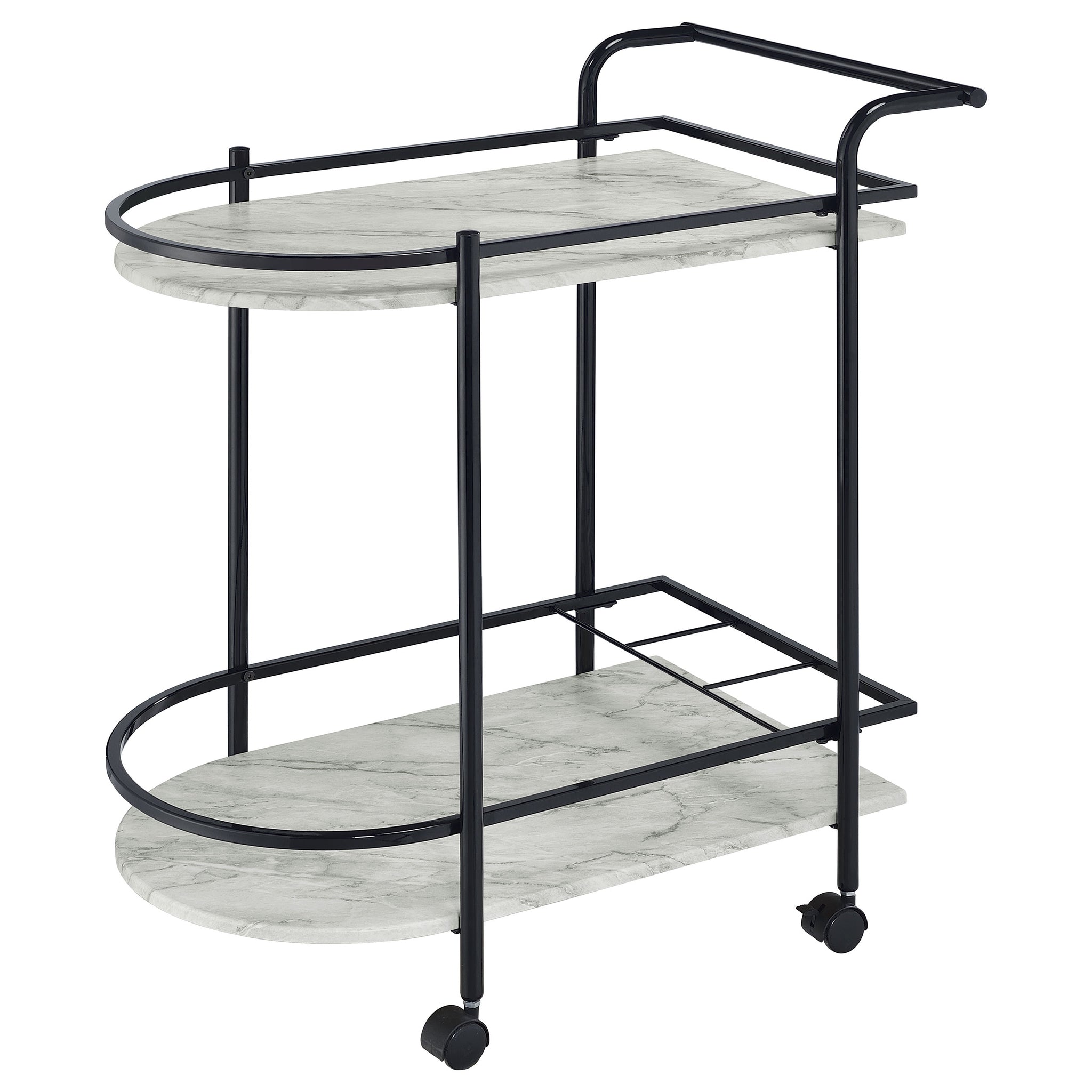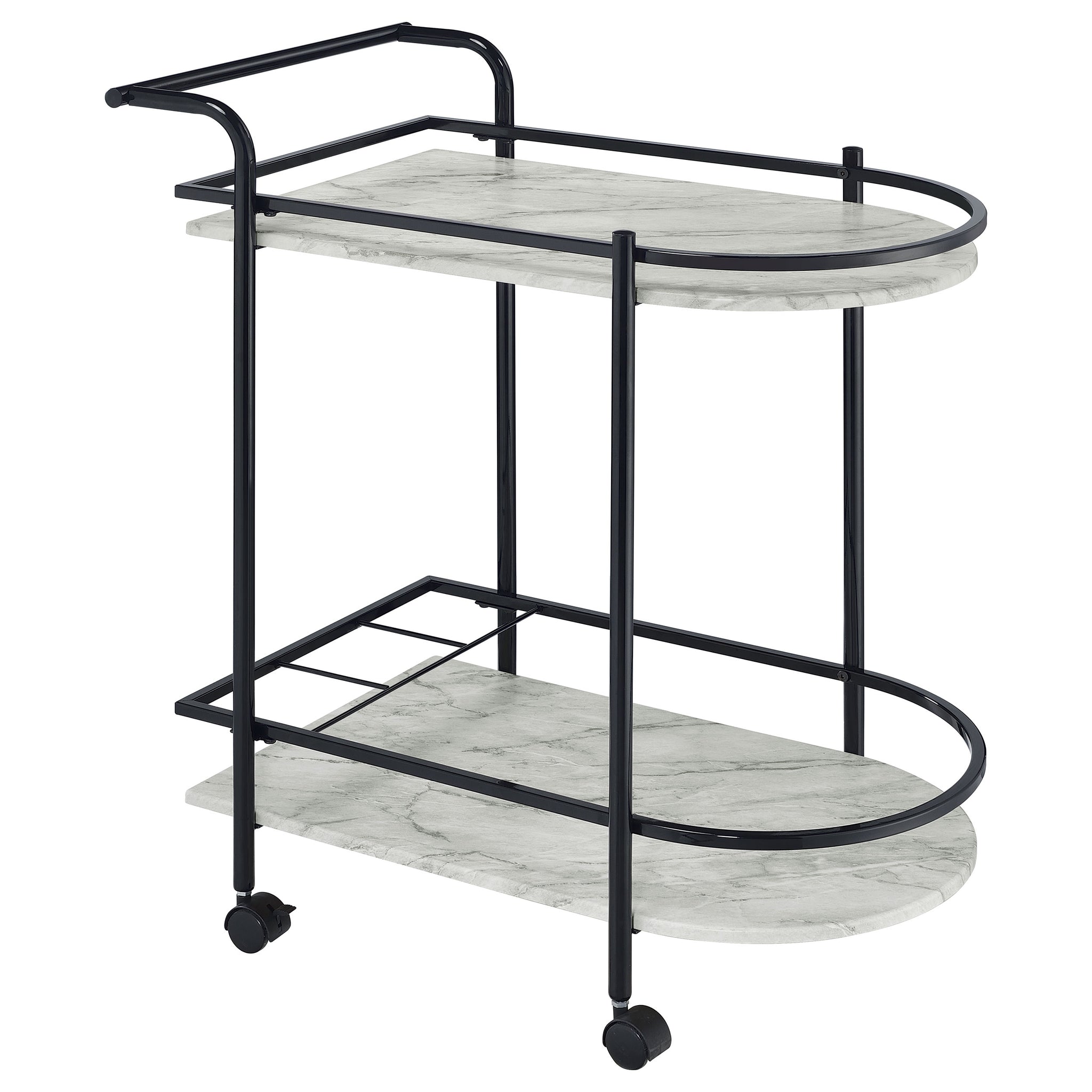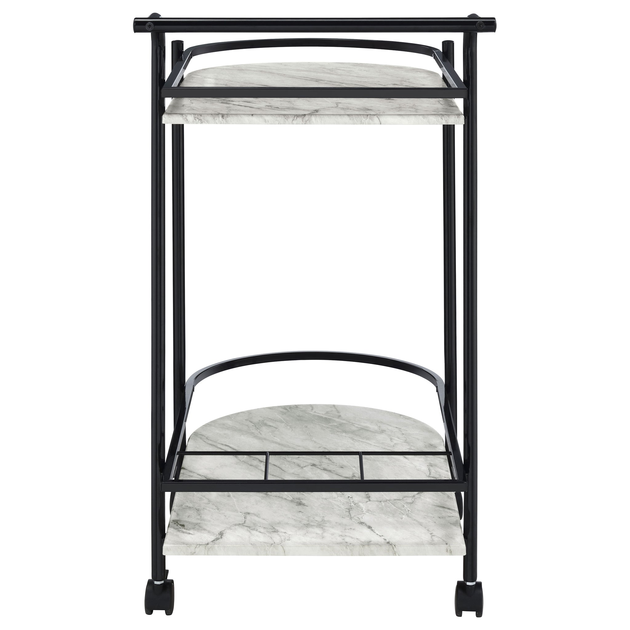 Invite guests over for an intimate soiree and serve up cocktails on this contemporary bar cart. Classic faux white marble shelves stack on top of one another, lending a traditional approach to its sleek modern silhouette. Rounded edges on one side add to the graceful appeal of the elongated shape. Designed in a metal frame with slim railing all around to keep bottles in place, this bar cart is ready to glide across floors. Lockable rolling casters secure it in place. Key Features: • Perfect for contemporary dining spaces and entertaining guests • Faux white marble shelves with rounded edges lend a traditional vibe • A metal frame with a handlebar along one side makes it easy to push around • Smoothly glide this cart from room to room with the lockable caster wheels • Secure 3 bottles on the built-in wine rack on the bottom shelf