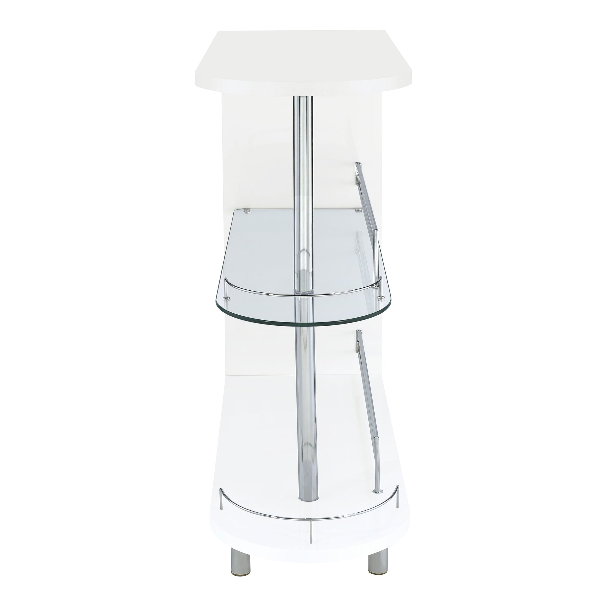 This stylish bar unit is a fabulous option for your entertaining needs. A sleek silhouette and glossy black finish give it a chic, modern appeal. Its tempered glass storage shelves offer a handy place to display a collection of fine wines and spirits. Protective guardrails help prevent accidental spills and keep bottles safe and secure. A handy stemware rack rounds out the versatile convenience of this contemporary bar unit. Key Features: • Rounded end adds an elegant feel to this glossy black bar unit • Clear tempered glass shelf adds stability for your choice of spirits • Storage features include two (2) tiers of shelving, including one (1) glass shelf with guardrails, and stemware racks • Steel, MDF, and laminate construction • Your choice of glossy black, glossy white, or glossy grey