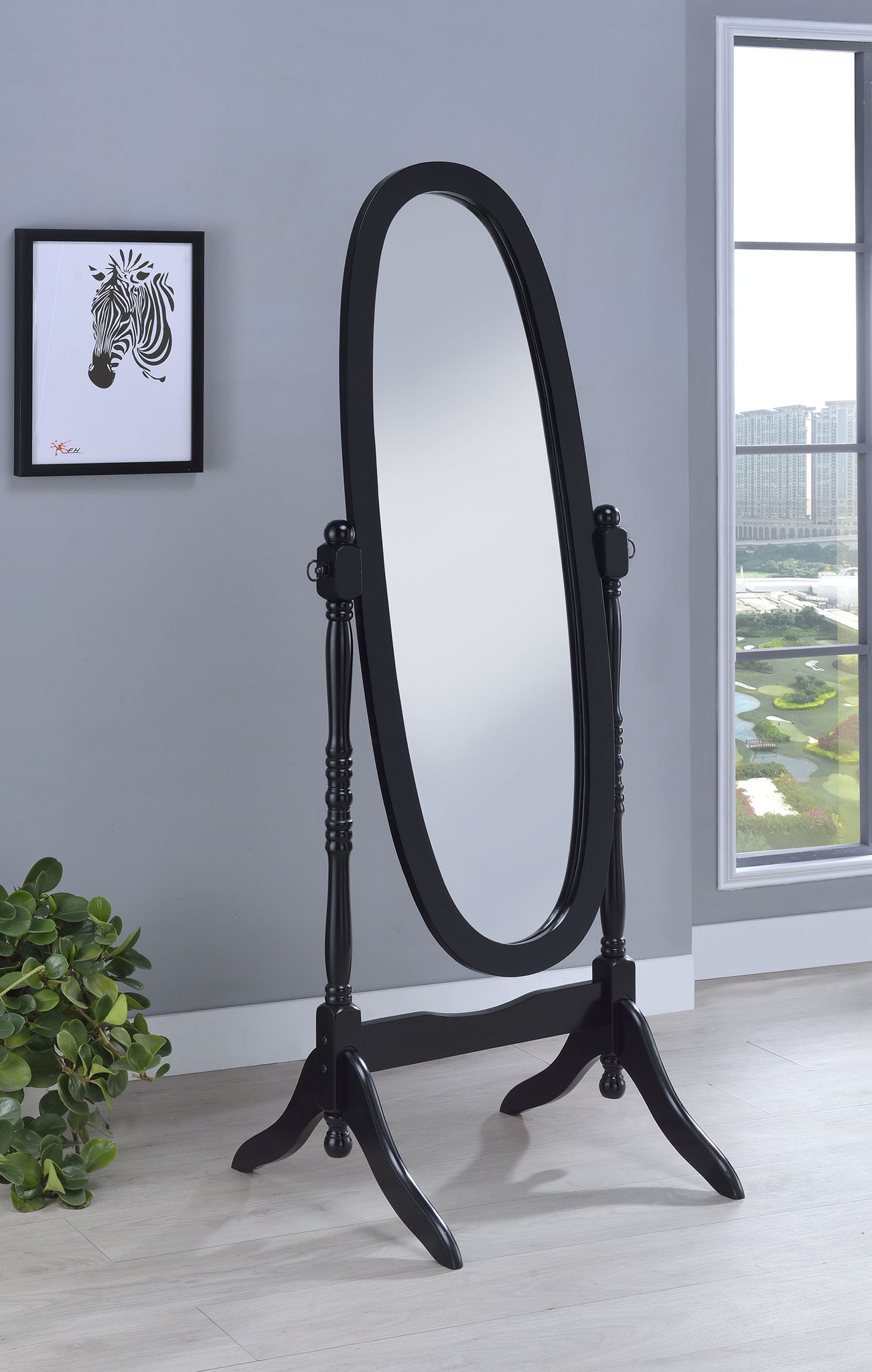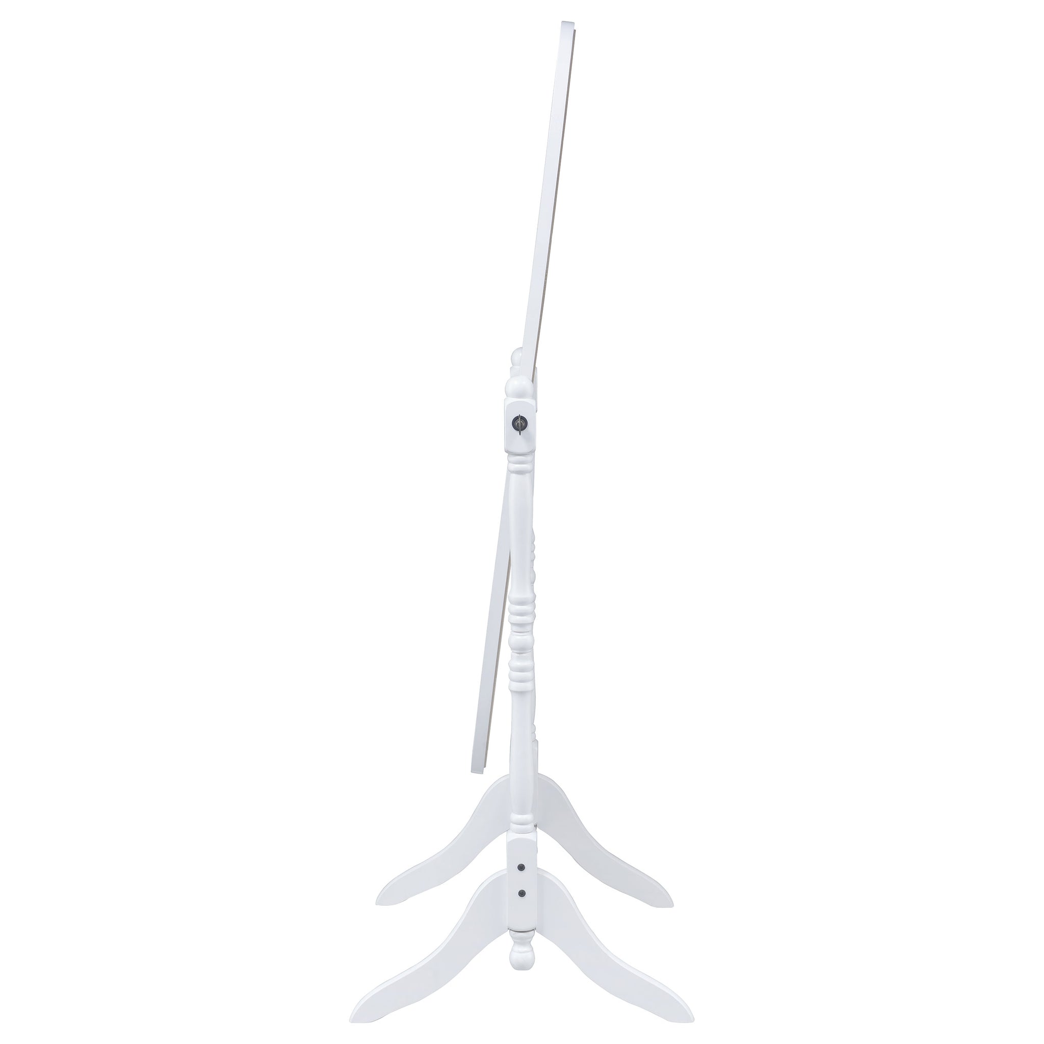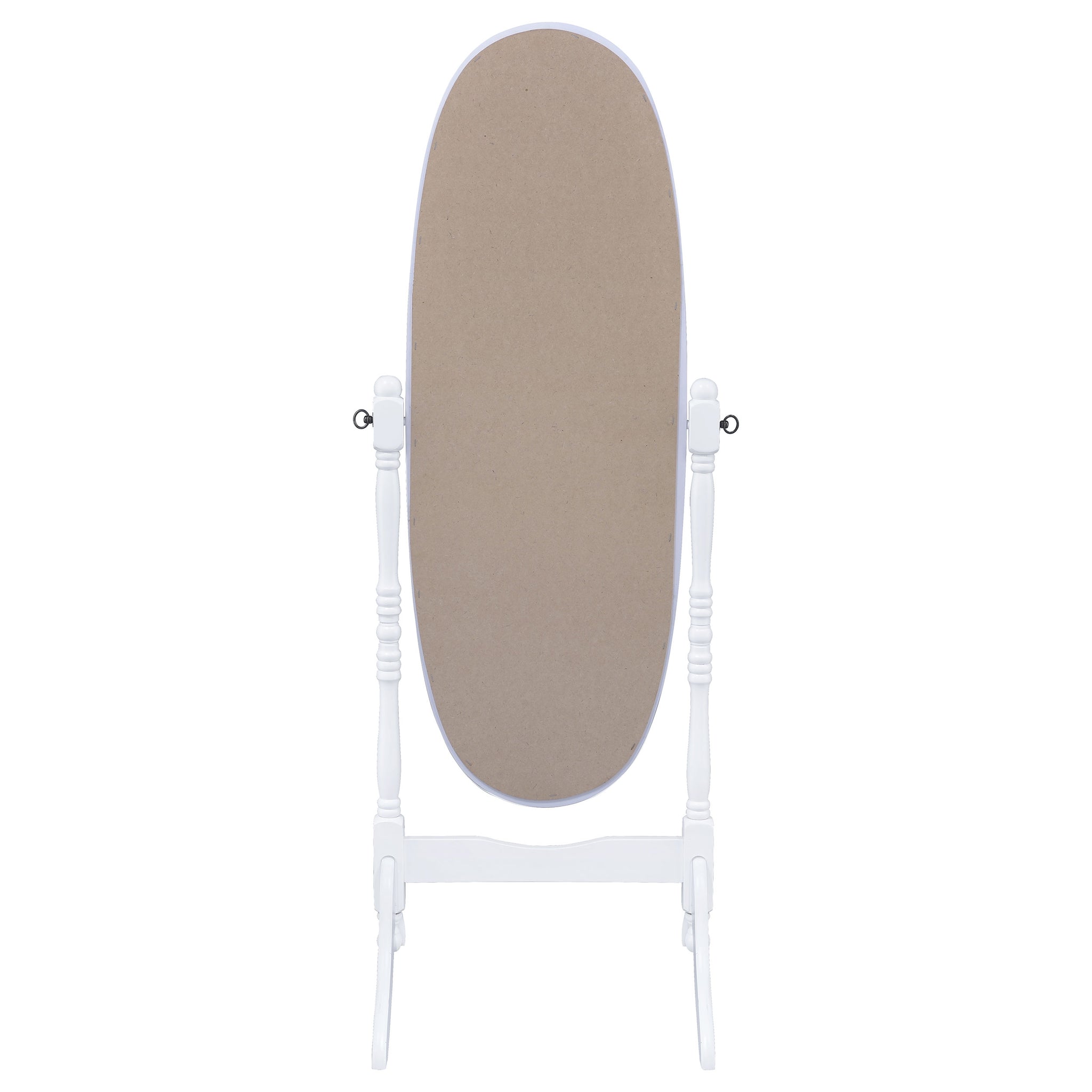 Traditional elegance with a functional twist. This cheval mirror delivers a charming look for a bedroom or dressing space. Full-length mirrored glass with a swivel base offers various viewing perspectives. A selection of lovely finishes blends beautifully in practically every setting. Charming curved legs adds a fresh, stylish look. Key Features: • Traditional oval cheval standing mirror feels like an heirloom piece • Oval wood frame on stand with turned posts • Clear mirror surface • Available in merlot, honey black, and white • Rubberwood construction