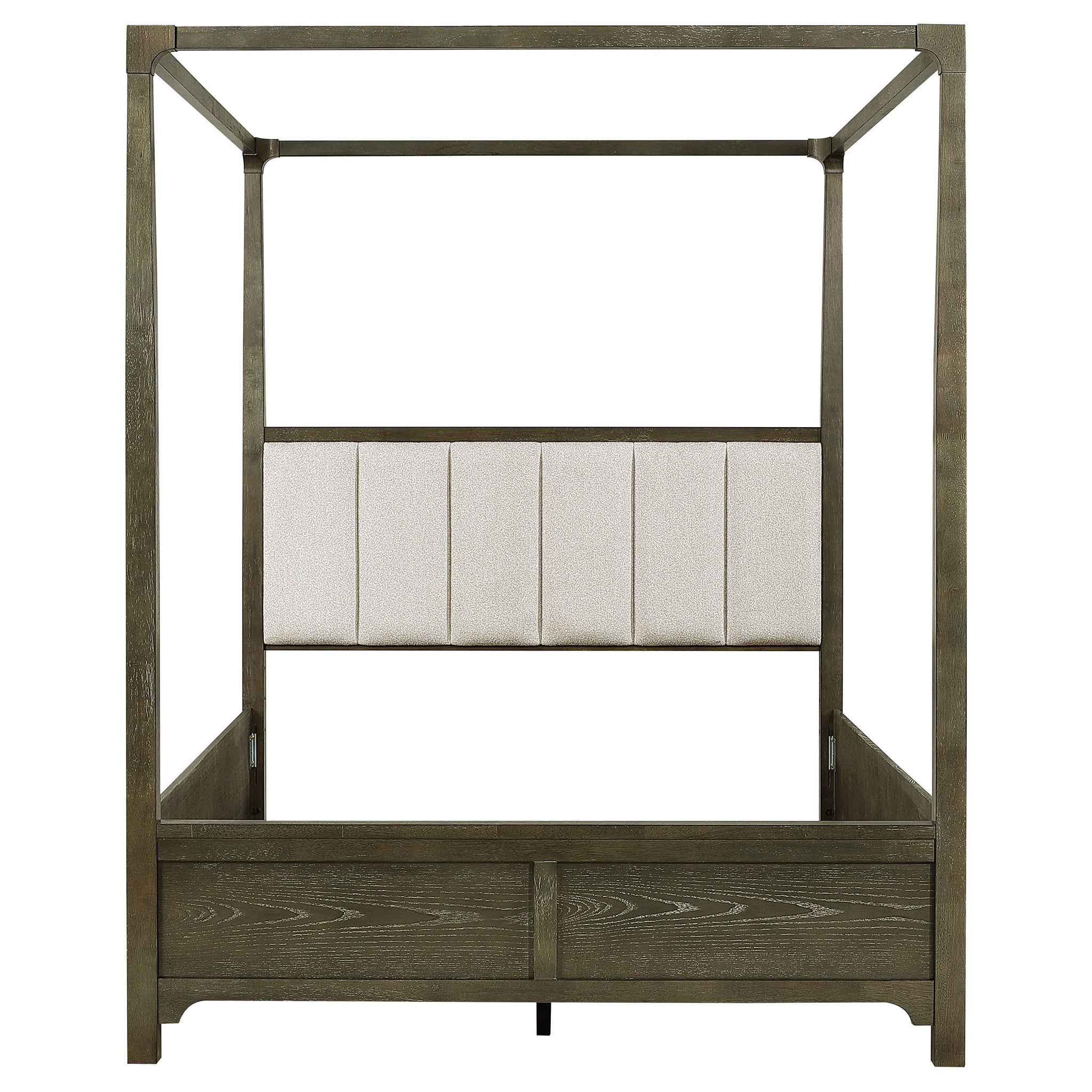 Transform your bedroom into a sophisticated retreat with this transitional canopy bed. Featuring rounded corners and trending design details, this bed offers a perfect blend of style and stability. The headboard is upholstered in textured beige fabric with vertical channeling, adding a touch of elegance. Finished in dark cocoa, the bed is crafted from solid hardwood and ash veneer, ensuring durability and a timeless look. Enjoy the luxurious feel and refined aesthetic of this beautifully designed canopy bed. Key Features: • Transitional queen canopy bed with rounded corners and trending design details • Textured beige fabric headboard with vertical channeling • Dark cocoa finish for a sophisticated look • Crafted from solid hardwood and ash veneer for durability • Available in queen, eastern king, and California king sizes