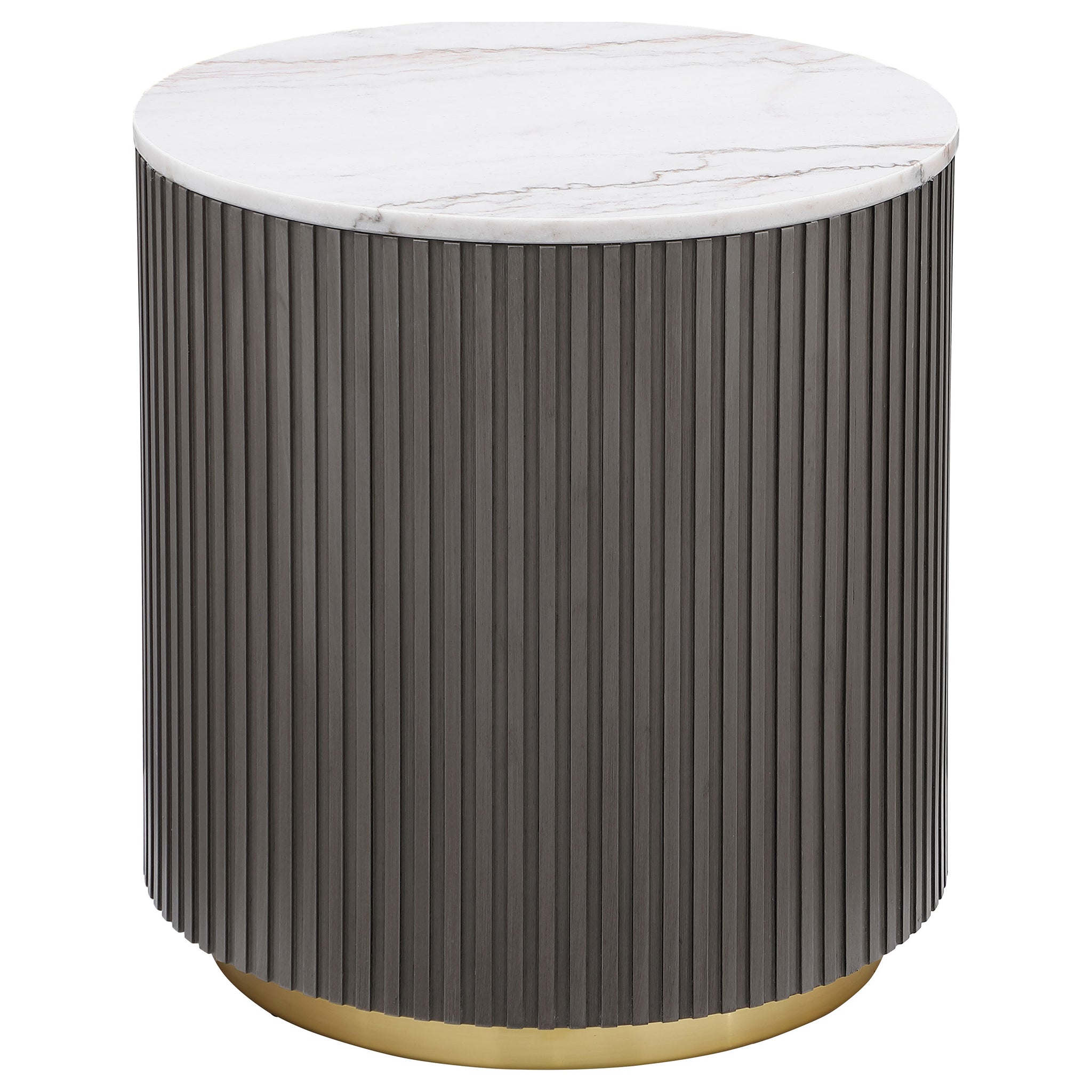 This elegant coffee table set features a modern round coffee table and end table with a genuine white marble tops. The engineered wood frame in a charcoal finish is accented by ribbed detailing, offering a textured and contemporary look. Each table sits on a brushed gold metal base that adds a touch of luxury. The set's refined materials and sleek design make it a perfect addition to any living room, creating a balanced atmosphere of sophistication and style. Key Features: • Coffee table set with round design, featuring genuine white marble tops • Ribbed engineered wood frames in a charcoal finish add texture and depth • Brushed gold metal bases provide stability and luxurious appeal • Subtle veining in the marble surfaces enhances sophistication • Durable engineered wood frames offer lasting strength and support • Versatile set complements various living room styles with elegance