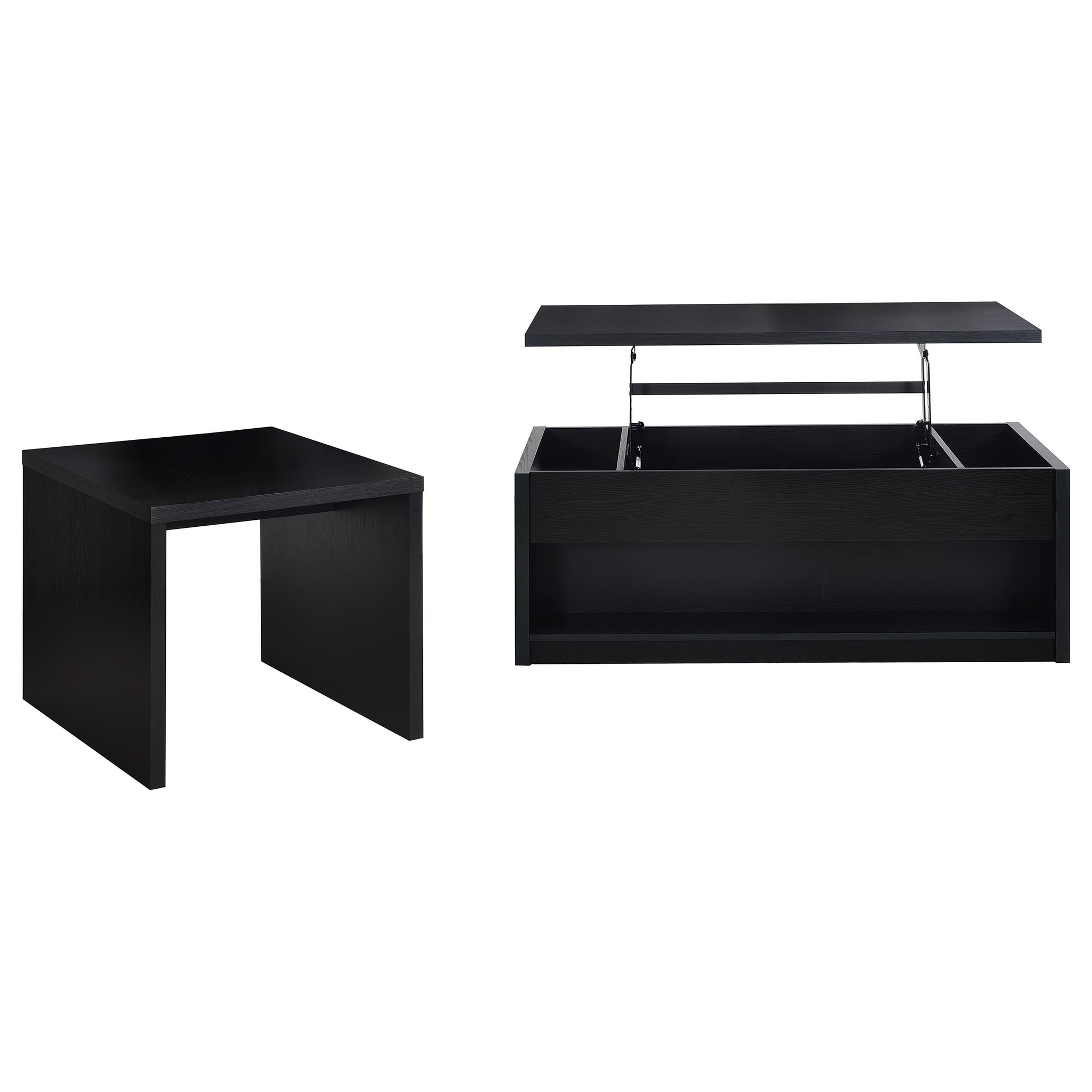 The coffee table set blends modern design with versatile functionality, perfect for contemporary living spaces. The lift-top coffee table features a hidden storage compartment, spacious drawers, and a durable engineered wood construction with a scratch-resistant black laminate veneer. Paired with the sleek end table, this set offers style and practicality, complementing any décor while providing ample storage and surface space for daily needs. Key Features: • Coffee table set combines sleek black finishes with modern functionality for versatile use • Lift-top coffee table offers a flexible surface for working, dining, or casual activities • Hidden storage compartment and spacious drawers provide ample room for daily essentials • Durable engineered wood construction ensures strength and long-lasting reliability • Scratch-resistant laminate veneer adds a stylish and durable protective finish • Minimalist, clean design complements contemporary and transitional interior styles