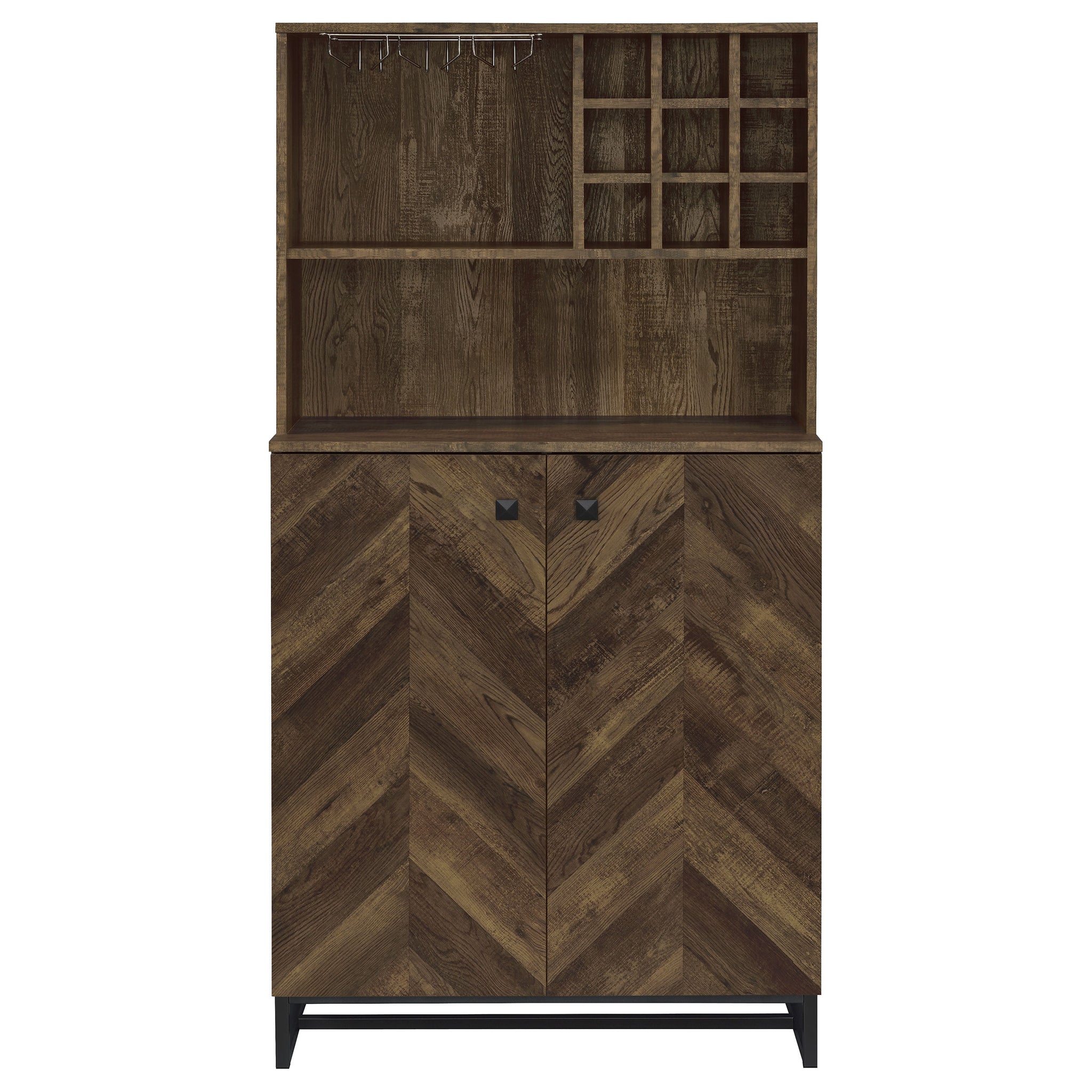 This rustic bar cabinet features a striking herringbone pattern and a warm oak finish, perfect for enhancing any living or dining space. With ample bottle and stemware storage, it offers function and flair in equal measure. The mixed material construction and clean lines bring modern charm to your home entertaining setup. Key Features: • Transitional bar cabinet with classic herringbone front for timeless appeal • Finished in a rich rustic oak tone that complements modern and vintage décor • Built-in wine rack stores up to nine bottles within easy reach • Integrated stemware rack and upper cubbies offer display and storage options • Crafted from engineered wood with a durable, scratch-resistant veneer • Sleek gunmetal legs and hardware add industrial edge to its design