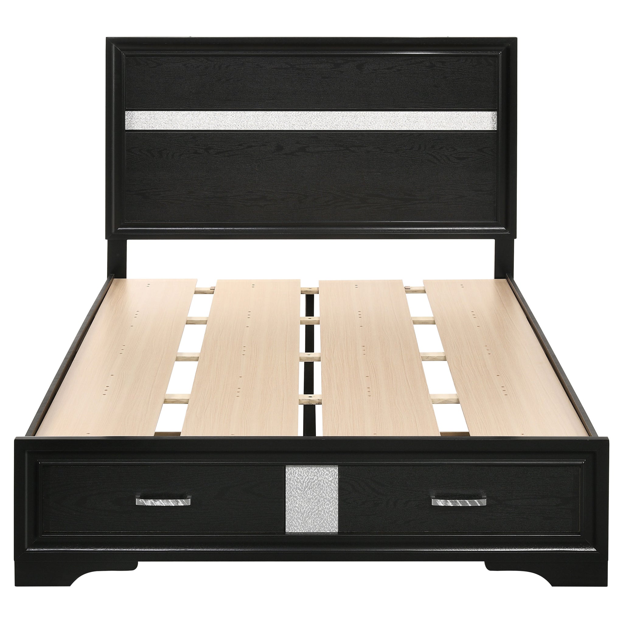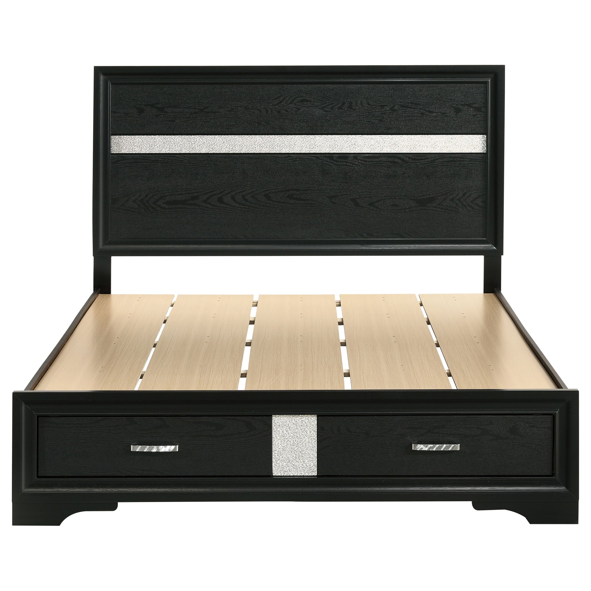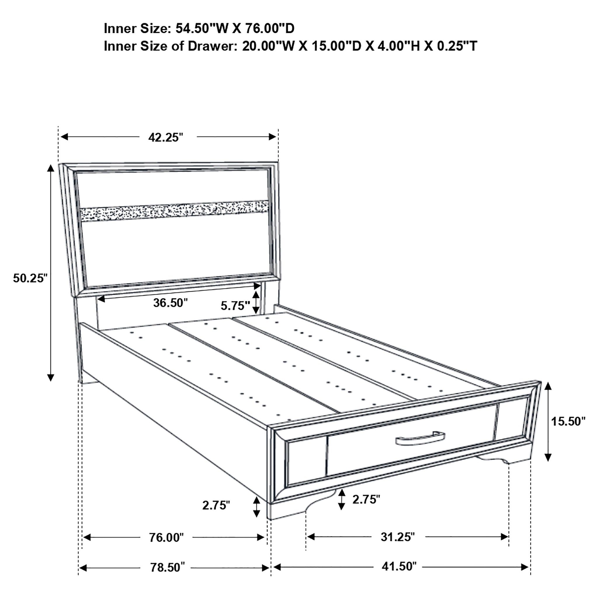 This alluring bed from the Miranda collection has both fashion and function. It features crisp lines and a headboard that's as simple as it is impressive. The footboard is built with two roomy drawers to hold extra sheets and blankets. The bed has an effortless timelessness and elegance. Add to the bedroom for a charming ambiance that's sure to please. Key Features: • Storage panel bed with integrated drawers in footboard design • Fully slatted platform eliminates need for separate foundation • Crystal-accent drawer pulls enhance the glamorous styling • Glitter trim accent at headboard and footboard adds visual interest • Bracket-style feet and beveled framing for a classic profile • Crafted with engineered wood in a bright white laminate finish