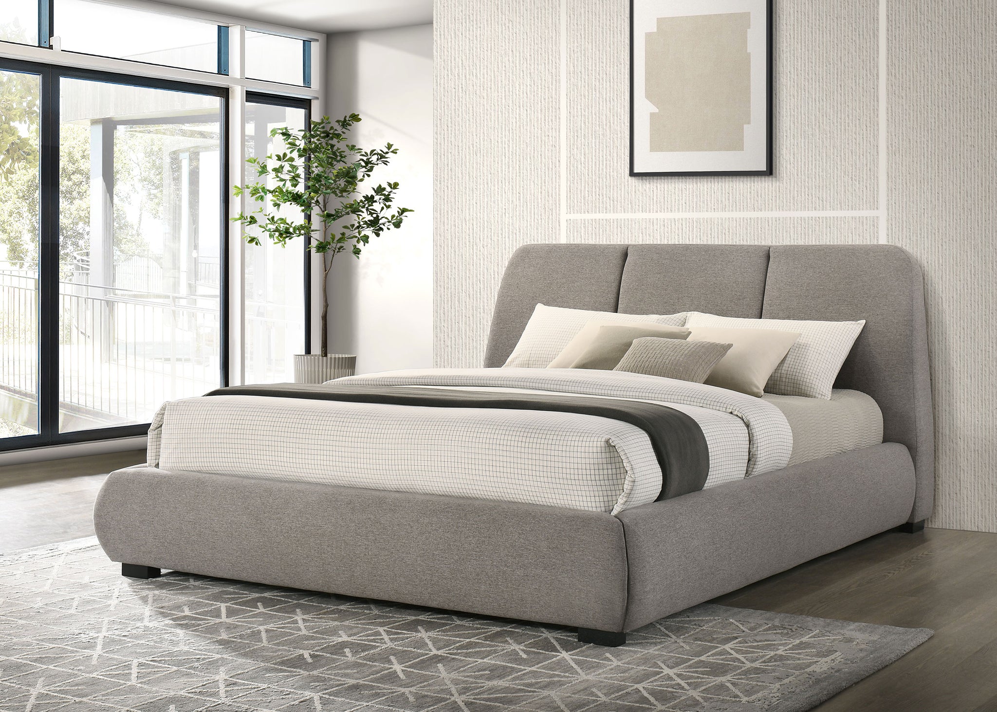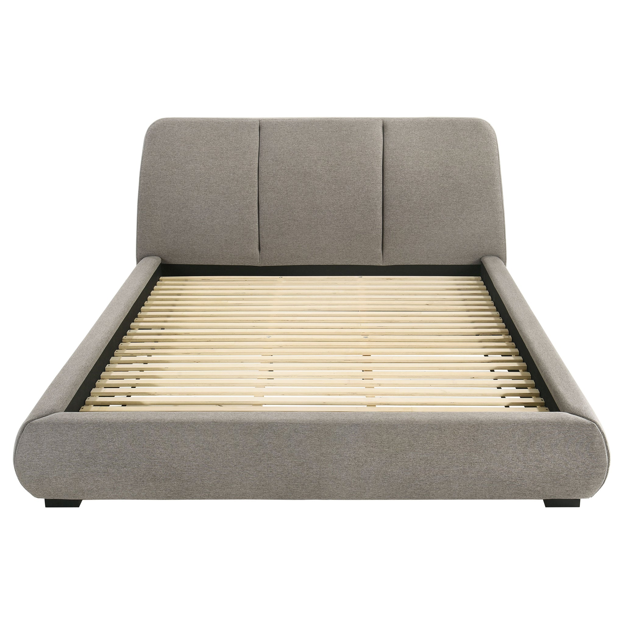 Softly sculpted and thoughtfully tailored, this upholstered platform bed brings a quiet elegance to modern sleep spaces. Its curved silhouette flows from a gently flared headboard to rounded side rails, offering a sense of movement and ease. Three stitched panels add subtle dimension, while the built-in slat system provides durable mattress support without the need for a foundation. Crafted from solid and engineered wood, it balances sculptural form with everyday comfort. Key Features: • Queen platform bed with curved lines and stitched headboard for soft modern design • Taupe fabric upholstery offers warm texture with a clean, neutral visual tone • Sculpted frame flows from the rounded headboard to the low-profile foot rails • Slatted base eliminates the need for a foundation or box spring beneath mattress • Crafted from solid wood, engineered wood, foam, and upholstered in soft fabric • Perfect for modern bedrooms seeking balance between form, texture, and function