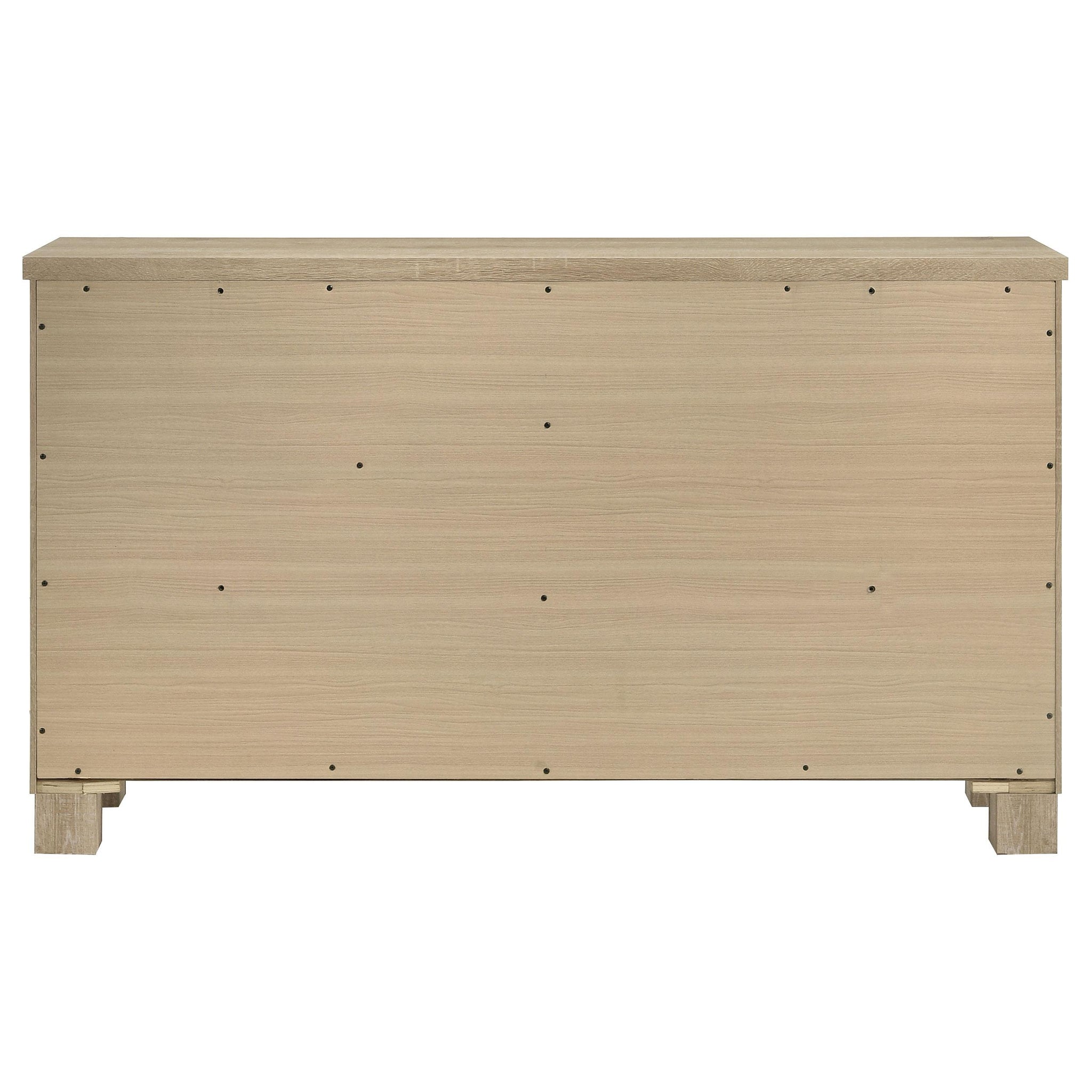 This six-drawer dresser offers a stylish blend of rustic charm and modern practicality. Featuring a weathered oak finish, it is crafted from engineered wood with a scratch-resistant veneer for long-lasting durability. Dark bronze handles provide bold contrast, while the smooth-gliding drawers offer ample space for clothing and essentials. Designed to bring warmth and elegance to your bedroom, its clean lines and generous storage make it a functional and decorative focal point for rustic or transitional interiors. Key Features: • Six-drawer dresser with smooth-glide drawers for effortless use • Weathered oak finish highlights natural grain with rustic elegance • Engineered wood construction with a durable scratch-resistant veneer • Dark bronze handles add a touch of modern sophistication • Spacious design offers ample room for clothing and accessories • Perfectly balances functional storage with transitional aesthetics