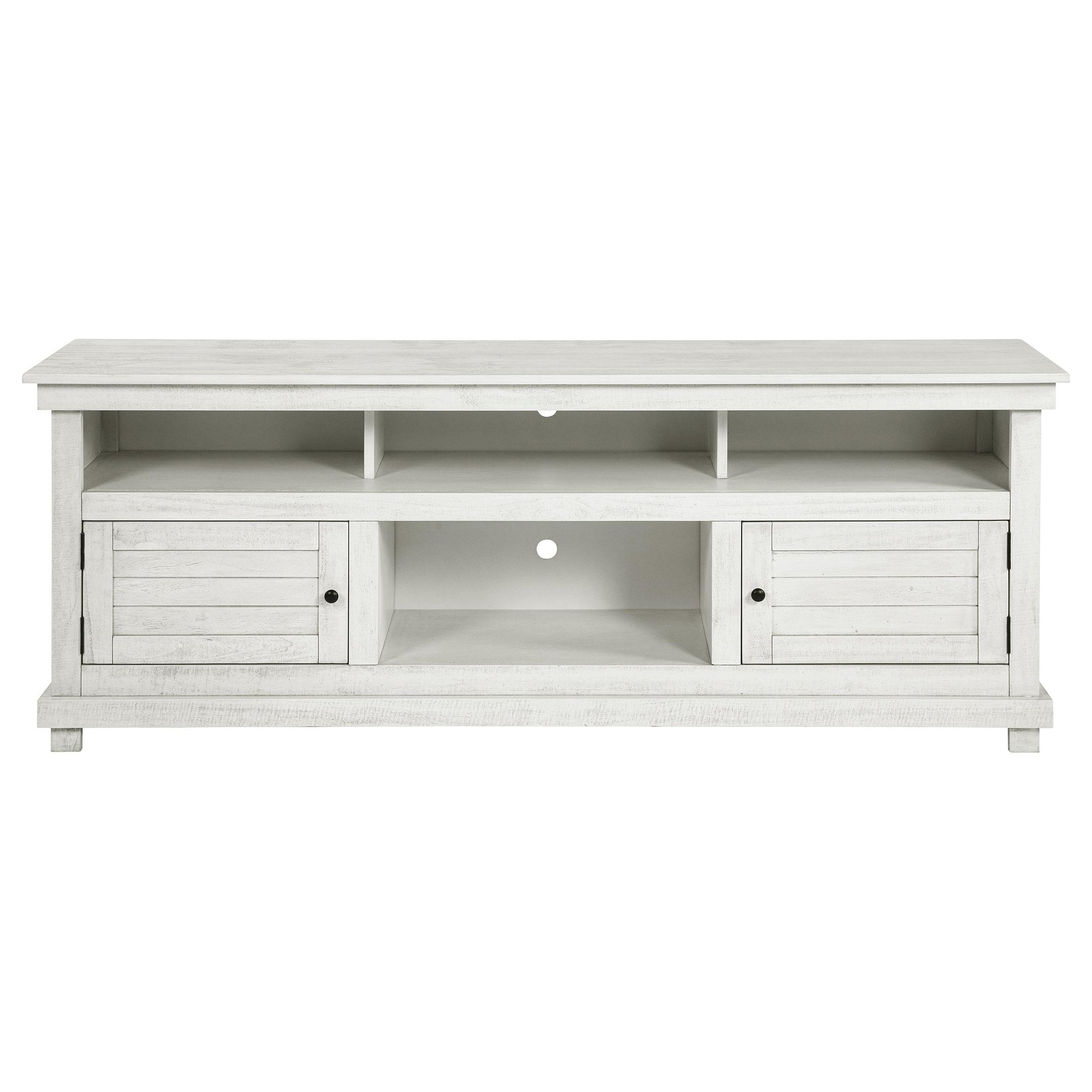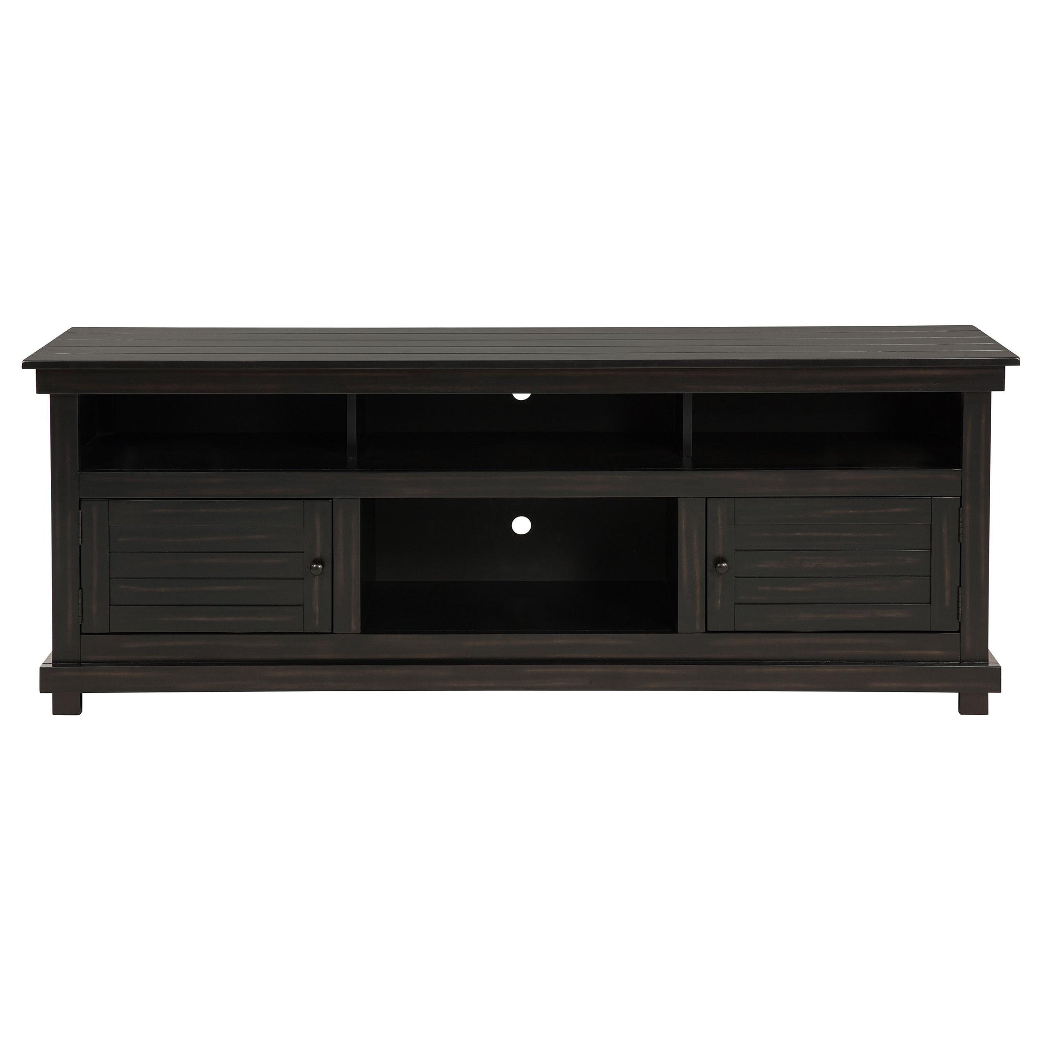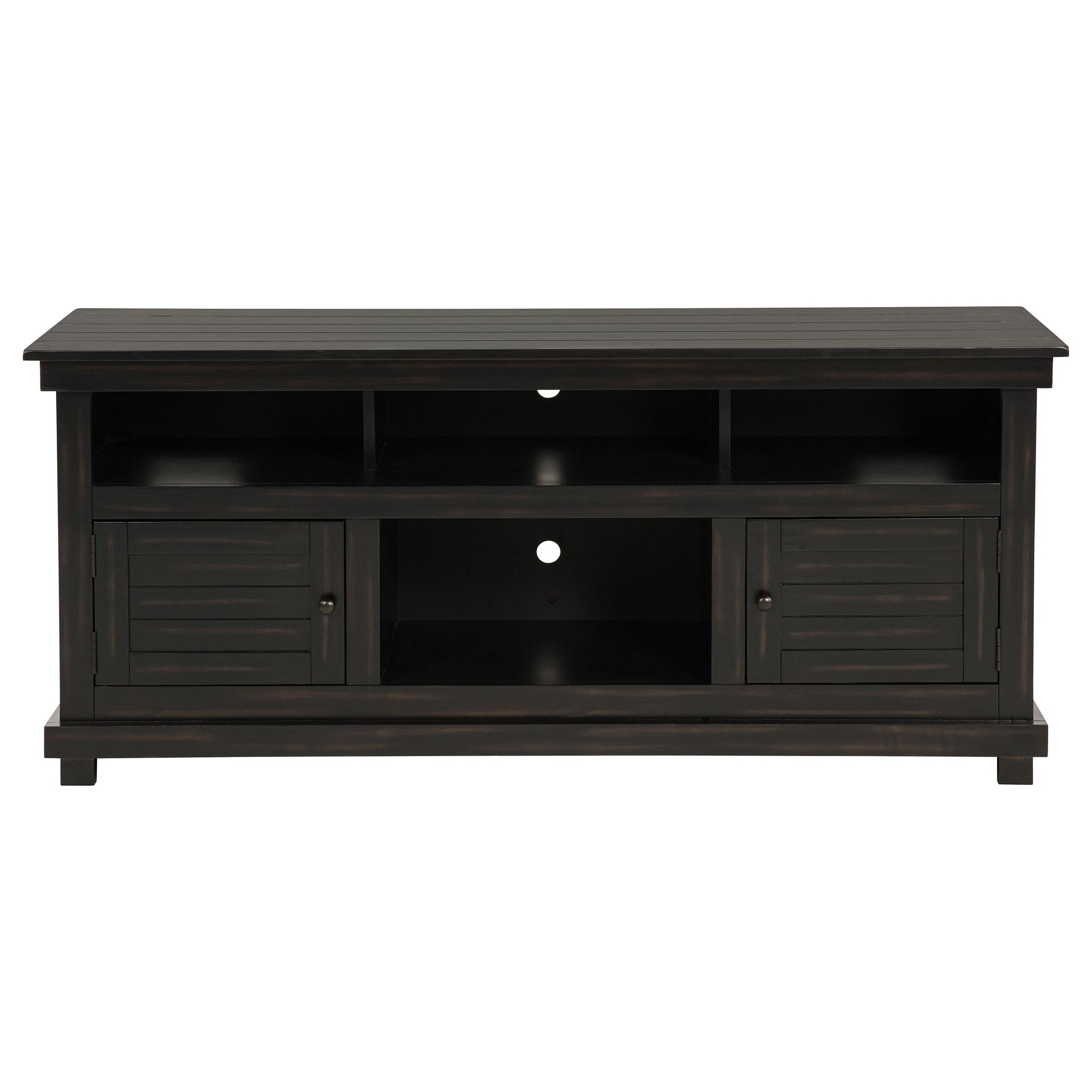 Complete a media center in your inviting home with a modern farmhouse TV stand. It's an approachable design with roughhewn wood details that create texture and dimensionality in your living space. Two shelves and six compartments create ample storage, perfect for everything from peripherals and accessories to personal decor. The media console features a clean-lined silhouette with a slim profile, perfect for a flat panel or wall-mounted television. This TV stand accommodates televisions up to 65 inches. Key Features: • Roughhewn wood markings add artisan character to a modern farmhouse TV stand • A distressed finish lends casual farmhouse character in your den or living room • Two open shelves provide space for media and gaming peripherals and decor • Six compartments storage that's perfect for accessories and media like games and controllers • A slim, straight-lined silhouette supports a flat panel television up to 65 inches