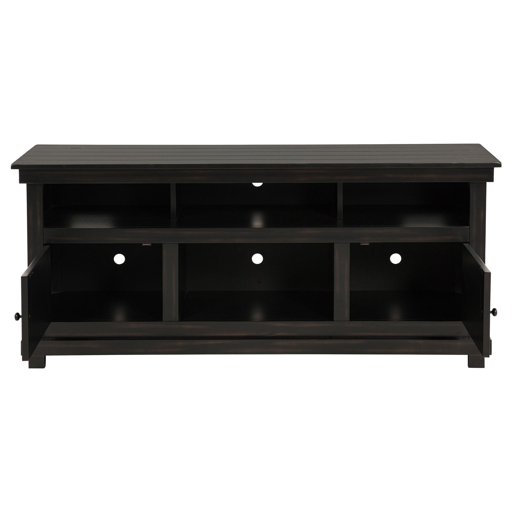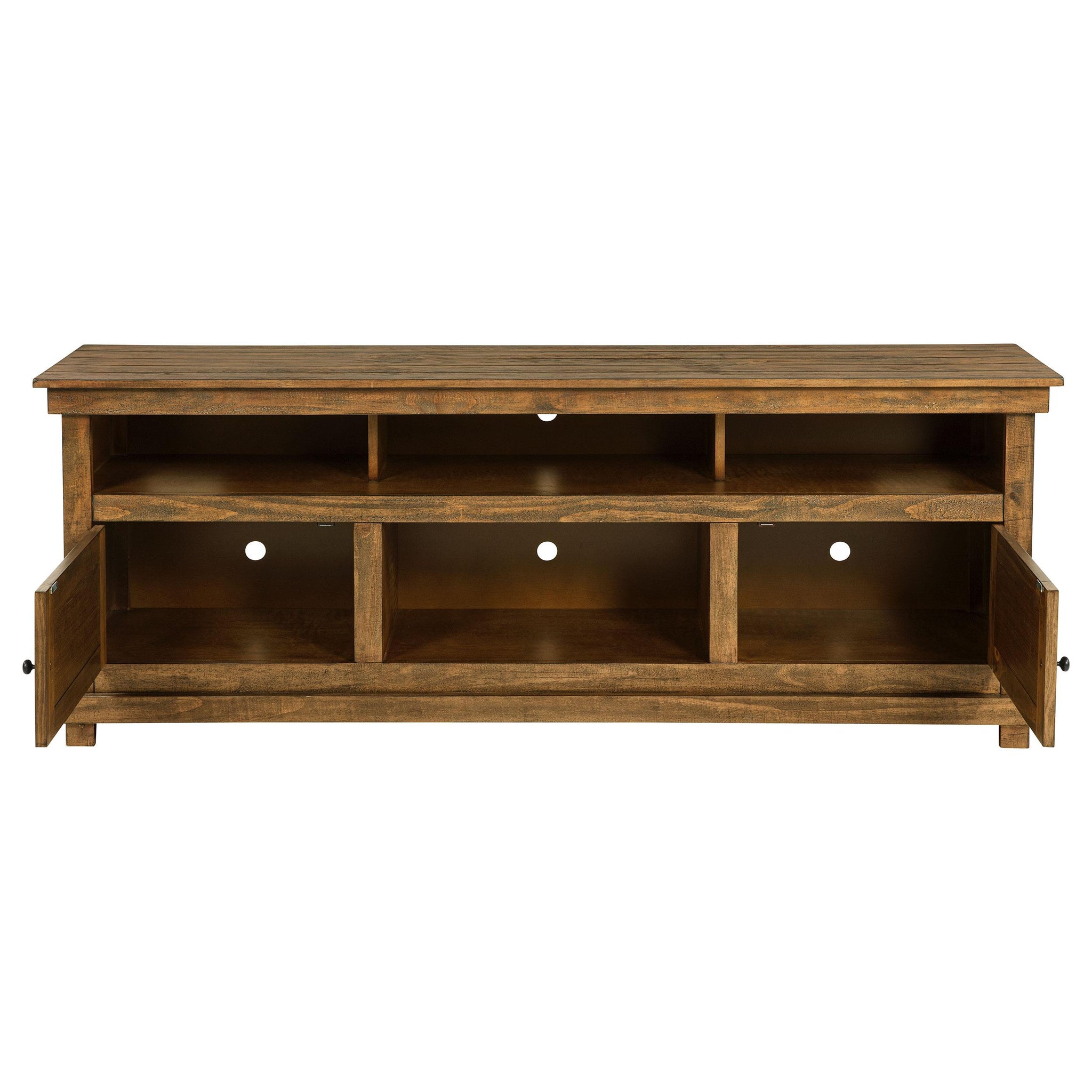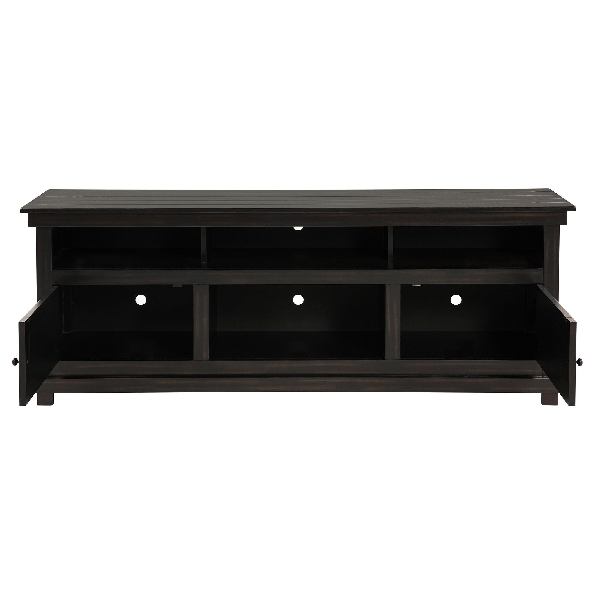 Complete a media center in your inviting home with a modern farmhouse TV stand. It's an approachable design with roughhewn wood details that create texture and dimensionality in your living space. Two shelves and six compartments create ample storage, perfect for everything from peripherals and accessories to personal decor. The media console features a clean-lined silhouette with a slim profile, perfect for a flat panel or wall-mounted television. This TV stand accommodates televisions up to 65 inches. Key Features: • Roughhewn wood markings add artisan character to a modern farmhouse TV stand • A distressed finish lends casual farmhouse character in your den or living room • Two open shelves provide space for media and gaming peripherals and decor • Six compartments storage that's perfect for accessories and media like games and controllers • A slim, straight-lined silhouette supports a flat panel television up to 65 inches
