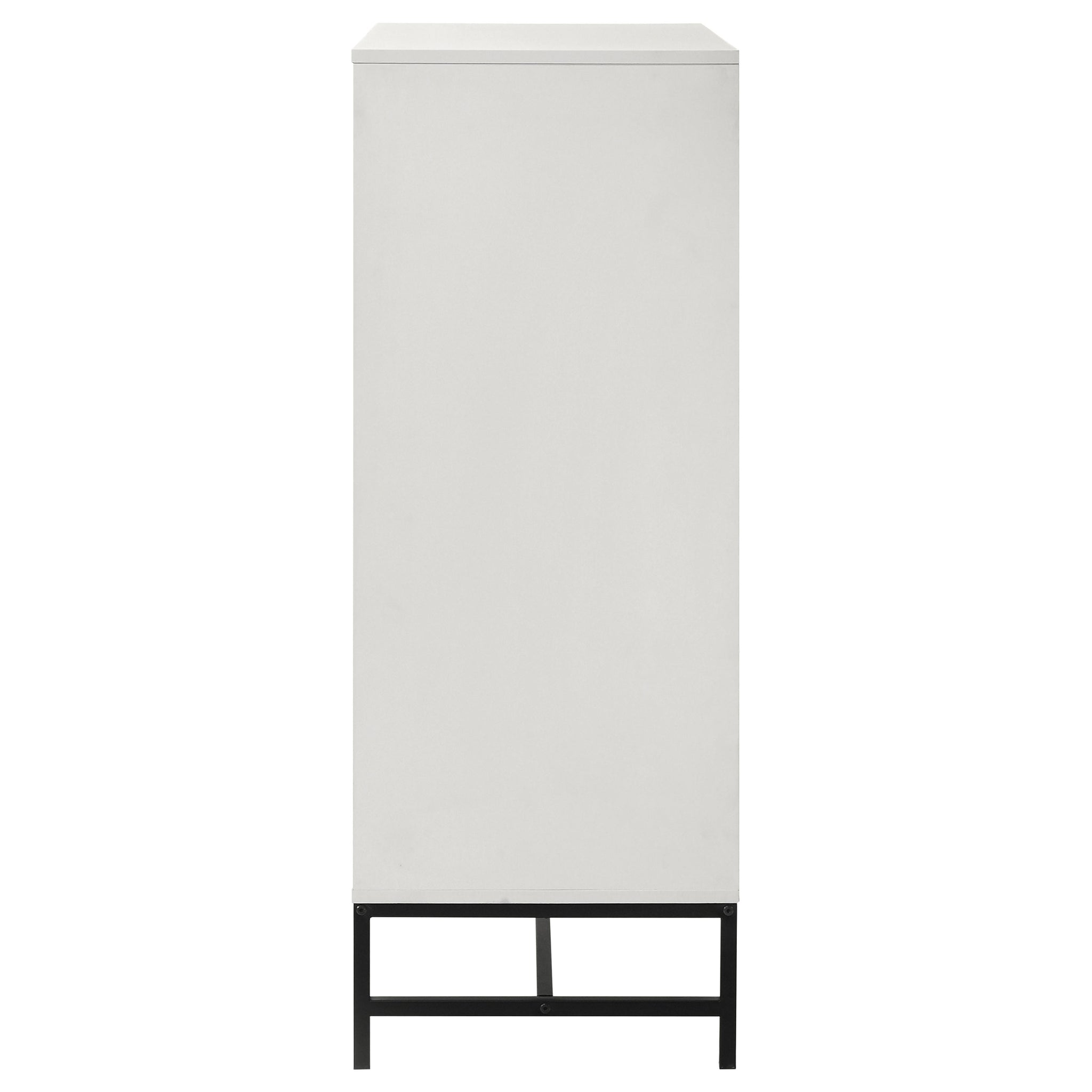 Create ample storage with the compact footprint of a modern four-drawer chest. Its roomy drawers are ideal for clothing, linens, and accessories, helping to keep your personal space tidy and organized. A white finish complements straight, clean lines, while black hardware adds contrast and depth. complementary metal base in black adds light, airy ambiance. Use the top for decor like photos, or add a jewelry box for a personal touch. Key Features: • A modern four-drawer chest features a sleek silhouettes and bold contrasting elements • White finish is crisp and bright, offering modern appeal and an open, airy feel • Black accents and hardware create a sense of depth and contrast in a contemporary bedroom • Four drawers provide plenty of space for clothing, linens, and other essentials • Drawers feature pin construction joinery and each has a generous 45-pound weight limit