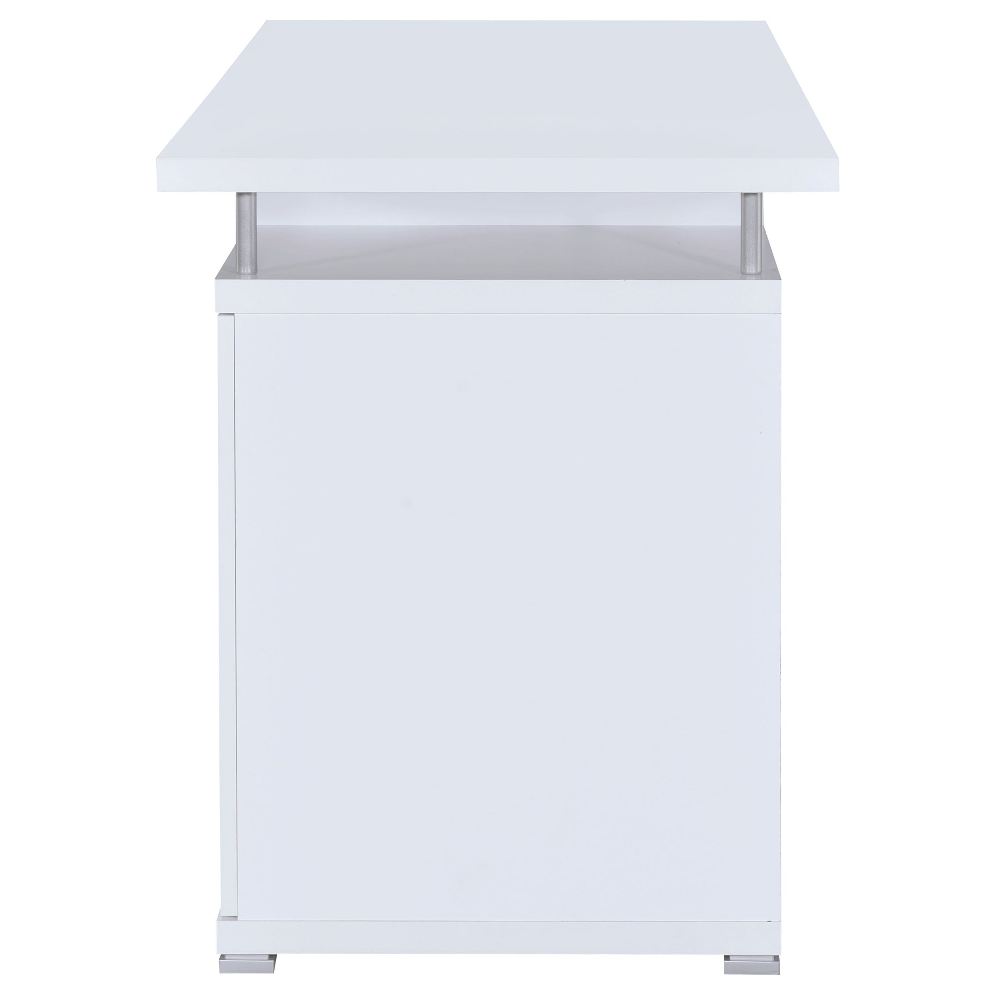 Upgrade your home office with sleek style and fabulous functionality. This handsome office desk has everything you need to be productive. Its large cabinet features an adjustable shelf for convenient storage. It includes a large file cabinet that fits legal and letter size files, as well as a smaller top drawer and keyboard tray. With a deep, rich finish of cappuccino, this desk is a stylish addition to any office. Key Features: • Office desk with cappuccino finish and modern rectangular work surface • Two drawers include a utility drawer and a file drawer for organized storage • Right-side cabinet with adjustable shelf provides versatile enclosed storage • Slide-out keyboard tray preserves desktop space and improves workflow • Silver-finished hardware and metal risers create a clean, professional look • Crafted from engineered wood, melamine paper, and honeycomb board layers