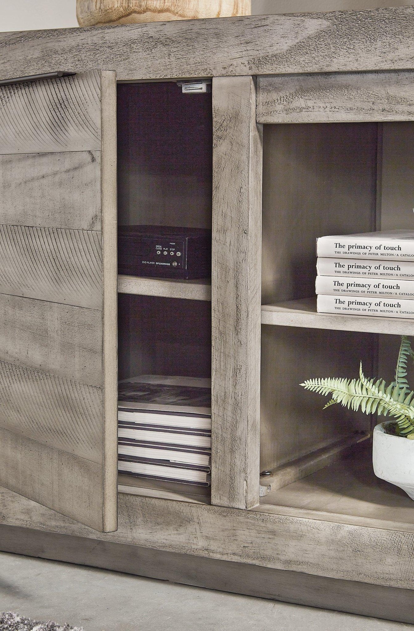 - Weathered light gray finish
