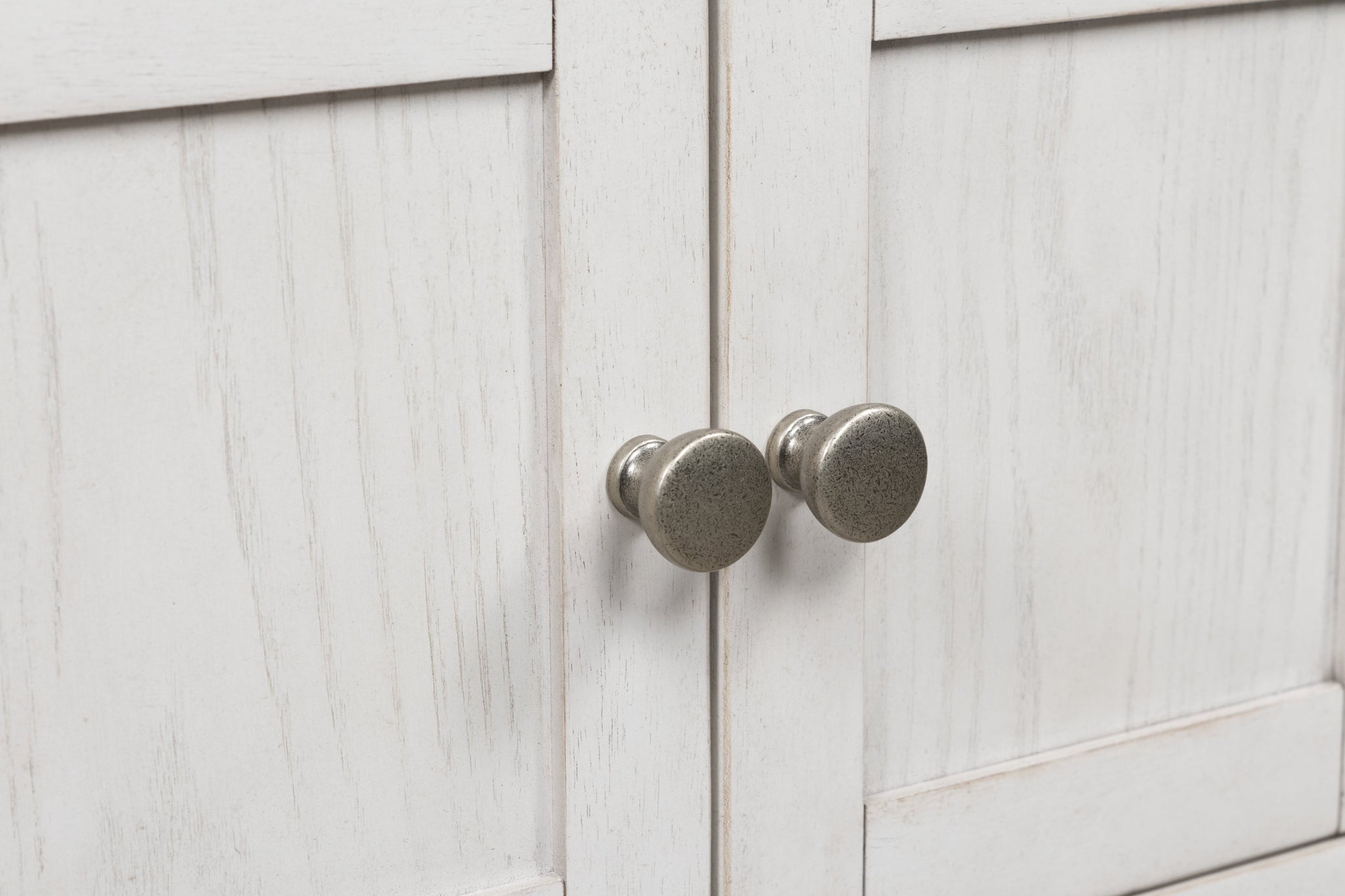 - Antiqued white finish with wood grain texture