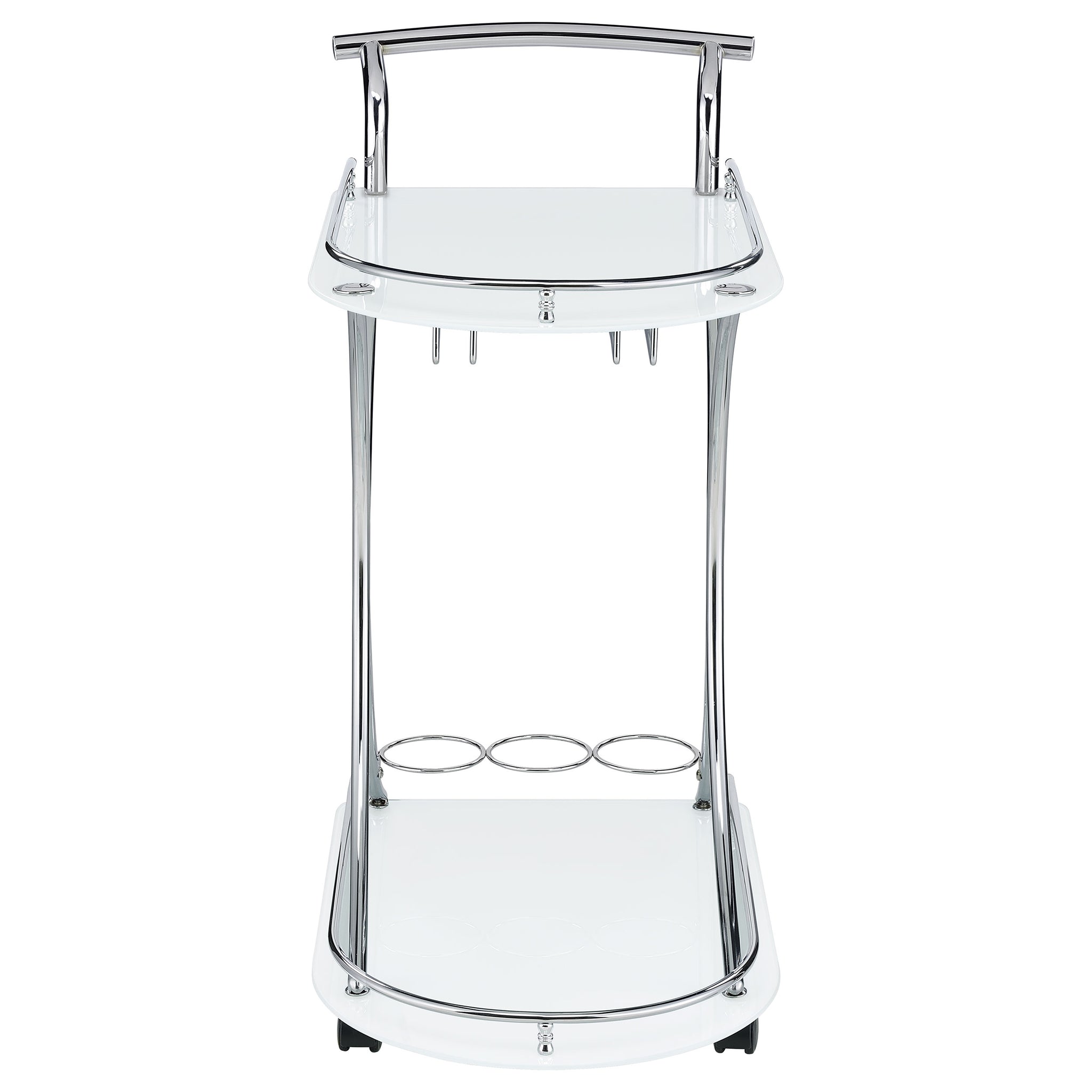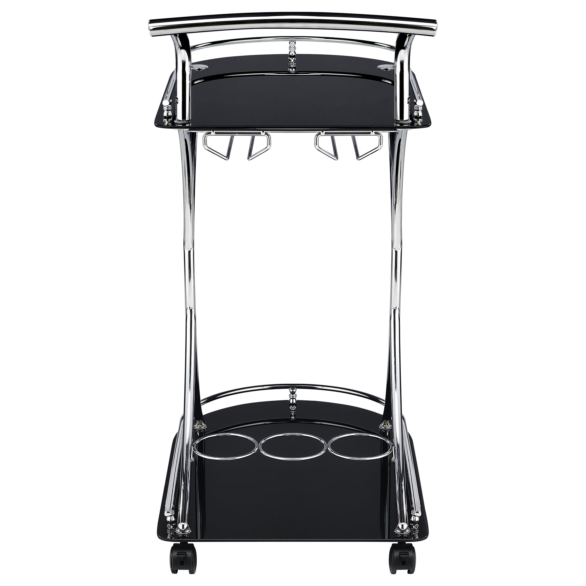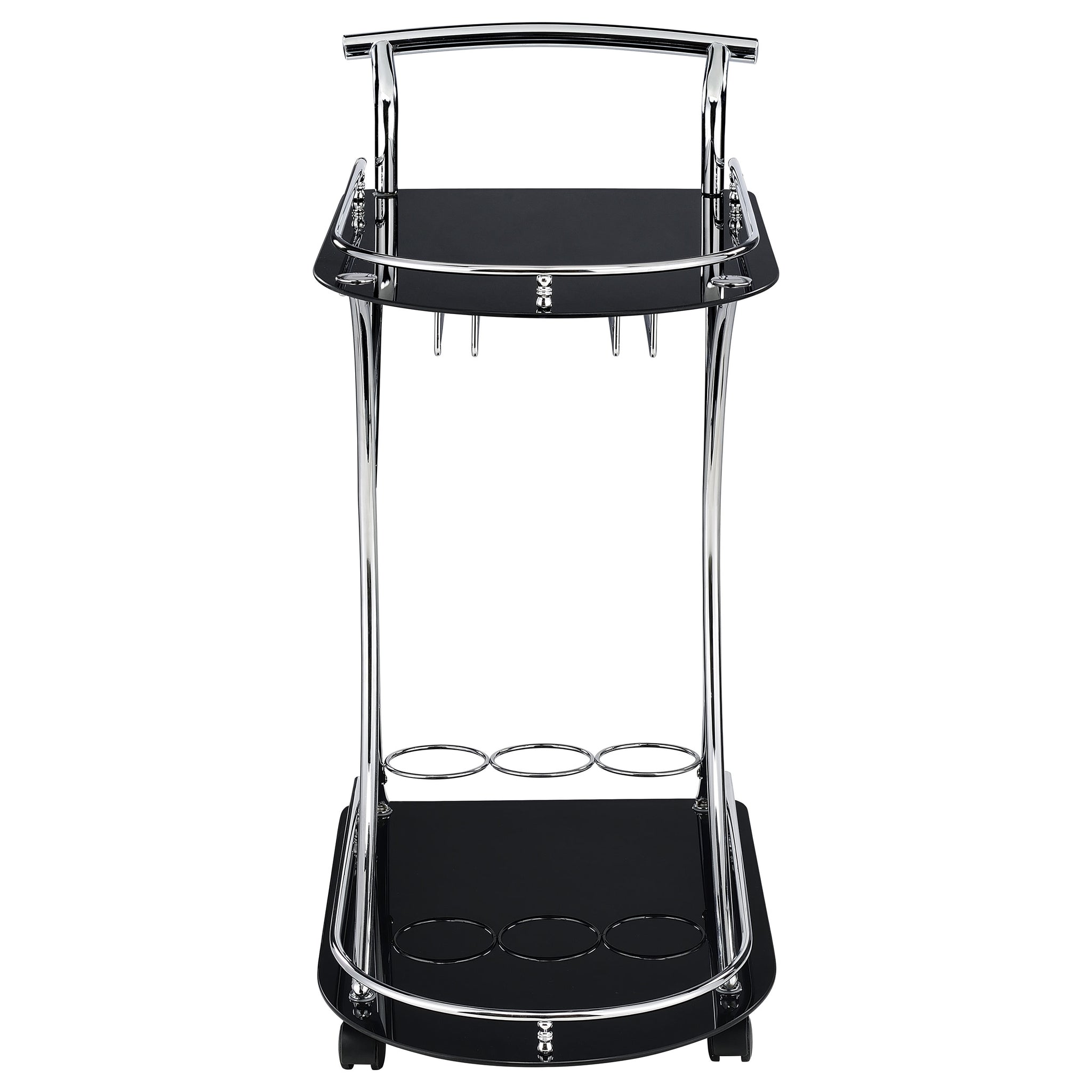 Recapture mid-century elegance with an enticing function. Slender construction elements form a graceful look in this mobile serving cart and add a lovely accent piece that's also useful for entertaining. Sleek black glass serves as a top and bottom shelf, contributing to an upscale flavor. Chrome finish metal accents round out a luscious palette. Serve and store with a pair of wine bottle holders and a stemware rack. Key Features: • Two-tier bar cart with black tempered glass shelves and chrome metal frame • Curved chrome silhouette creates sleek contrast against dark shelf surfaces • Integrated stemware rack and wine bottle holder keep essentials secure • Raised guardrails on each tier offer added safety while serving or moving • Smooth-rolling casters include locking function for stable placement • Crafted from steel and tempered glass for modern durability and style