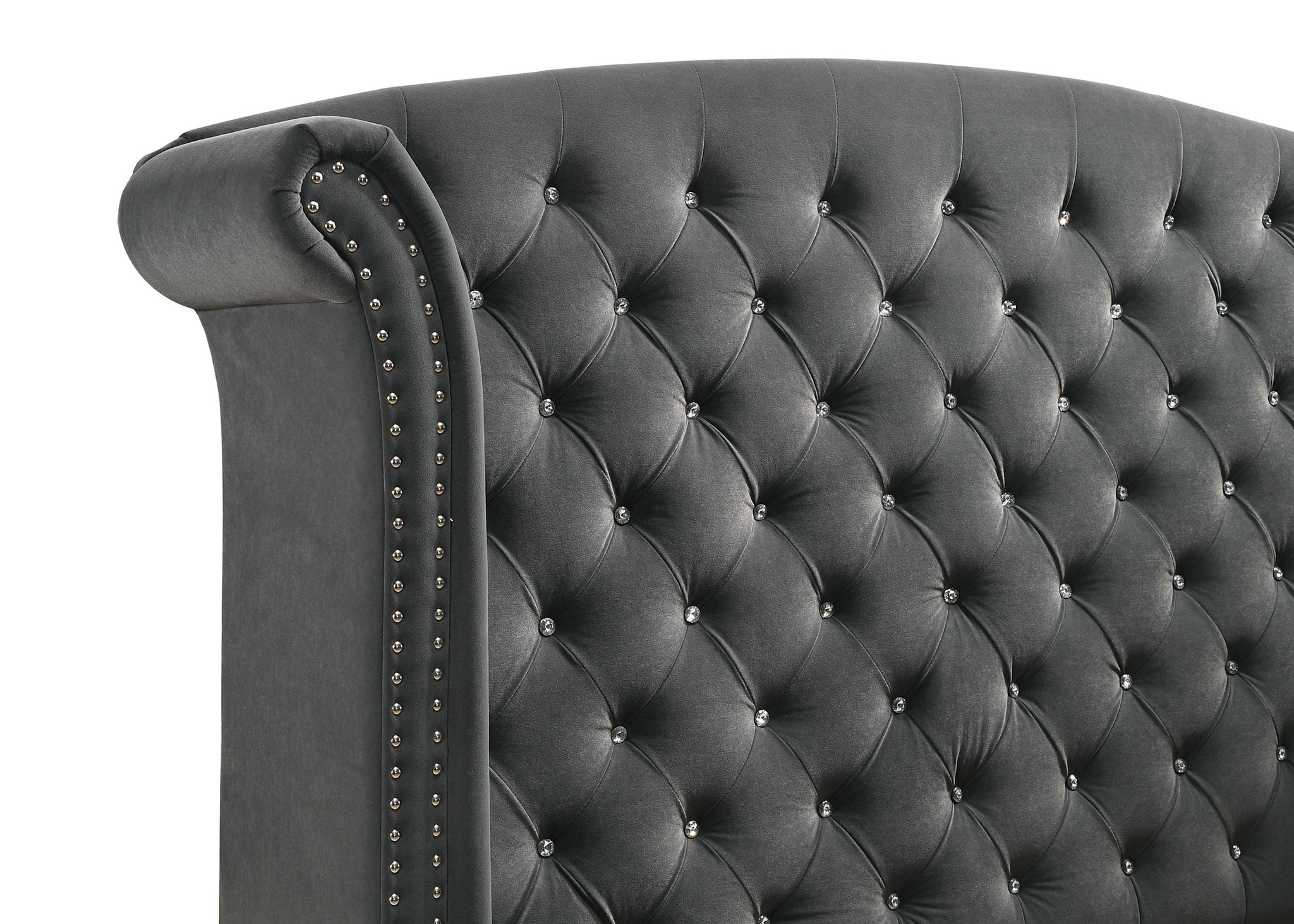Accent your sleeping space like never before with this four-piece bedroom set. A dramatically large wingback headboard towers over the bed to make a grand display, featuring button tufting and nail head trim. A matching dresser comes equipped with six spacious drawers with nail head trim around the frame, coordinating with the matching mirror. The two-drawer nightstand is a must-have for storing bedside essentials. All pieces are upholstered in a luxurious velvet fabric. Key Features: • Bedroom set includes tufted bed and coordinating velvet-upholstered storage • Wingback headboard features button tufting, nailhead trim, and plush shape • Storage pieces trimmed with chrome studs and topped with crystal handles • Drawer interiors lined and supported by smooth operating glides • Chrome metal feet unify the contemporary glam design across all items • Crafted from MDF, LVL, matte velvet, foam, and crystal-accented hardware