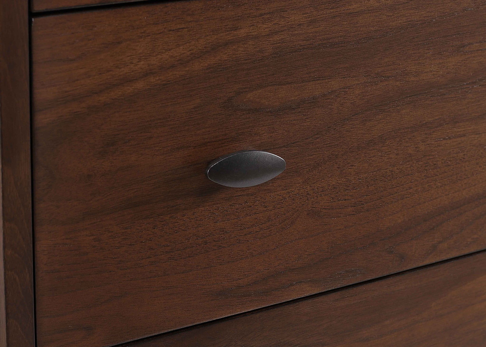 Transform your bedroom into the ultimate retreat with this mid-century modern bedroom set. Expertly crafted from pine, engineered wood, and walnut veneer, the set includes a bed, nightstand, dresser, mirror, and optional chest for a cohesive look. Rounded edges, tapered legs, and square tufting lend a retro-inspired flair, while felt-lined top drawers in case pieces and dual USB ports in nightstand add practical convenience. This collection combines style and functionality for a truly luxurious bedroom experience. Key Features: • Mid-century modern bedroom set with a cohesive aesthetic • Rounded corners throughout add an updated, modern flair • Fabric upholstered bed with thick padding and square tufting • Nightstand includes dual USB ports for device charging • Felt-lined top drawers protect delicate items • Constructed with pine, engineered wood, and walnut veneer