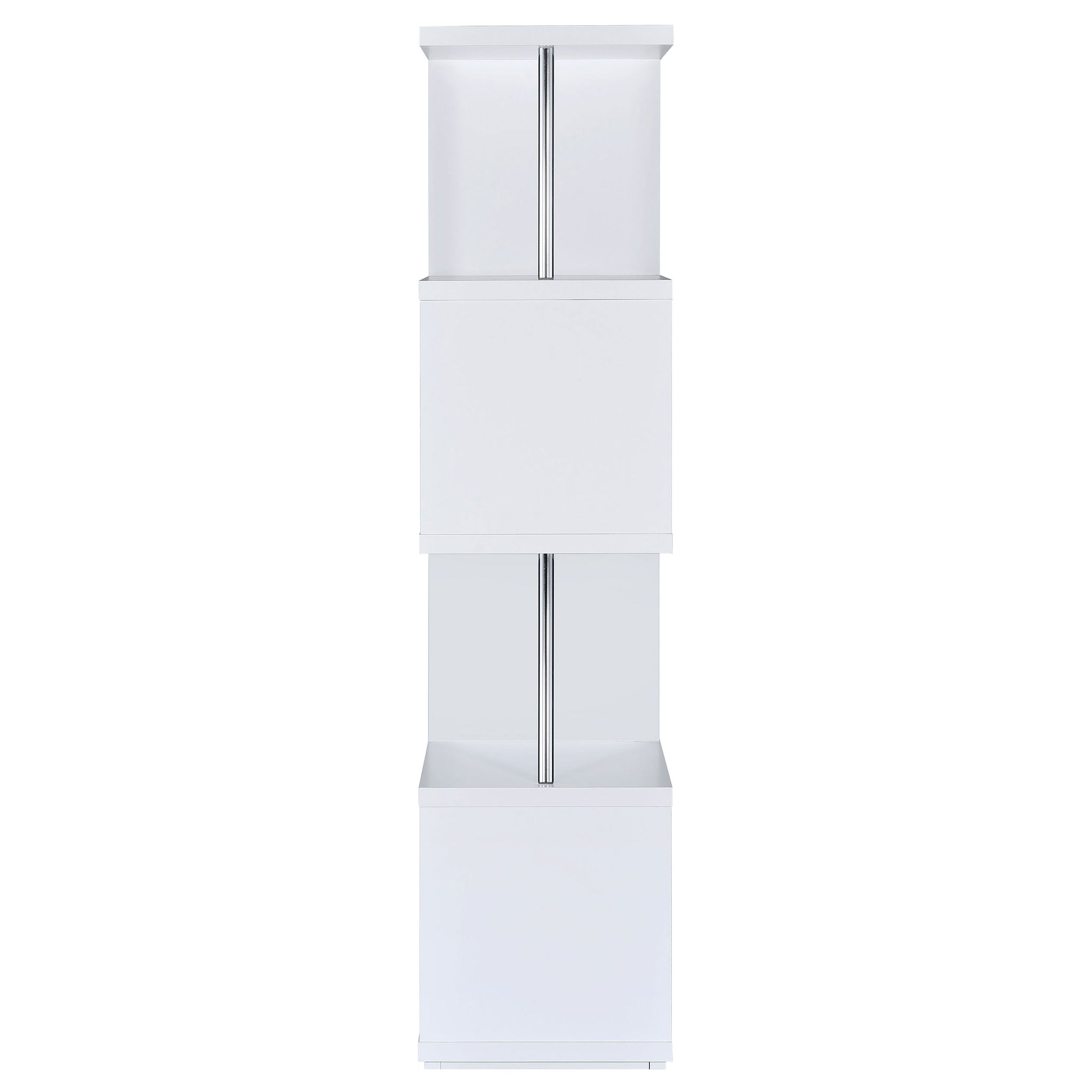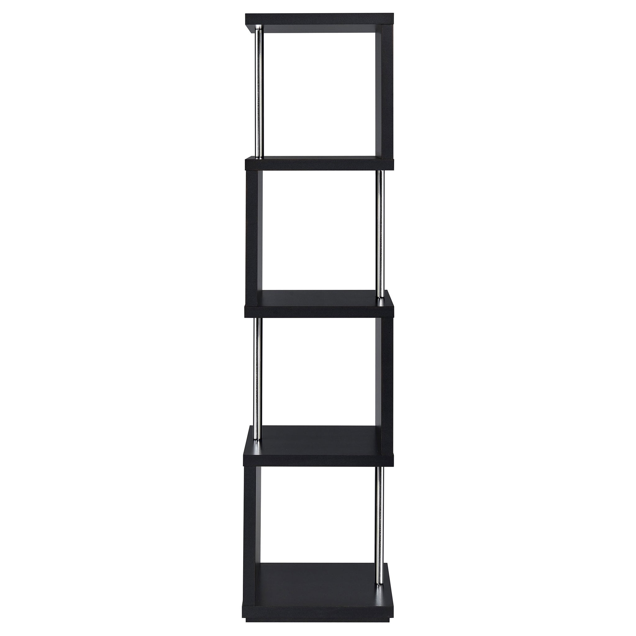 Go with the flow in a modern space with an edgy, artistic look. This four-tier bookcase is a great option for a compact space. Enjoy a modular, geometric silhouette and a choice of finishes. Steel supports reinforce shelving that hosts books and decor. Choose from finishes that intensify the attitude of your custom space. Key Features: • Modern cube-style bookshelf in black finish with chrome metal rod accents • Stacked four-tier open frame provides versatile shelf space • Engineered wood with laminate veneer ensures lasting performance • Electroplated chrome rods offer sleek, polished contrast • Ideal for displaying books, plants, or decorative objects • Tip-over restraint included for secure wall attachment