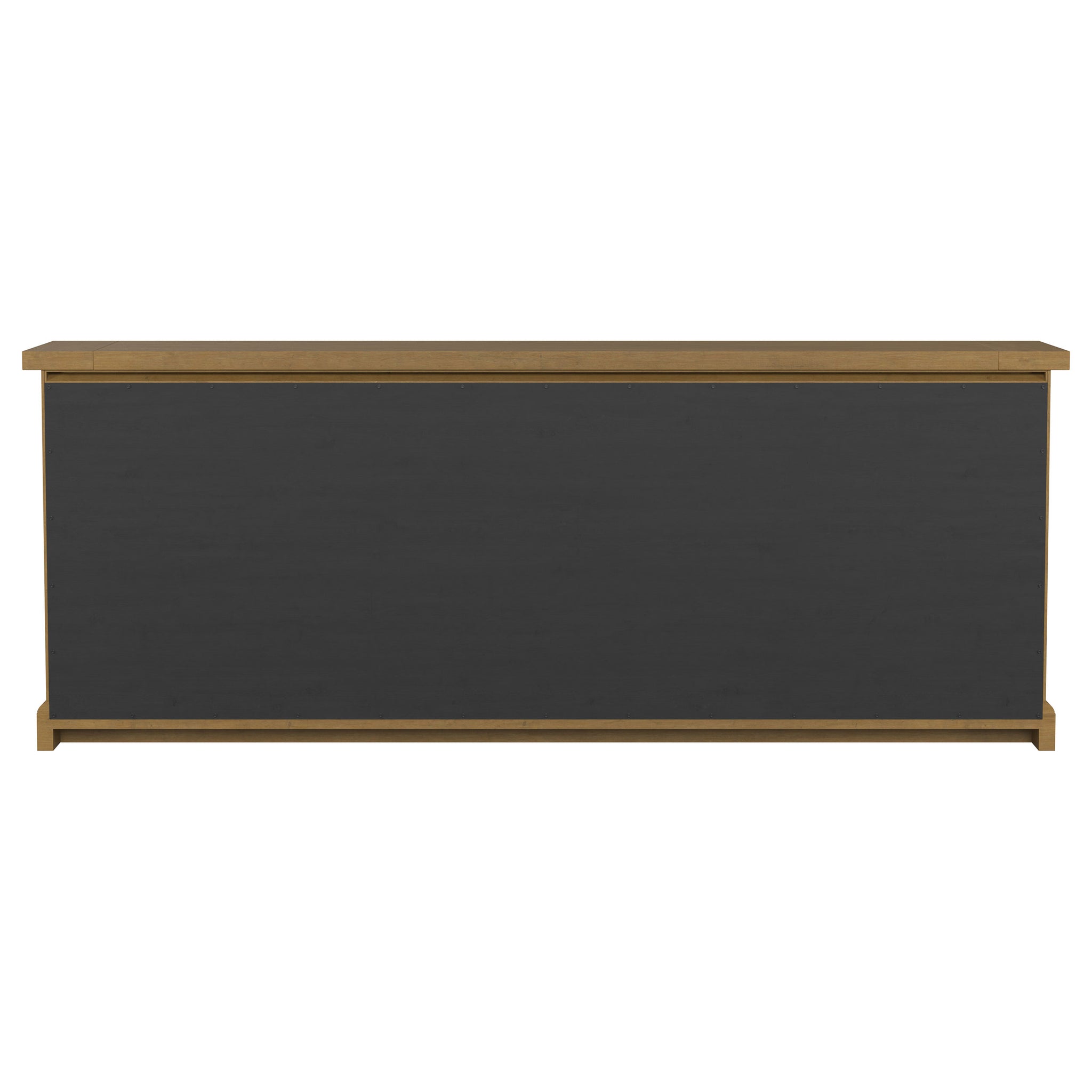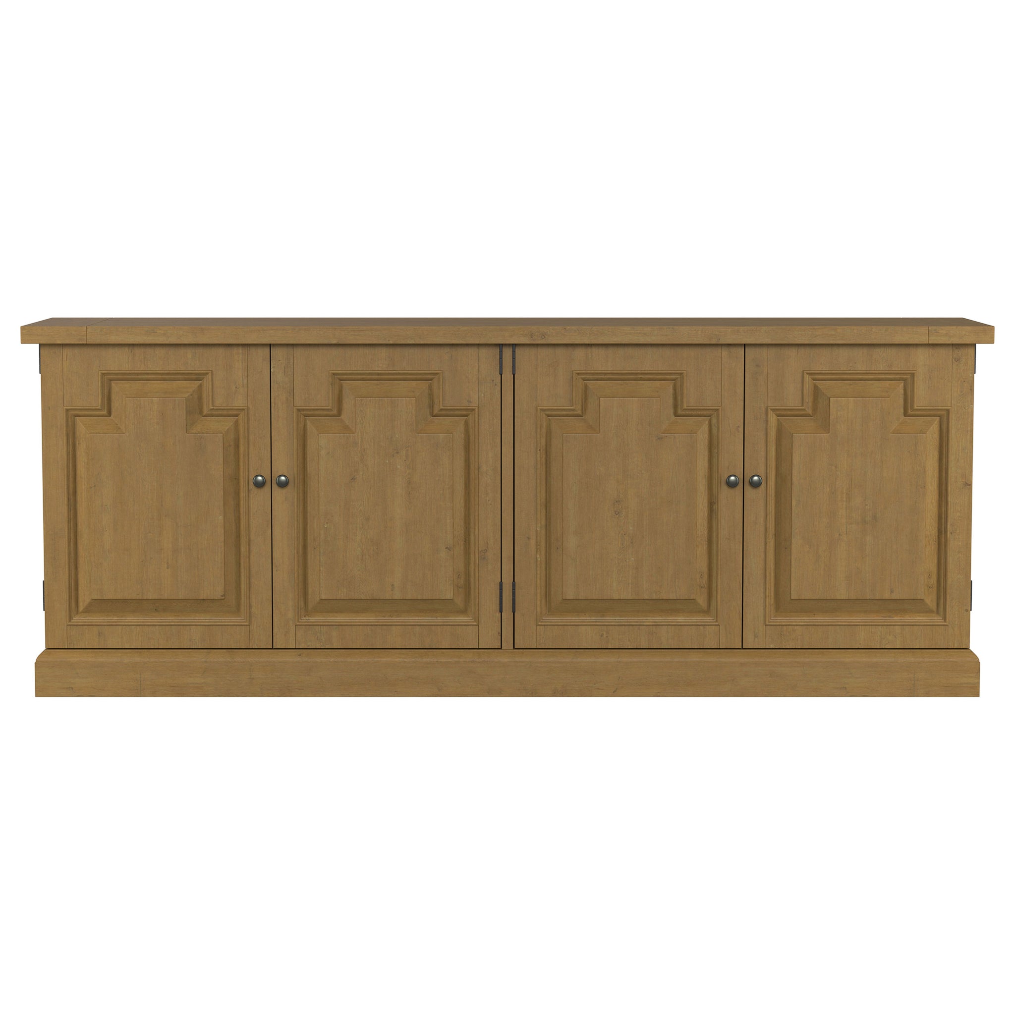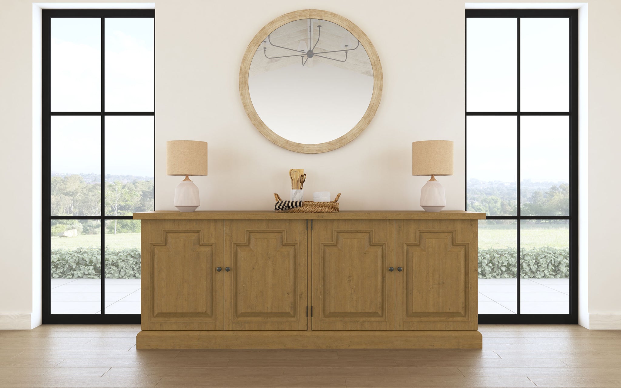 This four-door sideboard offers a refined blend of storage and style, perfect for dining and entertaining spaces. Crafted from pine, plywood, and pine veneer, it features a beautifully planked top that enhances its rustic charm. Raised panel doors lend a classic, sophisticated appeal, while the spacious interior includes two nested drawers with self-closing metal slides for effortless organization. This versatile piece functions beautifully as a server, providing ample space for dishware and linens. With its elegant craftsmanship, it also serves as a buffet, adding both convenience and timeless appeal to any home. Key Features: • Four-door sideboard with raised panel doors for a classic, textured look • Pine, plywood, and pine veneer construction ensures lasting durability • Planked top highlights the natural grain with a rustic honey finish • Spacious interior storage includes two nested drawers for organization • Self-closing metal slides ensure smooth and effortless drawer operation • Warm rustic honey tone enhances farmhouse and traditional decor
