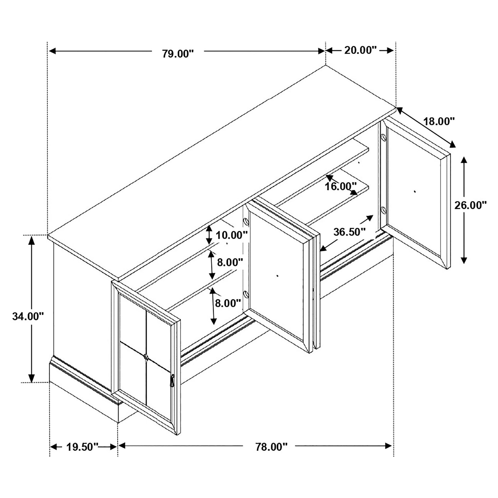 Combining beauty with purpose, this four-door dining sideboard delivers generous interior storage wrapped in timeless style. Behind each antique mirrored door are adjustable shelves, ideal for keeping serveware, linens, or entertaining essentials neatly organized. The barley brown finish brings warmth and texture to its classic silhouette, while matte black hardware adds contrast and sophistication. Crafted from solid rubberwood, engineered wood, and ash veneer, this piece embodies enduring elegance and practicality. Key Features: • Dining sideboard features four antique mirrored doors with adjustable interior shelving • Ample cabinet space stores dinnerware, linens, and entertaining essentials • Barley brown wood finish offers warmth and refined transitional appeal • Matte black hardware creates a striking accent against the light-toned frame • Crafted from solid rubberwood, engineered wood, and ash veneer for strength • Ideal buffet cabinet for dining rooms seeking functional and elegant design