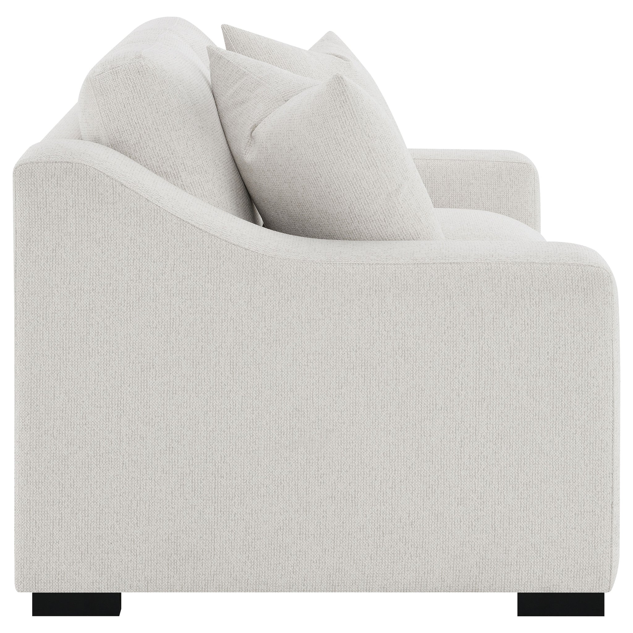 Create your transitional living room interior with this contemporary, white loveseat, upholstered in a white trillium polyester blend fabric throughout its sloped track armrests and top -stitched reversible cushions. A solid wood frame offers long-lasting support and stability as cappuccino finished block legs create a striking contrast.