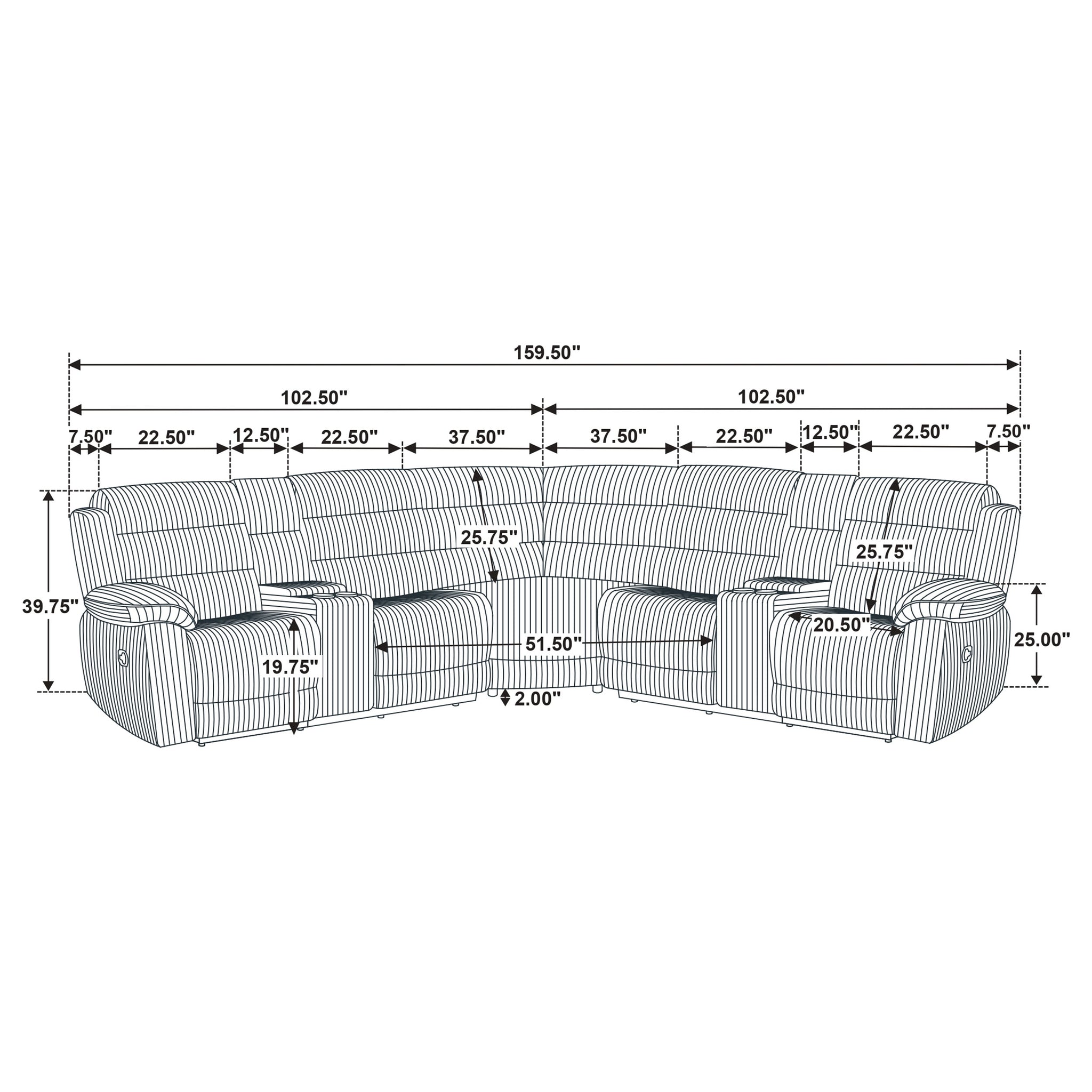 Unwind in sculpted comfort with this reclining sectional sofa, where bold texture meets irresistible softness. Wrapped in wide-wale corduroy upholstery, its velvety ribbed finish creates visual depth and an inviting touch. Deep channel tufting enhances the plush profile, while dual consoles offer lift-top storage and stainless steel cup holders. With pocket coil seating beneath every cushion, this sectional is a luxurious retreat for everyday lounging and connection. Key Features: • Reclining sectional sofa with sculpted profile and ribbed channel tufting throughout each panel • Chocolate brown wide-wale corduroy upholstery offers soft velvety texture and elevated visual interest • Two reclining seats provide effortless comfort with smooth manual motion functionality • Pocket coil seating ensures enduring structure, bounce, and all-day supportive comfort • Two center consoles with lift-top storage and removable stainless steel cup holders included • Reinforced with soft fabric, foam cushioning, and sturdy metal framework for lasting use