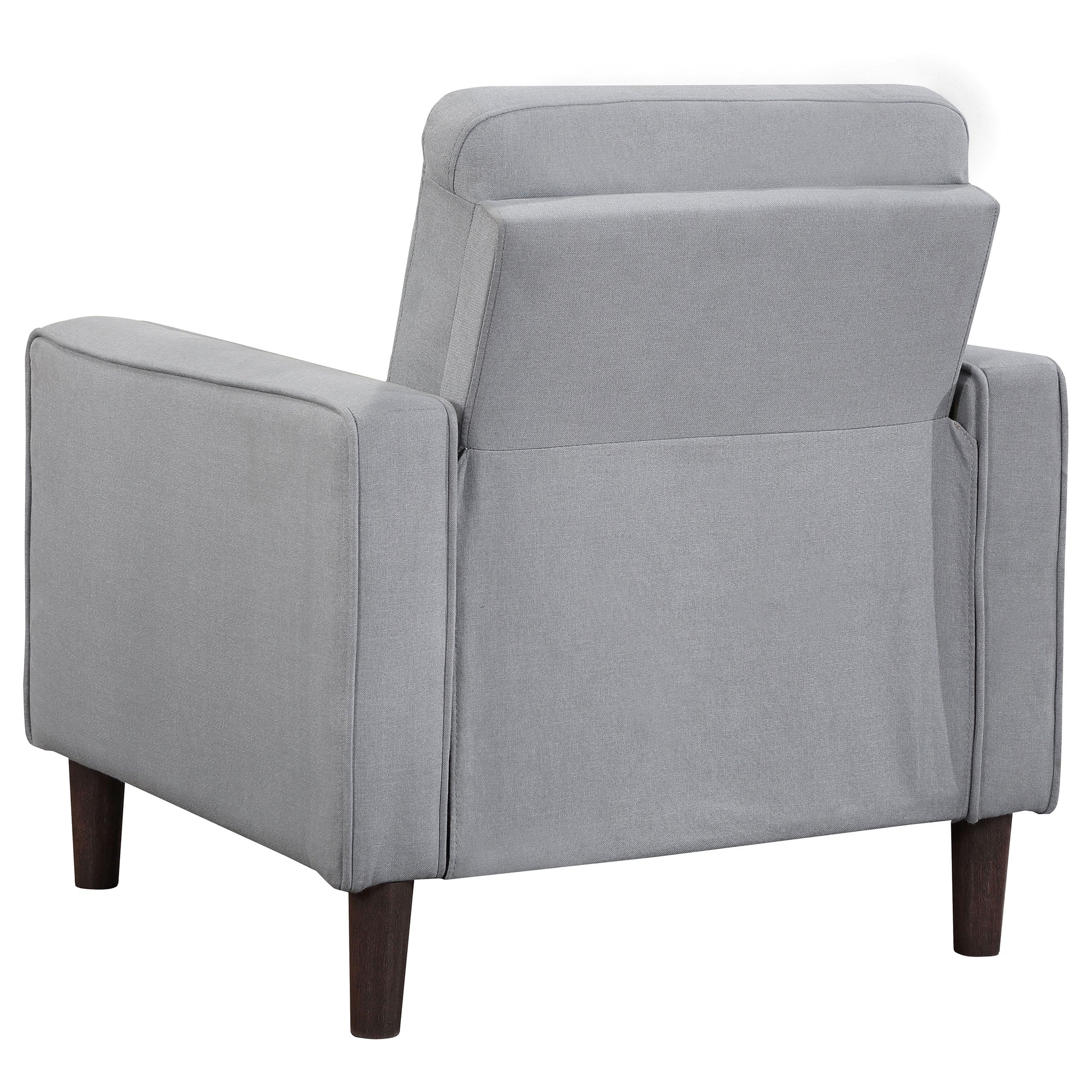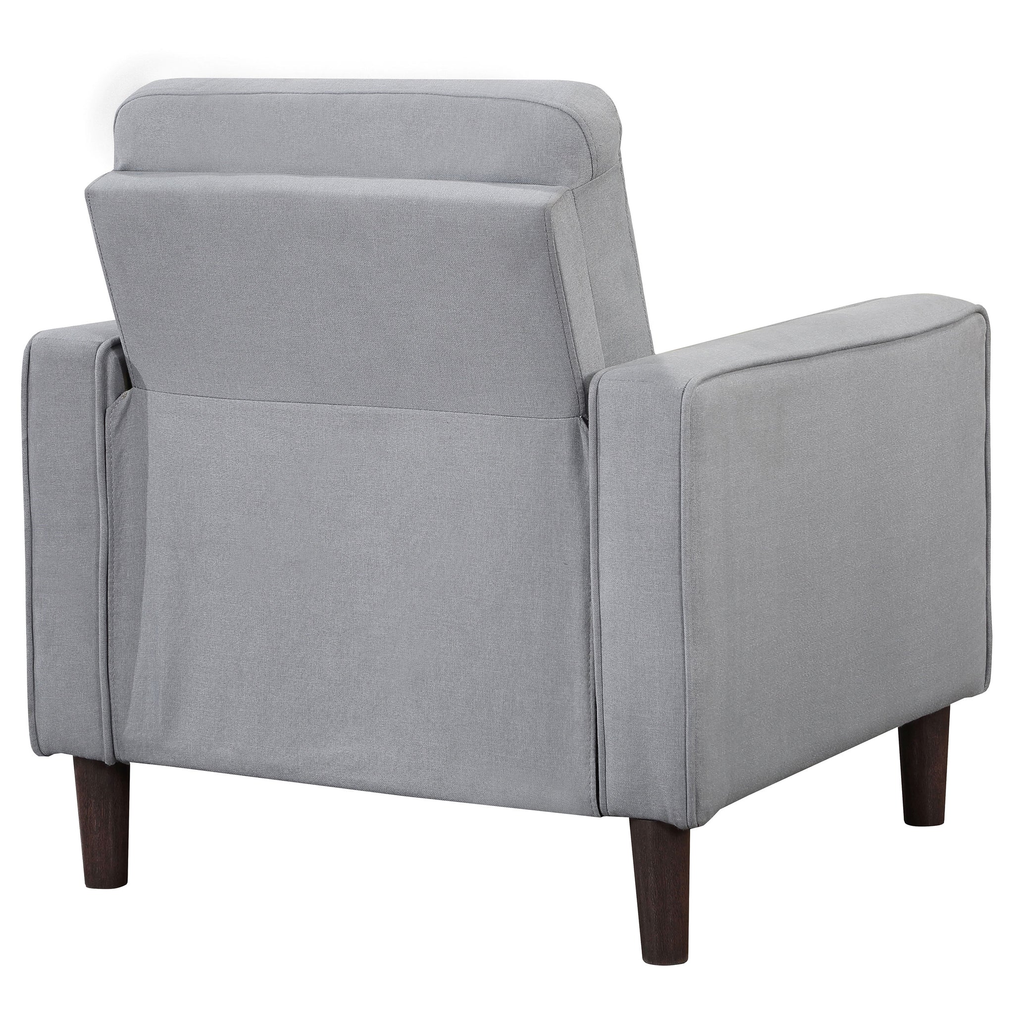This accent chair brings timeless charm and modern comfort to compact living spaces. Designed with classic track arms and self-welt detailing, it showcases refined craftsmanship and clean lines. Grid-tufted back cushions and pocket coil seating deliver plush comfort and reliable support, while tall tapered brown legs provide a sturdy foundation and a mid-century touch. Upholstered in durable, easy-clean performance fabric, this chair combines everyday functionality with effortless contemporary style. Key Features: • Compact accent chair design ideal for apartments, offices, or small living spaces • Classic track arm silhouette with self-welt detailing for tailored sophistication • Grid-tufted back cushion design ensures plush support and enduring comfort • Pocket coil spring seat construction enhances structure and long-lasting use • Dark brown tapered legs provide modern character and a stable foundation • Upholstered in durable, easy-clean performance fabric suited for daily living