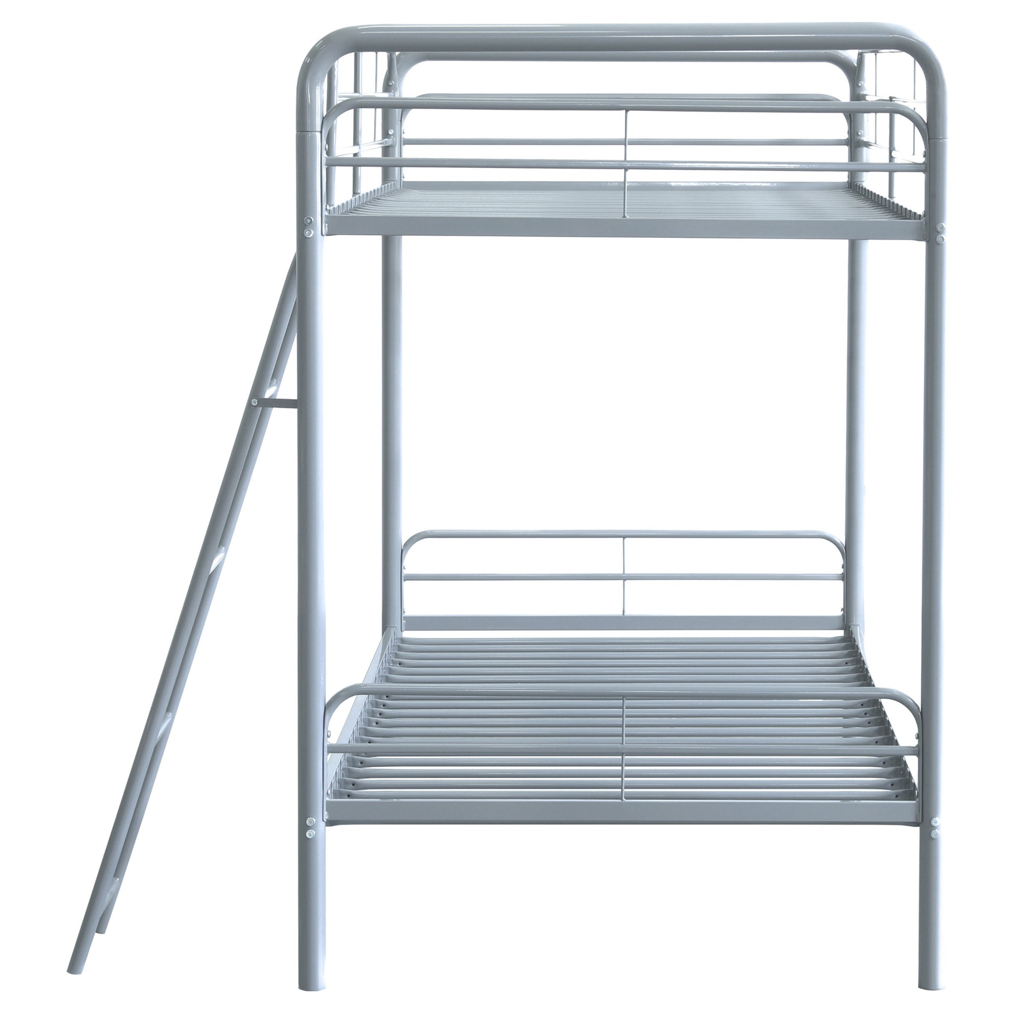 Maximize sleeping space with this modern metal bunk bed, designed for strength, safety, and everyday functionality. Its powder-coated glossy finish enhances the sleek silhouette, while full-length guardrails on the top bunk ensure secure rest. A built-in ladder provides stable access, integrated directly into the frame for a clean look and compact footprint. With metal slat support for both sleeping surfaces, this bunk bed eliminates the need for foundations and suits shared rooms with style and durability. Key Features: • Twin-over-twin bunk bed in glossy black powder-coated finish with clean, modern lines • Top bunk includes full-length guardrails for added safety and secure sleeping space • Angled built-in ladder allows easy access to upper bunk with a compact footprint • Metal slat system eliminates the need for a box spring or additional foundation • Space-saving vertical design ideal for shared kids’ rooms, dorms, or sleepover setups • Crafted from durable metal for everyday strength and long-lasting performance