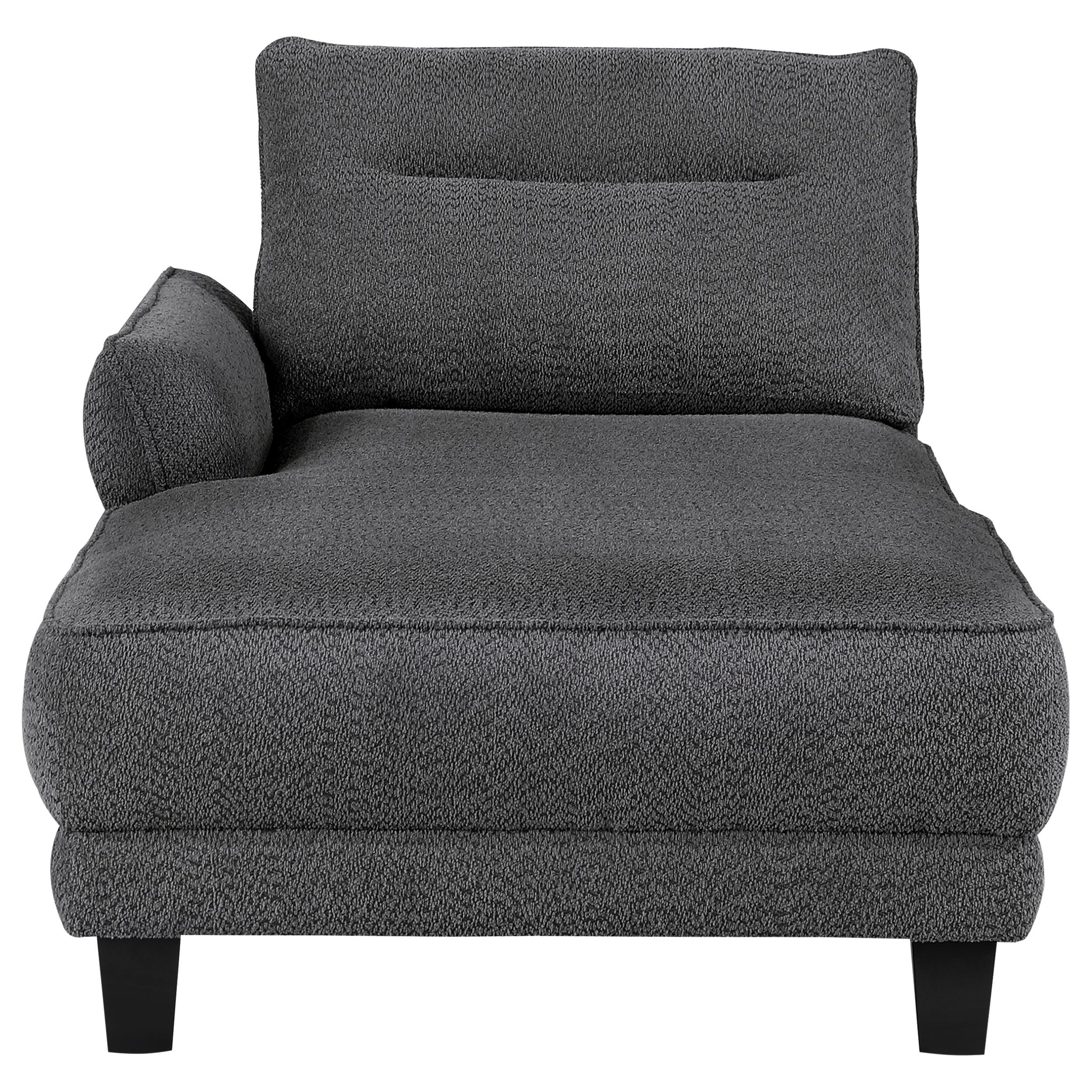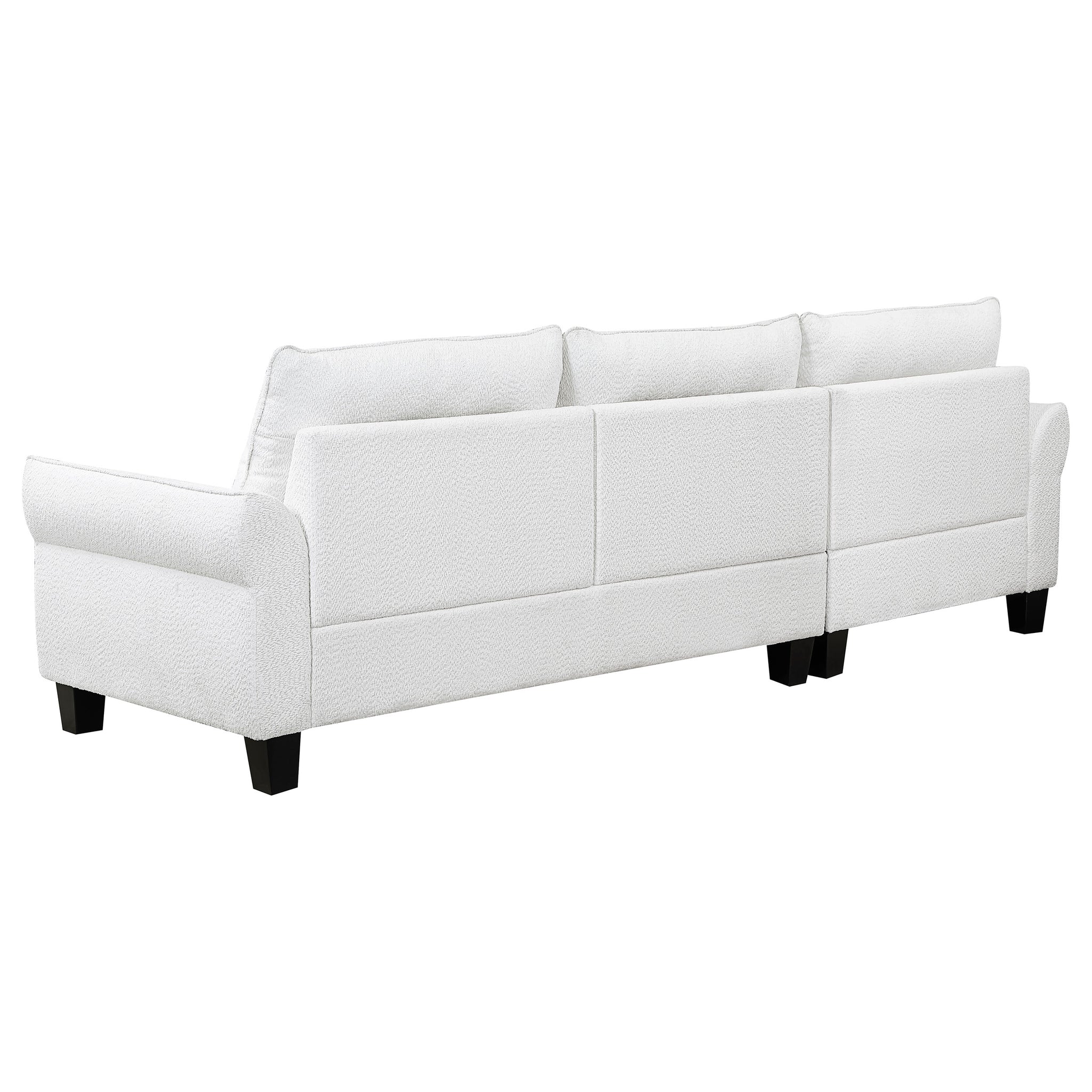 Experience ultimate comfort with this modern two-piece sofa chaise, available in grey or white. The fuzzy teddy bear-like textured fabric upholstery creates a cozy atmosphere. The softly rounded arms and welt framed reversible back cushions add a touch of sophistication. With attached welt-accented boxed seats and solid wood tapered legs, this sectional ensures a well-kept appearance and sturdy foundation.