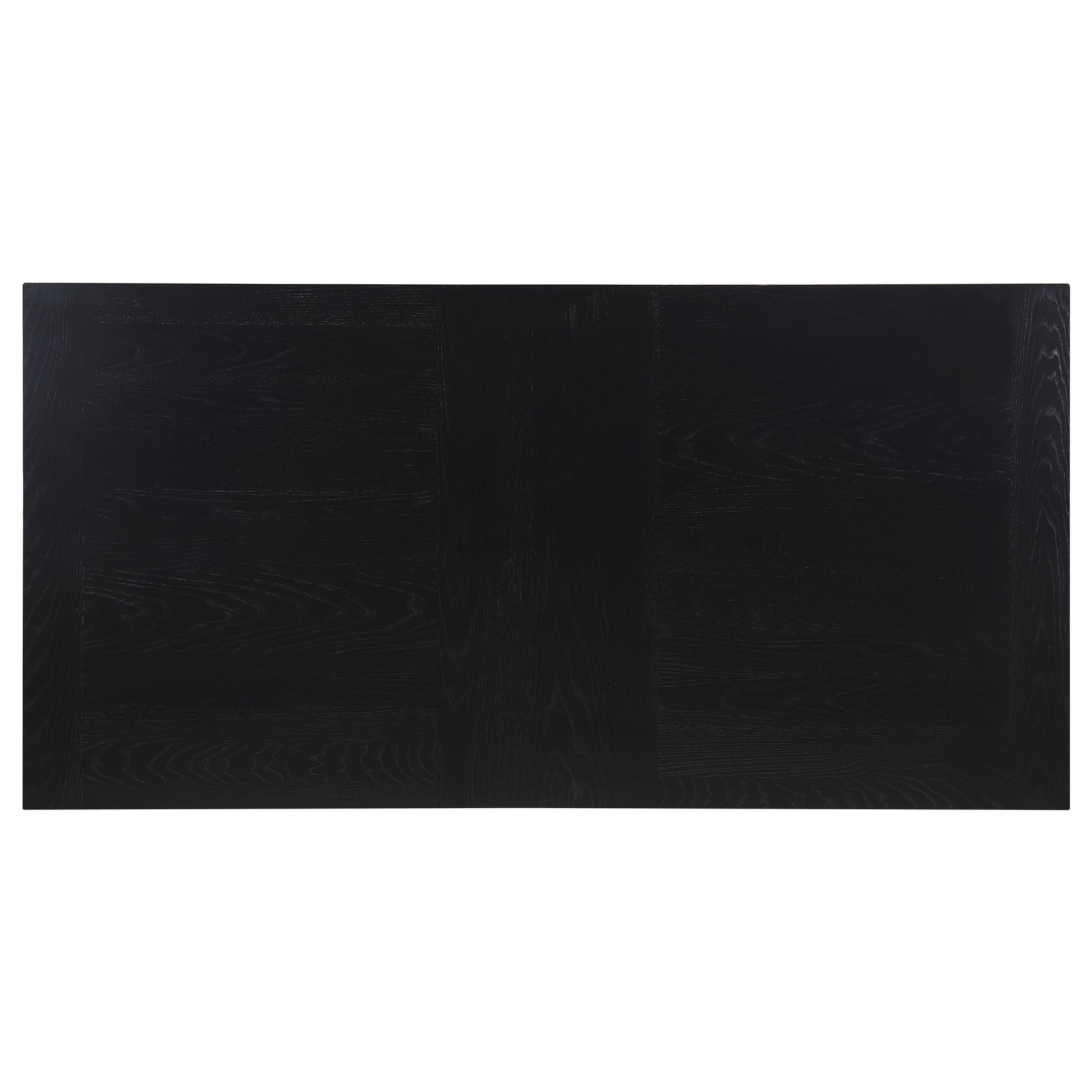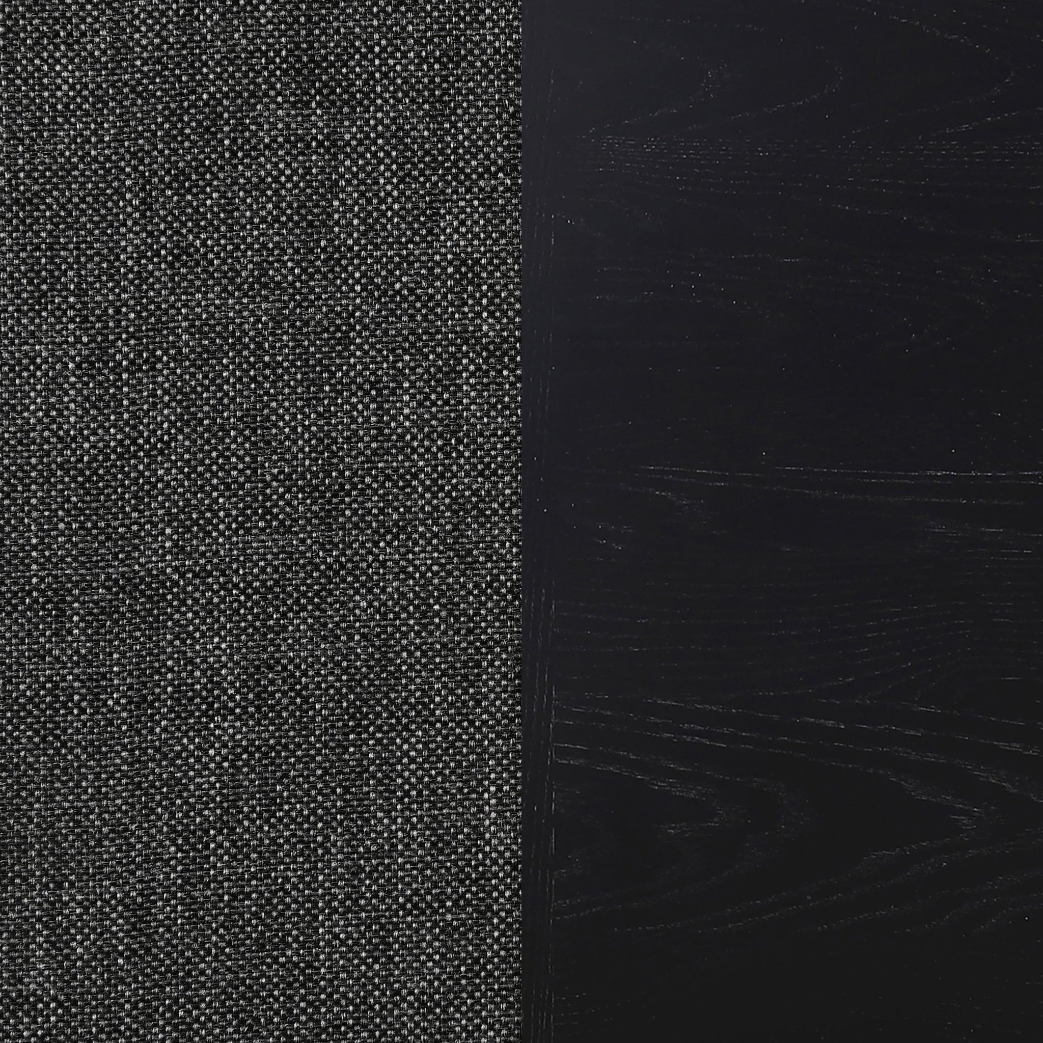 Introducing a beautiful dining room collection with clean, modern lines. The dining table boasts a oak veneer top with a black finish and a stunning tambour base design featuring fluted patterns on the double pedestal legs. The mid-century-inspired dining chairs have cushioned arms wrapped in durable charcoal grey fabric, offering comfort and style for any casual dining room.