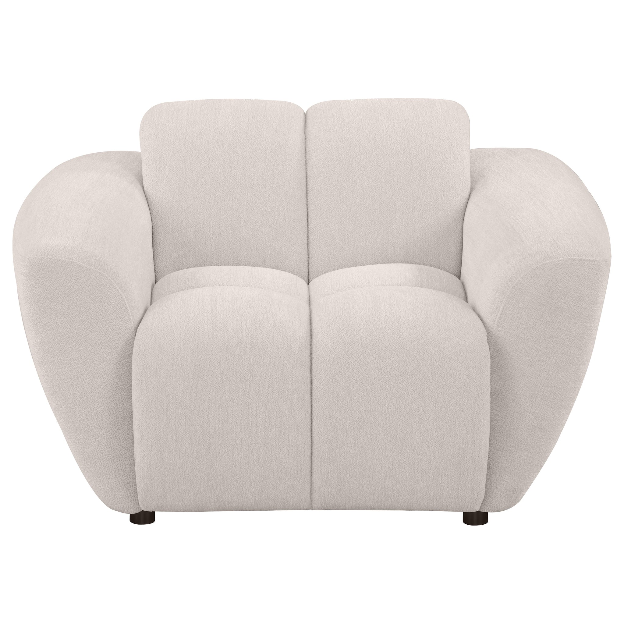 This sculptural accent chair from the Destino collection makes a bold statement with its wide splayed arms and chunky channel-tufted upholstery. Covered in soft greige chenille, it features a plush attached waterfall seat built with pocket coil construction for support that lasts. The grid-like contouring adds dimensional appeal, while its low, padded profile invites deep lounging. A modern silhouette grounded in comfort, it's the perfect standalone piece or complement to the full set. Key Features: • Sculptural accent chair with splayed arms and channel-tufted upholstery in soft greige chenille • Attached waterfall seat includes pocket coil construction for comfort and lasting support • Chunky contours and grid-style padding create bold volume and visual texture • Chenille fabric offers a smooth hand with subtle texture and tonal dimension • Low-profile frame provides lounge-ready comfort in a bold modern silhouette • Constructed from rubberwood, plywood, and foam for durable everyday use