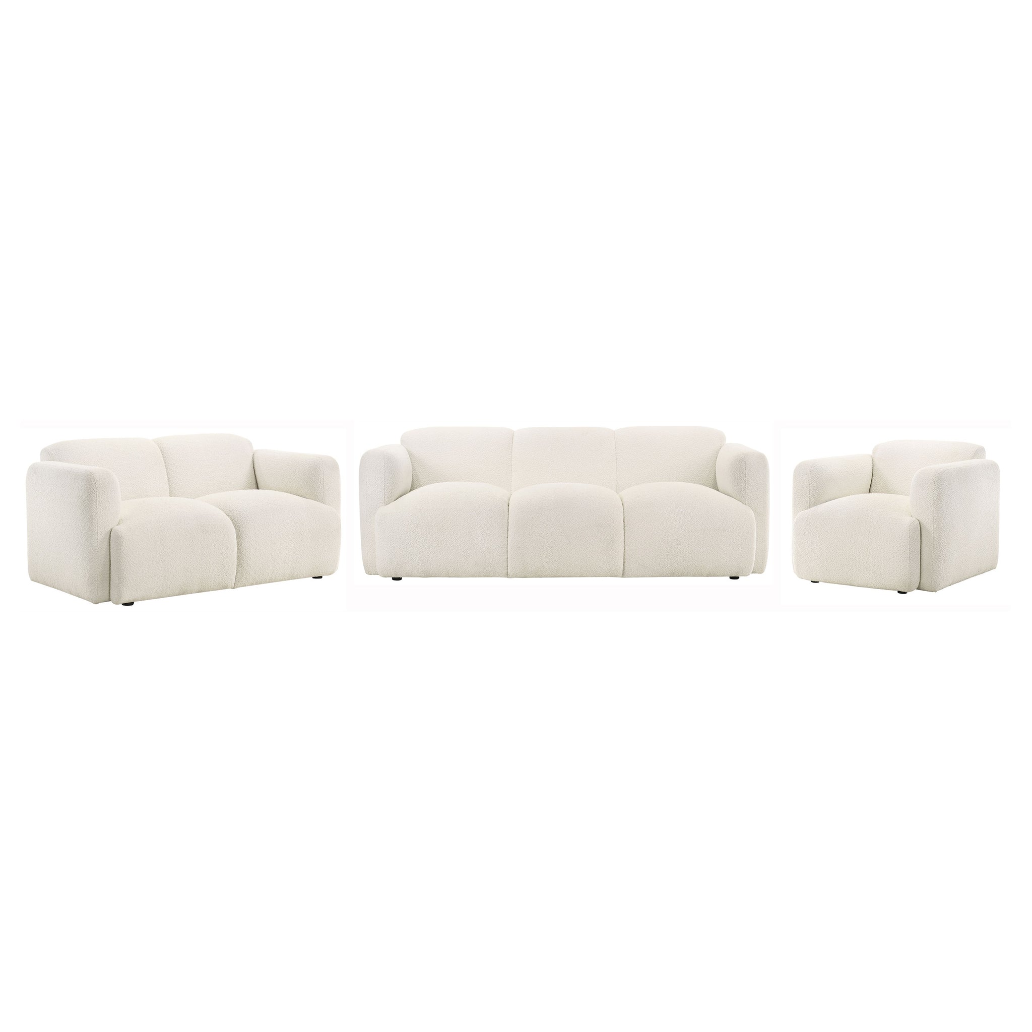This sculptural sofa set blends soft curves with modern simplicity for a cozy, elevated lounge experience. Each piece is wrapped in richly textured fabric and designed with a low-profile frame, rounded edges, and wide track arms that invite you to unwind. High-quality foam and pocket coil seating ensure supportive comfort that lasts. With its seamless silhouette and tactile finish, this sofa set offers minimalist warmth and relaxed sophistication for any contemporary living space. Key Features: • Sofa set with rounded silhouettes and low-profile frames for sculptural modern appeal • Upholstered in textured white fabric with soft feel and warm visual dimension • Curved track arms and continuous lines create an inviting, enveloping shape • High-density foam cushions provide plush comfort across all seating areas • Pocket coil seating delivers long-lasting support and maintains structure • Perfect for modern living spaces seeking soft form and relaxed sophistication