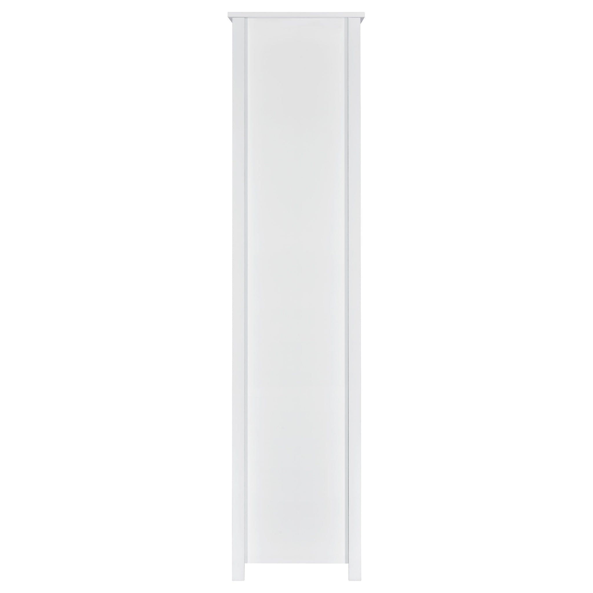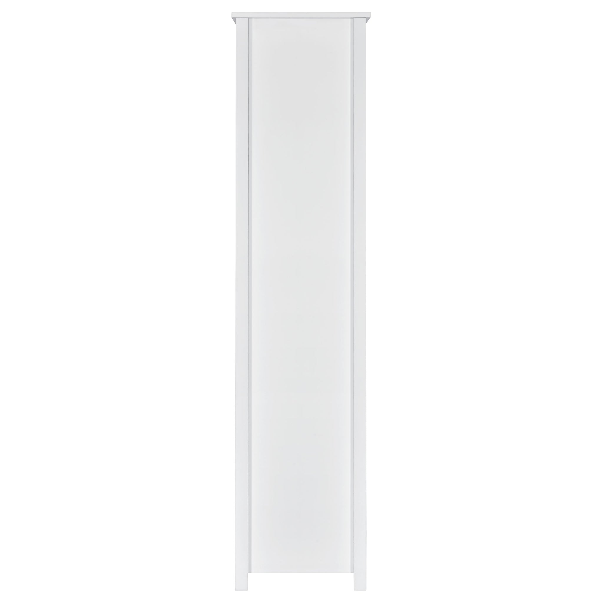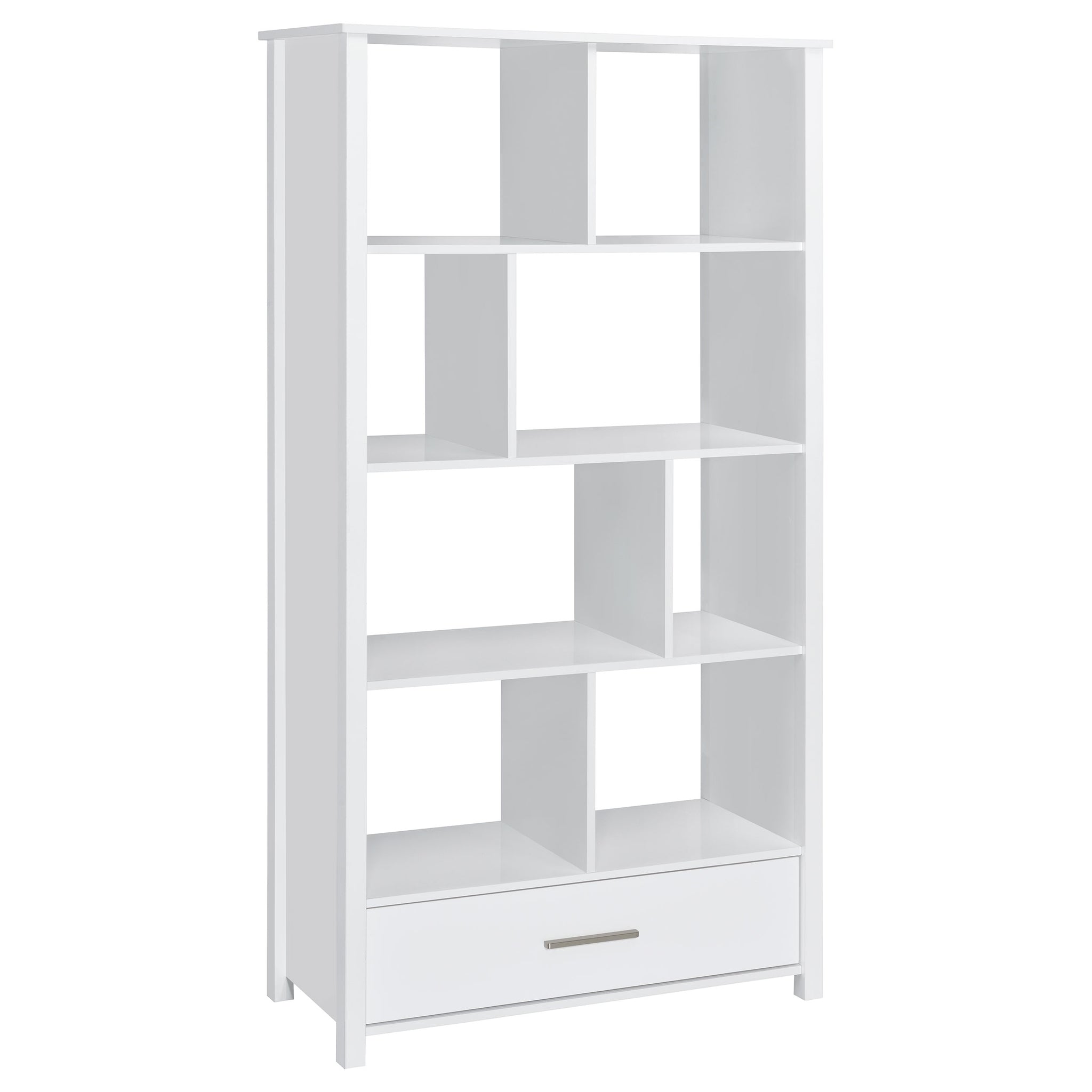 Asymmetrical shelves stack against one another to create this stunning, contemporary bookcase. A stylish, eye-catching addition to a home office, this minimalist bookcase invites you to organize office accessories or showcase decor and family photos. Eight separate sections divide items categorically if you wish, while a bottom drawer keeps items out of sight. The single drawer is adorned with a sleek, brushed zinc pull that further lends to the chic nature of this bookshelf. Versatile and functional, place this tall bookcase in the room of your choosing. Key Features: • Contemporary bookshelf with asymmetrical cubed layout and one storage drawer • White high gloss finish adds sleek shine and modern appeal • Eight open cubbies offer display space for décor and essentials • Lower drawer with silver pull stores smaller accessories out of sight • Engineered wood and laminate veneer construction provides durability • Compact profile fits home offices, bedrooms, or living rooms