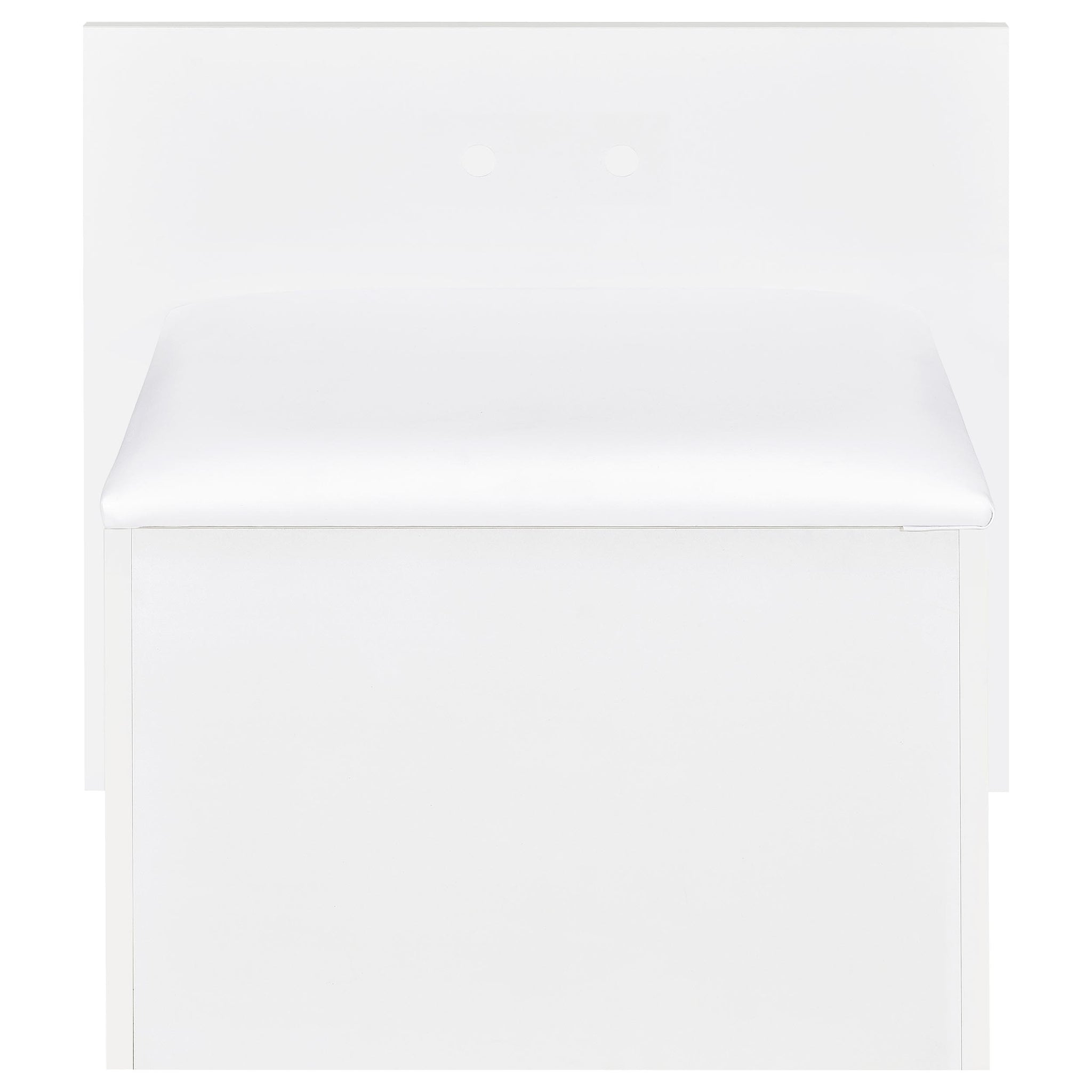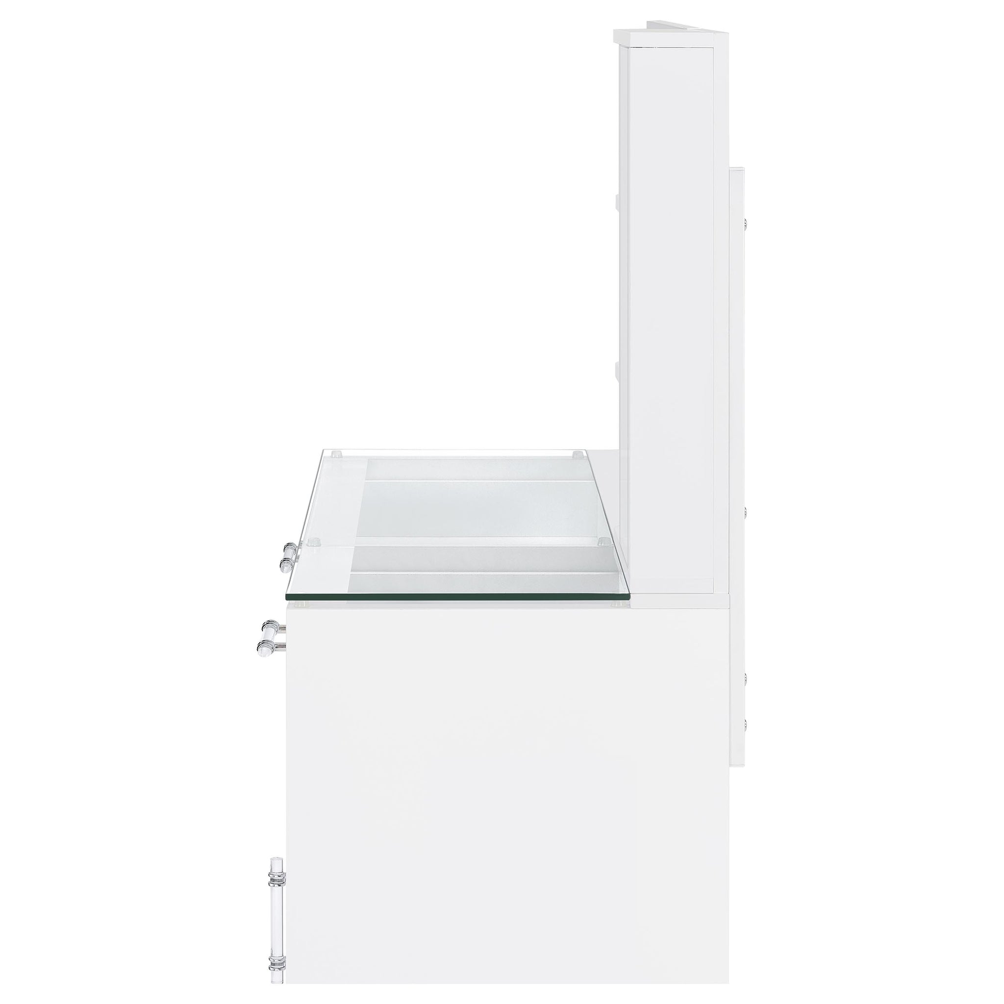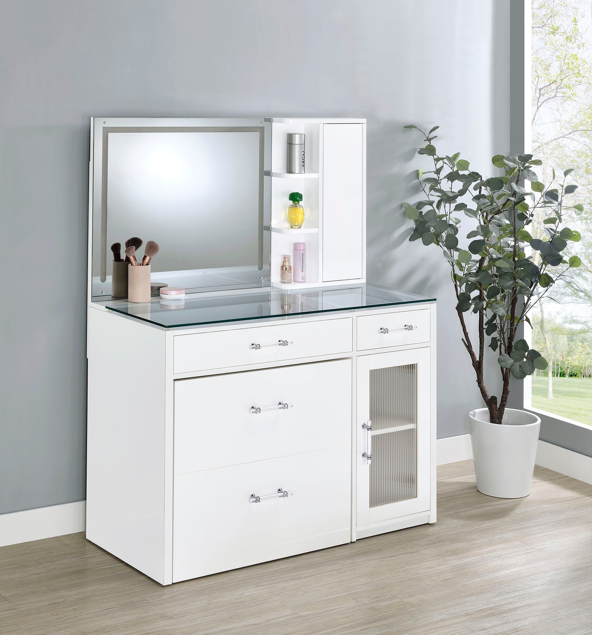 Transform your daily routine with this modern vanity desk, expertly merging sleek aesthetics and smart organization. Its high gloss finish, paired with clear acrylic handles, imparts a bright, contemporary look. Two smooth-gliding drawers and a cabinet with a framed fluted panel and adjustable shelf provide ample storage for cosmetics and styling tools. A tempered glass top keeps the surface pristine, while the integrated LED mirror, activated by a touch switch, ensures flawless lighting for every occasion.