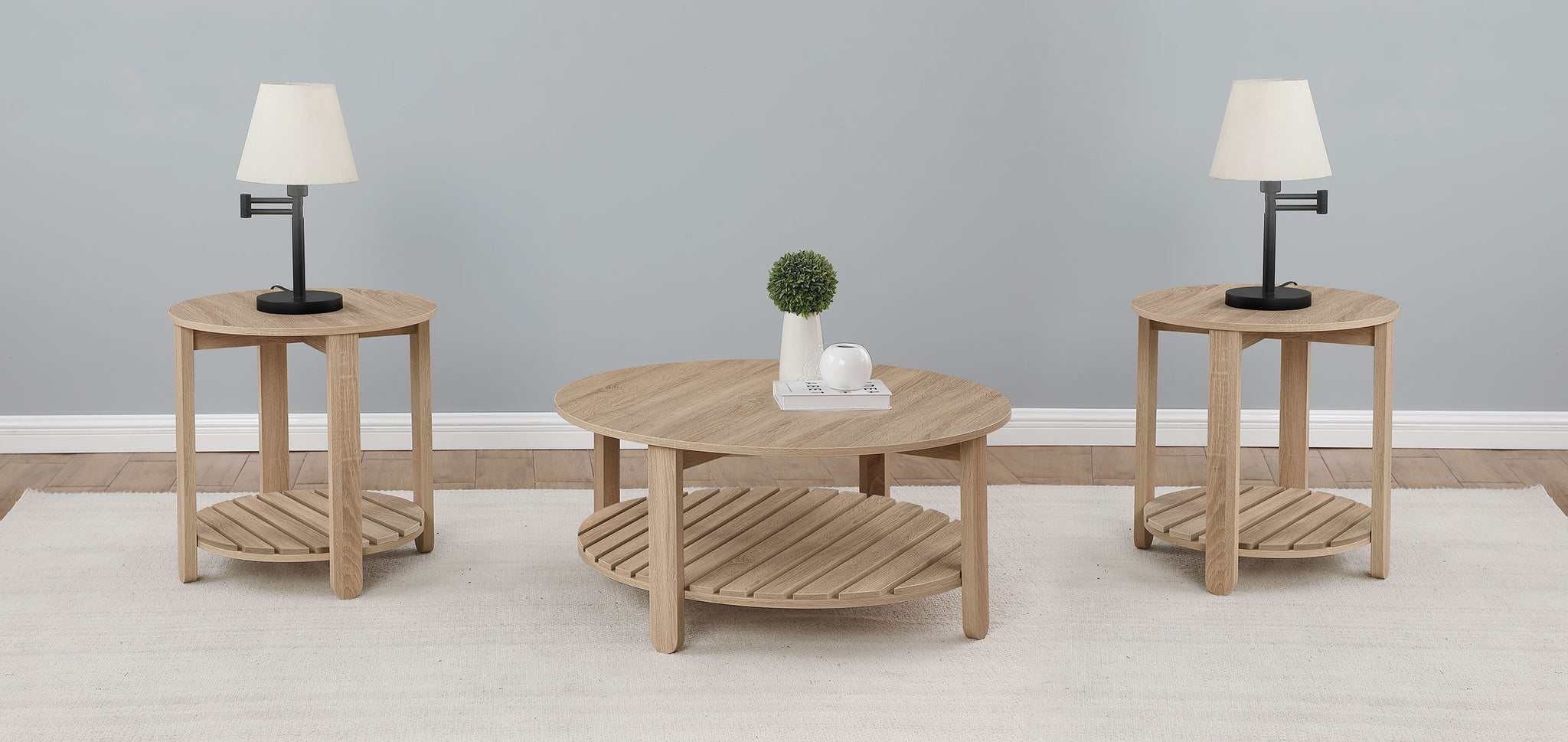 This coffee table set combines modern farmhouse style with functional design, creating a cohesive look for any living room. Each piece is crafted from durable engineered wood with an eco-friendly, scratch-resistant laminate veneer and features a natural finish with soft wood grain detailing. The round tabletops provide ample surface space, while the slatted lower shelves add texture and storage options. Designed for everyday use, this set is a practical and stylish choice for any home.