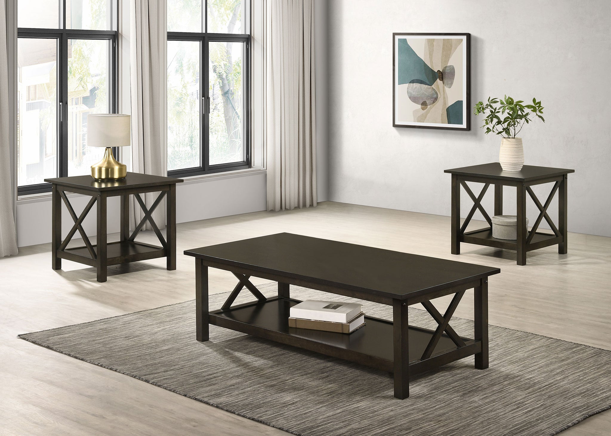 This 3-piece occasional table set includes a coffee table and two end tables, ideal for a living room or lounge. Constructed from hardwood, engineered wood, and rubberwood veneer, this set showcases a rich dark merlot finish. Each piece is designed with a lower shelf for extra storage space, while the X-shaped accents on the sides add a touch of visual appeal. This coffee table set is a perfect combination of form and function for your home. Key Features: • Three-piece coffee table set featuring a stylish coffee table and two end tables • Dark merlot finish complements any living room decor • Lower shelf provides additional storage and display space • X-shaped side accents enhance the table's overall design • Crafted from hardwood, engineered wood, and rubberwood veneer • Strong and durable construction ensures long-lasting use