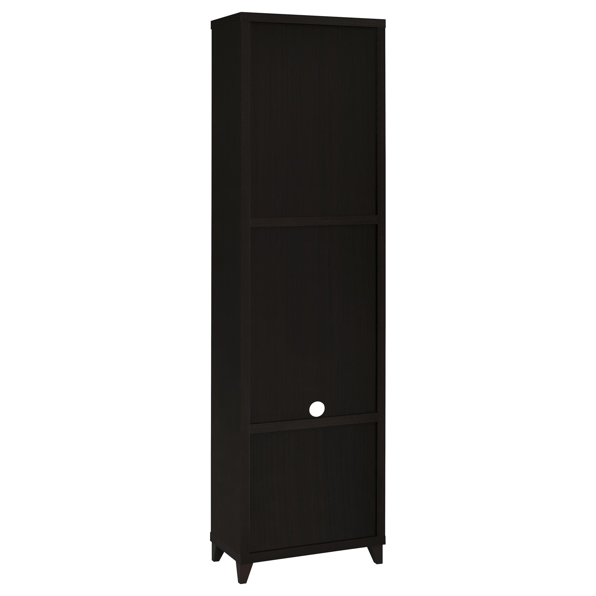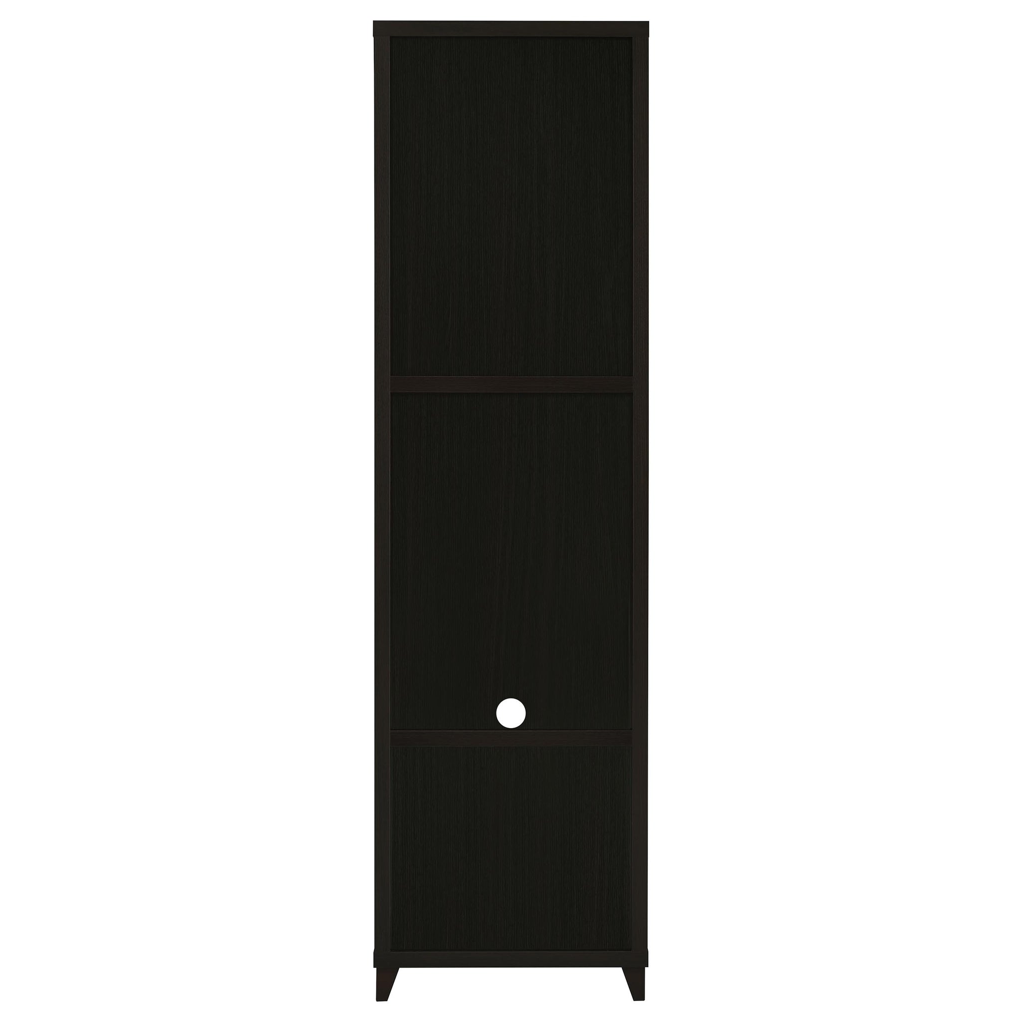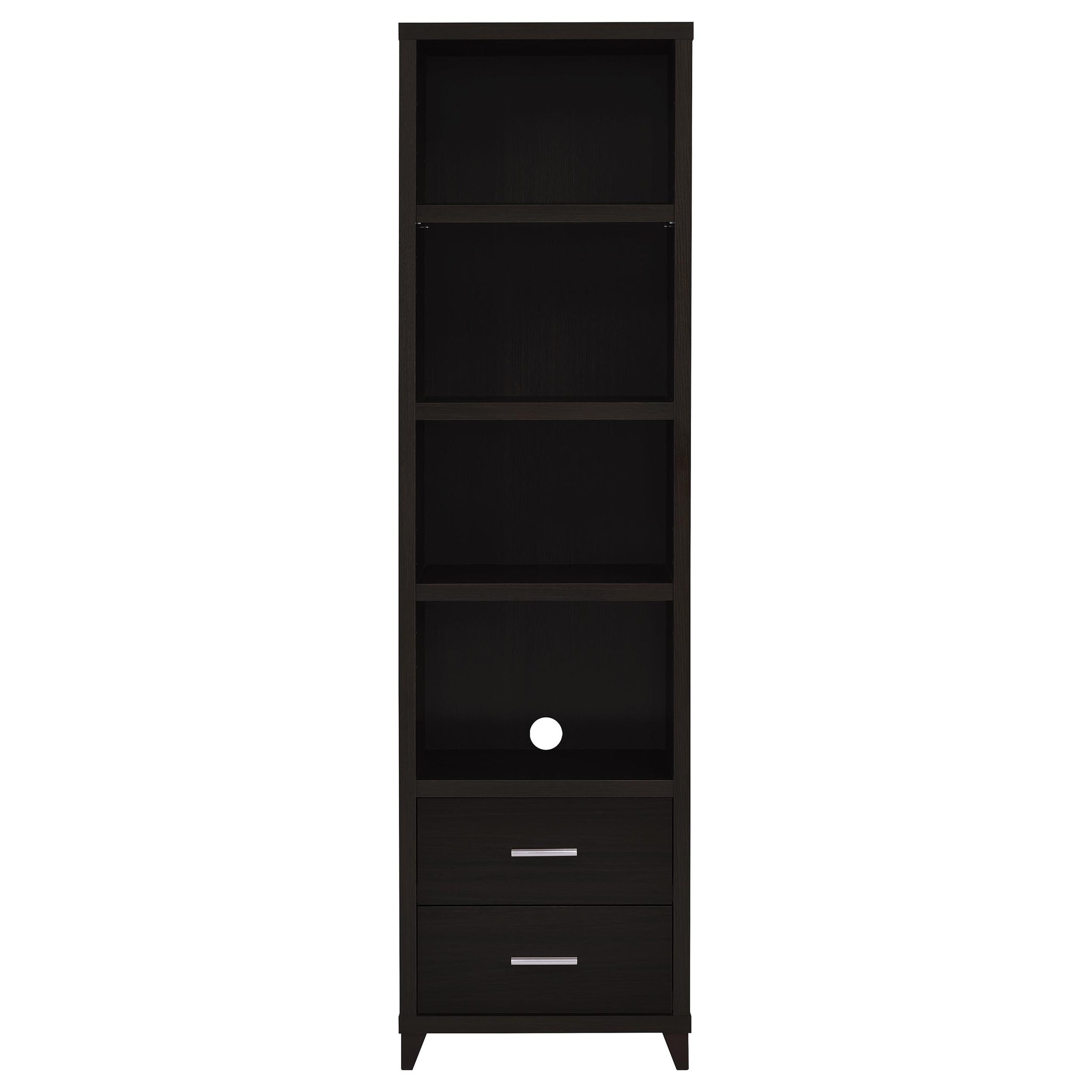 Elevate your entertainment area with this versatile media tower, designed with sleek lines and a cappuccino finish for contemporary appeal. Four open shelves provide ample space to display books, decor, or media devices, while adjustable shelving adds flexibility for customized storage. Two spacious drawers at the base keep accessories neatly tucked away, complemented by brushed silver hardware for a modern touch. Supported by tapered legs, this tower combines practical function with a stylish silhouette to complete your living space._x005F_x000D_ Key Features: • Cappuccino media tower with modern silhouette and brushed silver hardware accents • Four open shelves provide ample space for books, decor, and media accessories • Adjustable shelving offers flexible storage options for customized organization • Two lower drawers add concealed storage for remotes, games, or essentials • Constructed from engineered wood with scratch-resistant laminate veneer finish • Euro drawer glides and tapered legs ensure smooth function and lasting durability