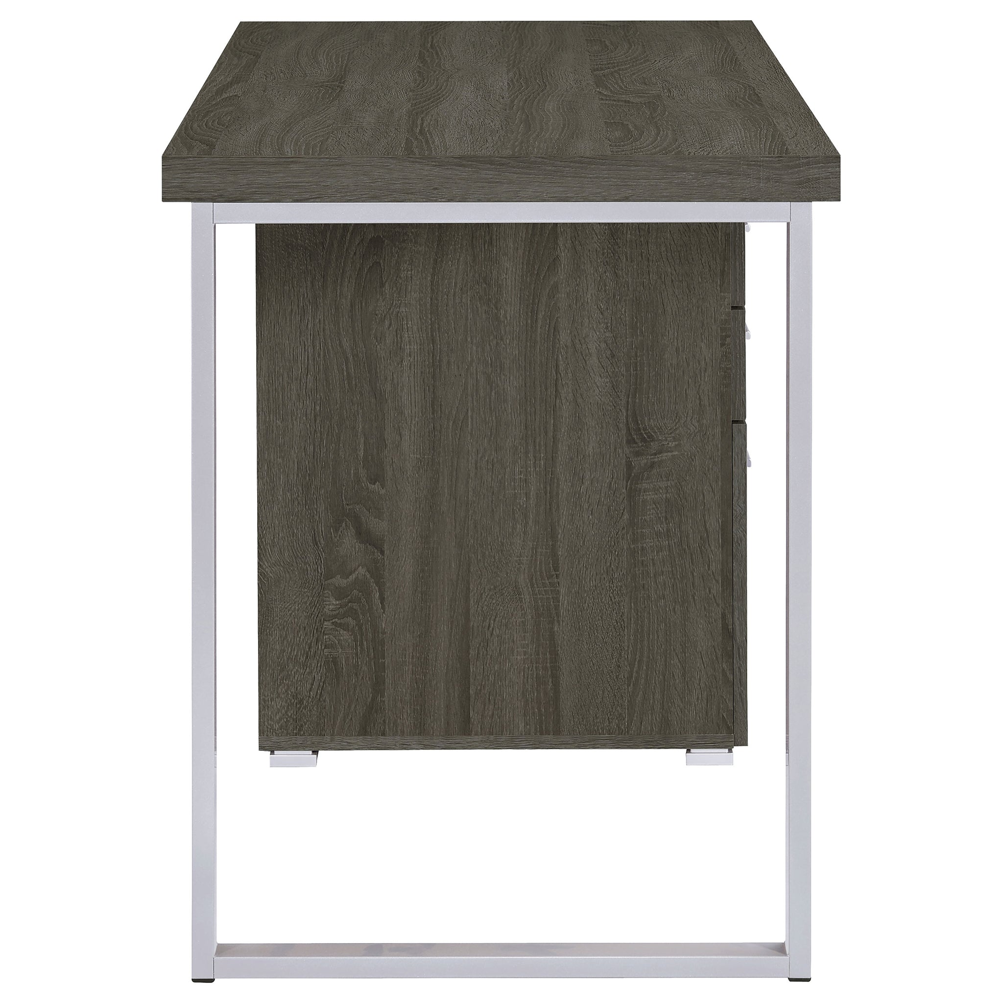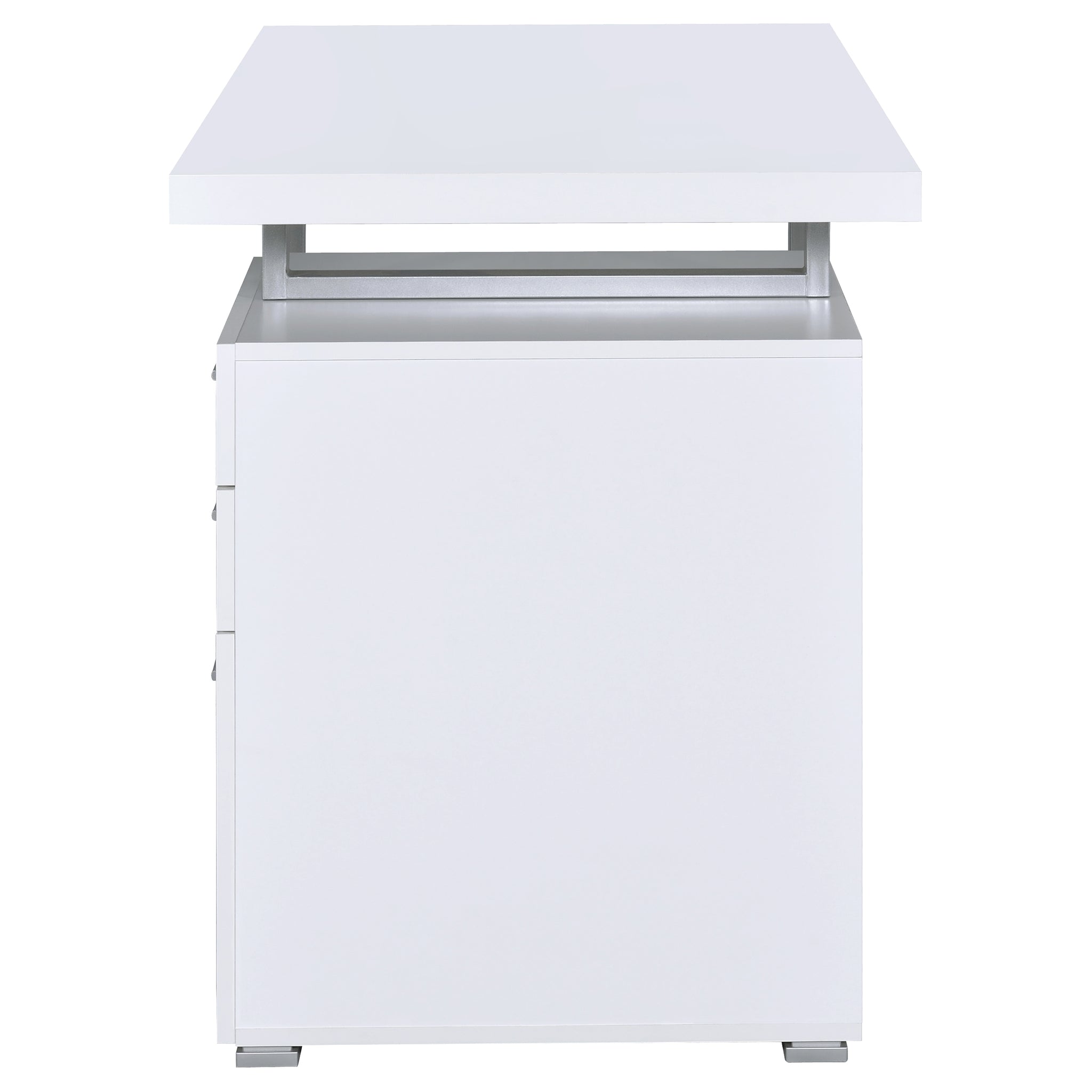Streamline your workspace with this modern office desk that combines function and style. Supported by a sturdy silver metal frame, the design features a spacious work surface along with two storage drawers and a file cabinet that accommodates both legal and letter-sized documents. A reversible configuration allows you to set up the storage pedestal on either side, providing flexibility for any layout. Crafted with engineered wood and laminate veneer, this desk balances durability with sleek contemporary appeal._x005F_x000D_ Key Features: • Cappuccino office desk with modern design and silver finished metal framework • Reversible configuration allows storage pedestal on either left or right side • Includes two storage drawers and one file cabinet for organized workspace use • File cabinet accommodates both letter size and legal size document storage • Crafted with engineered wood and laminate veneer for everyday durability • Large work surface provides ample room for writing, studying, or computing