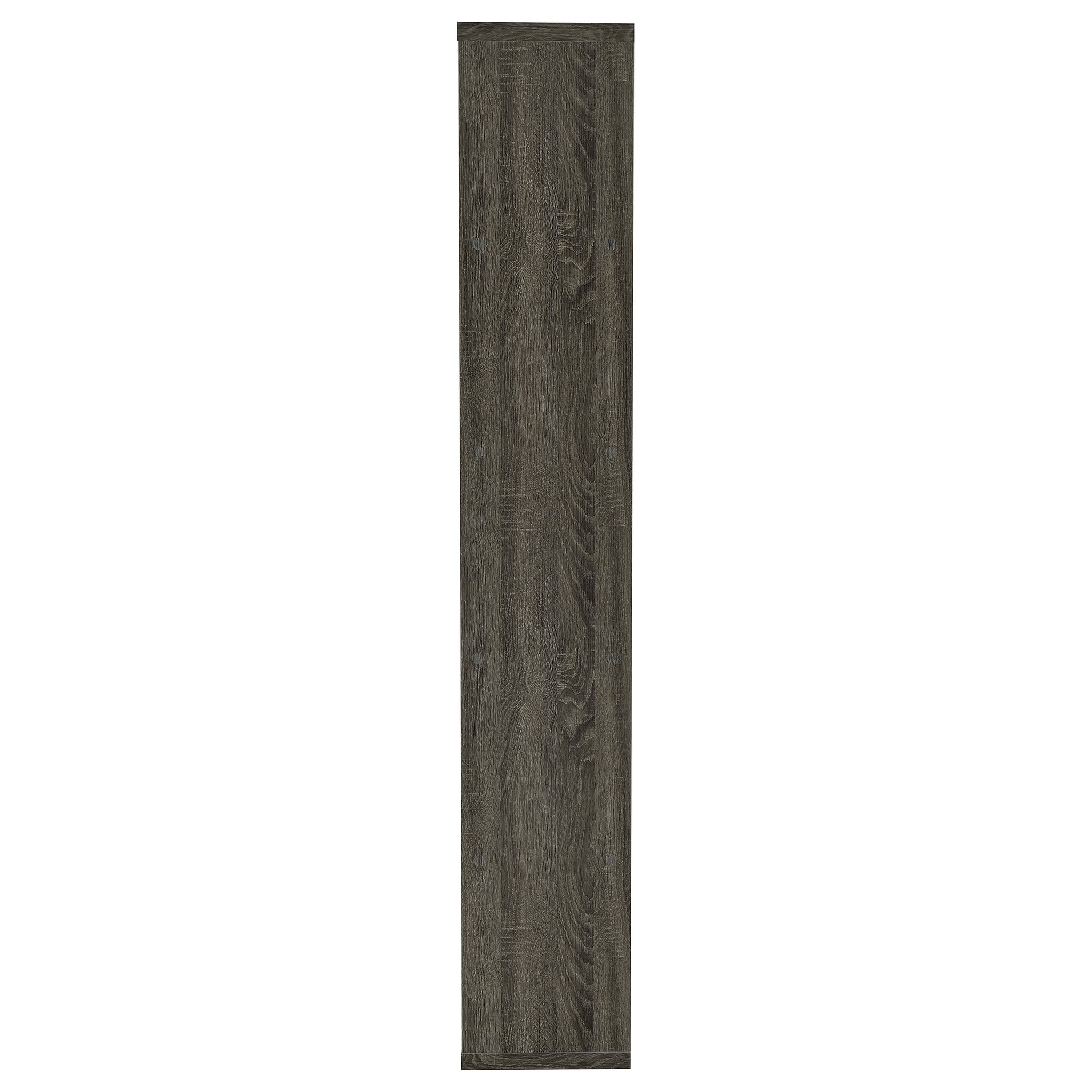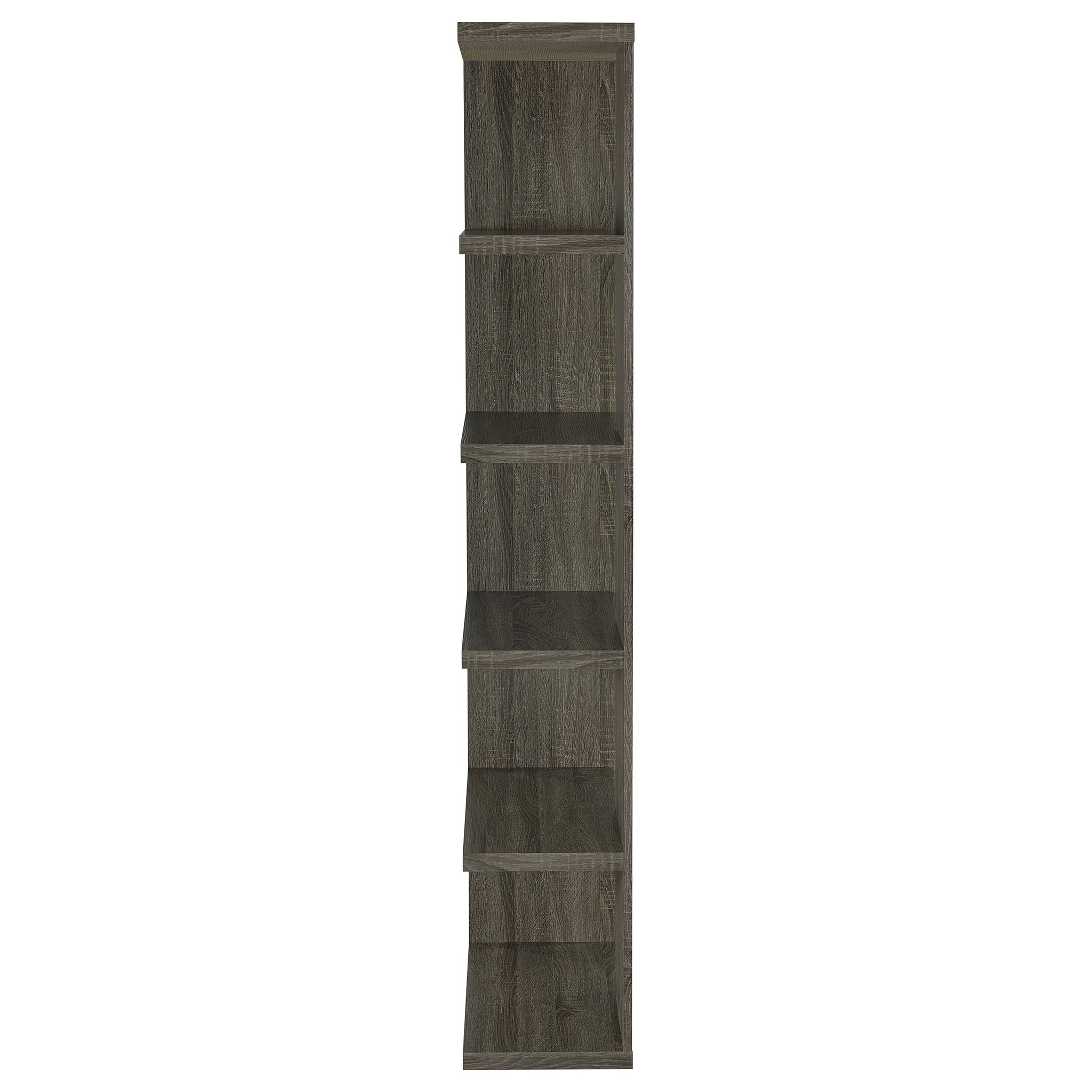 Add a touch of modern charm to any room with this stylish bookshelf in a weathered grey finish. Designed with a mix of open and backed shelving, it brings visual intrigue and versatility to your storage needs. Crafted from engineered wood and finished in eco-friendly melamine veneer, this unit offers five spacious tiers perfect for books, décor, and keepsakes in a contemporary home office or living space. Key Features: • Modern bookshelf with five staggered shelves for stylish organization • Weathered grey finish adds a rustic yet contemporary visual appeal • Open-end shelf design provides dimension and lightness to the silhouette • Ideal for displaying books, framed photos, or small potted plants • Made of engineered wood with a durable melamine veneer for longevity • Compact footprint suits apartments, home offices, or cozy reading corners