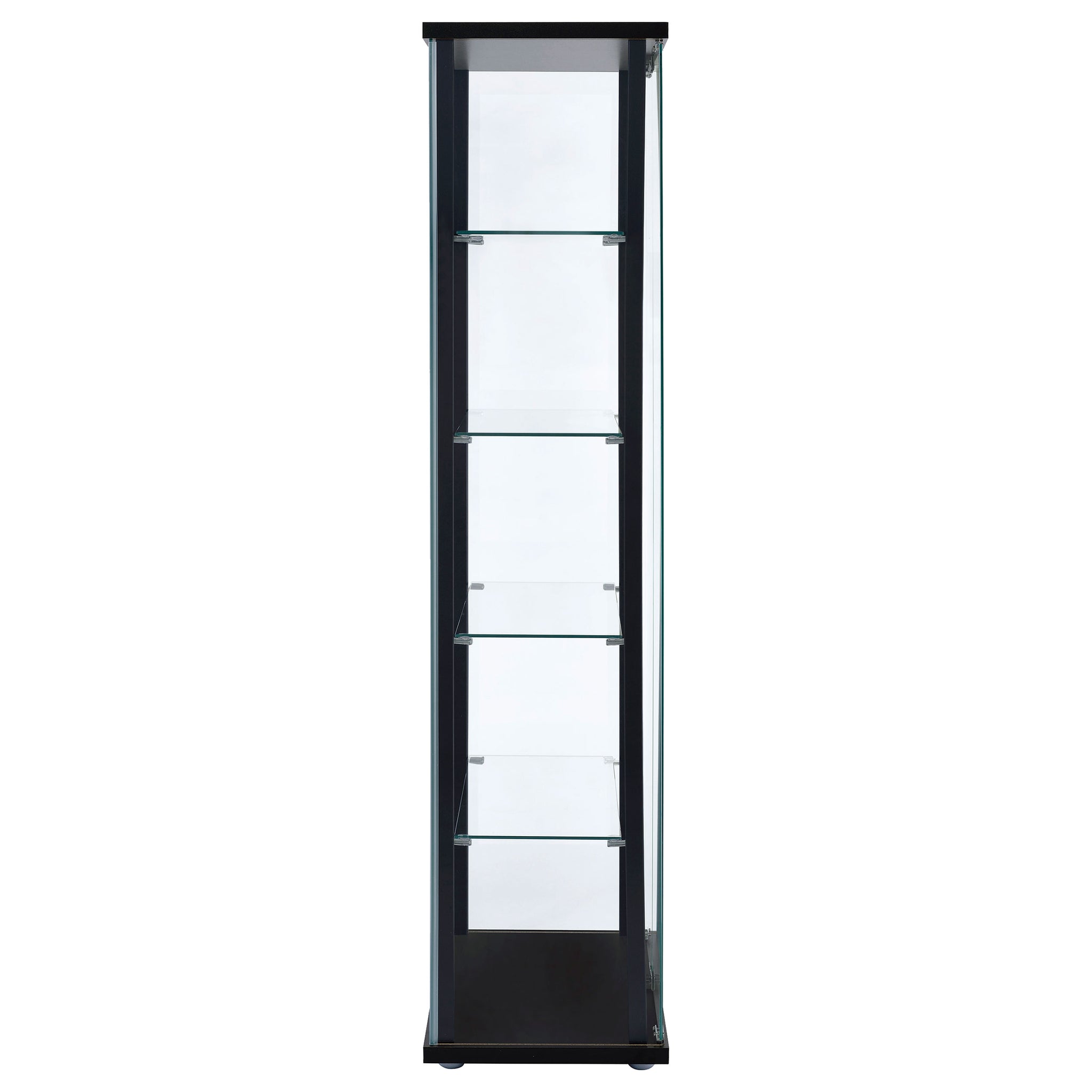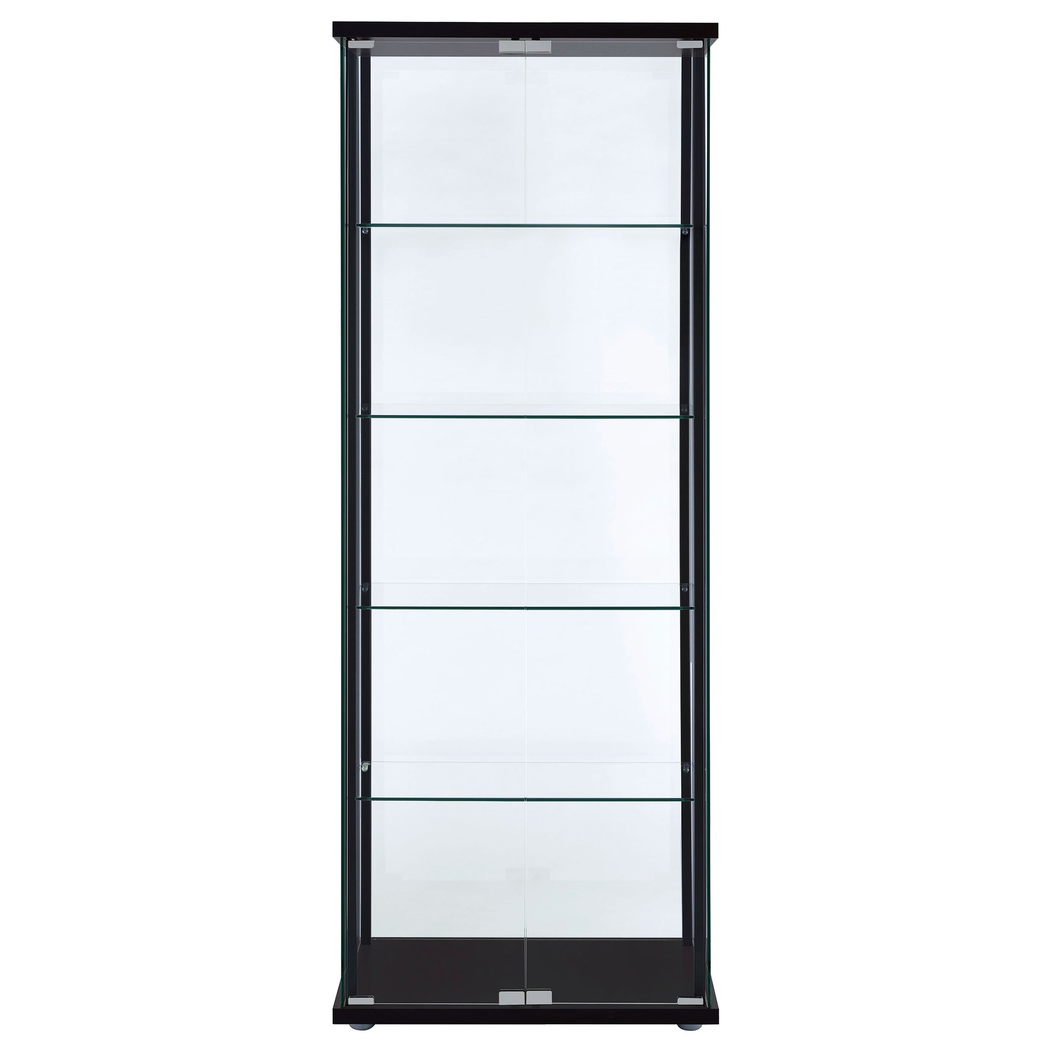 Transparency and linear styling make this curio cabinet stand out and shine. Simple design work blends straight lines with a slender black frame and tempered glass shelves. Push-to-open doors offer easy access to interior shelving. Put your best decor on display in this elegant piece that works beautifully in a living room or end wall. This enticing curio cabinet delivers a breathtaking look in modern and more traditional interiors. Key Features: • Black-finished frame with clear tempered glass for a sleek, modern style • Five tiers of open glass shelving for collectible or décor display • Push-to-open glass doors allow smooth and handle-free access • Sturdy construction with glass, engineered wood, and laminate accents • Ideal for use in living rooms, offices, or dining spaces • Includes chrome hardware accents and tip-over restraint