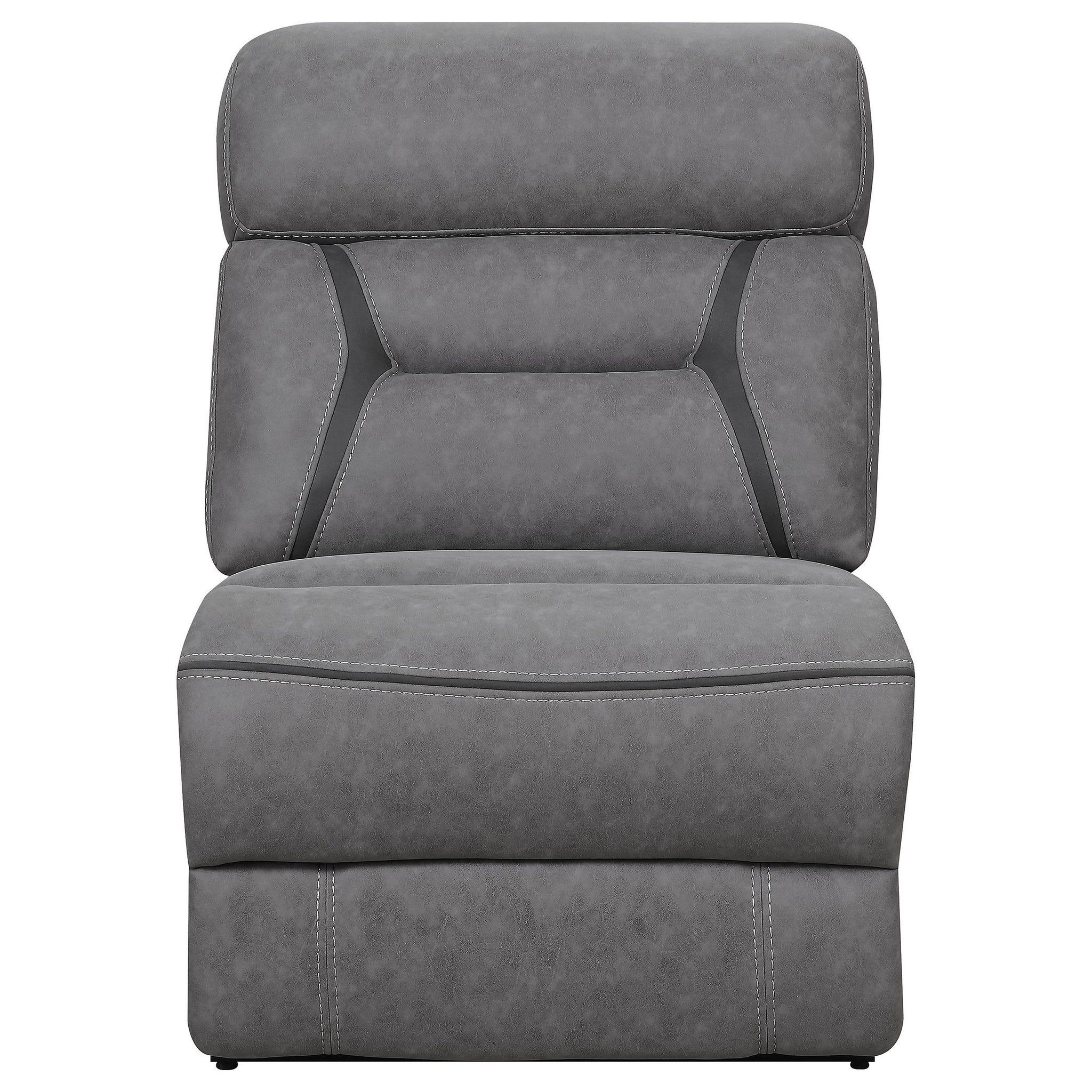 Designed for seamless modular integration, this armless chair expands seating space while maintaining a sleek and cohesive look. Upholstered in soft grey microfiber, it features plush padding and a supportive channel-tufted backrest for enhanced comfort. The armless design allows for flexible configuration within a sectional layout. Built for durability, it ensures long-lasting stability and a cozy seating experience.