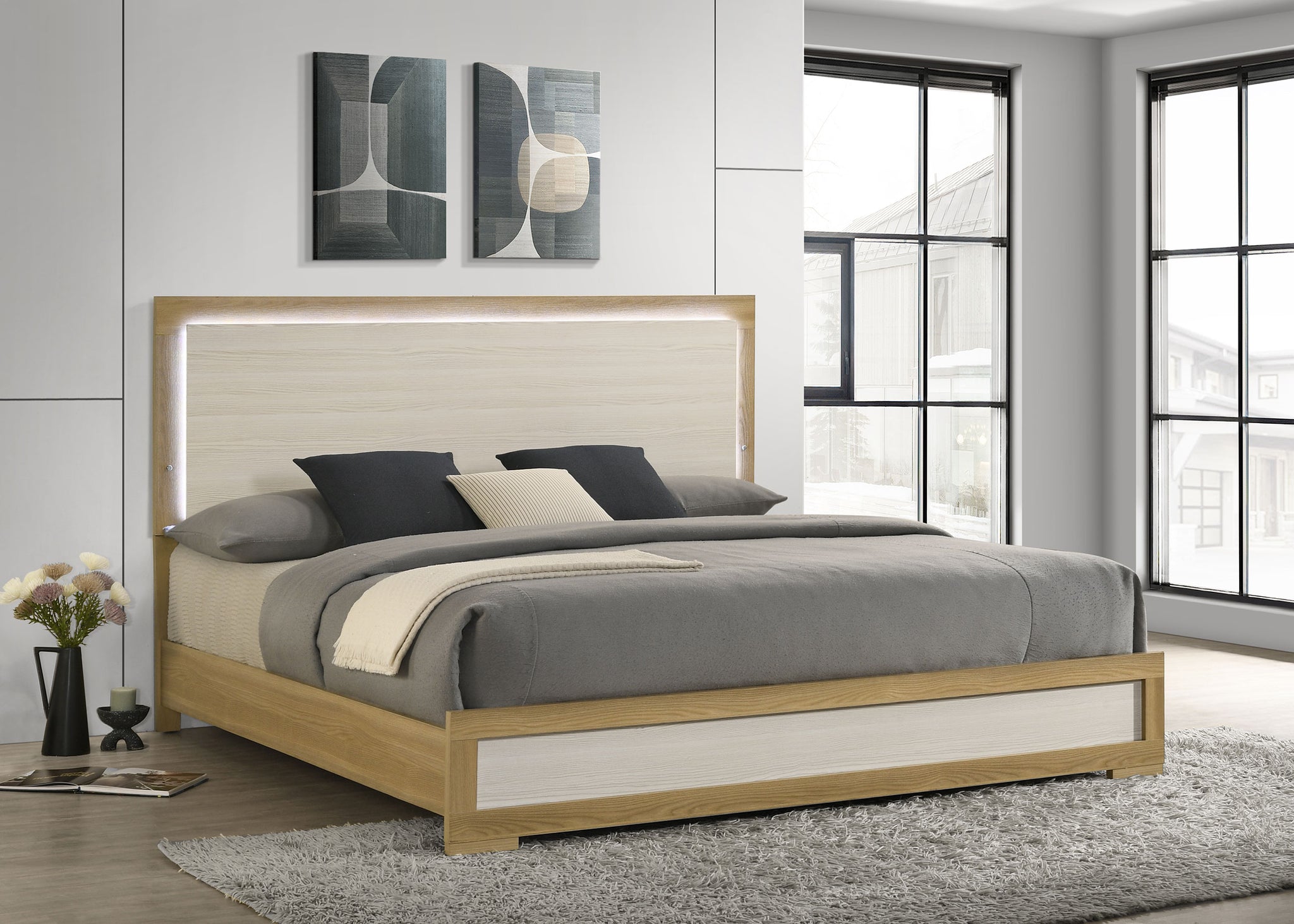 Transform your bedroom into a modern sanctuary with this stunning panel bed. Inspired by contemporary Italian design, the bed features a sophisticated blend of natural wood tones and crisp white panels crafted from durable, easy-care melamine. The headboard, adorned with integrated LED touch lighting, offers a gentle ambient glow that enhances the tranquil atmosphere of your space. This bed's contemporary elegance, combined with its practical design, ensures a restful night's sleep and a chic focal point in your bedroom. Elevate your home decor with this exceptional piece, designed to combine comfort and beauty seamlessly.