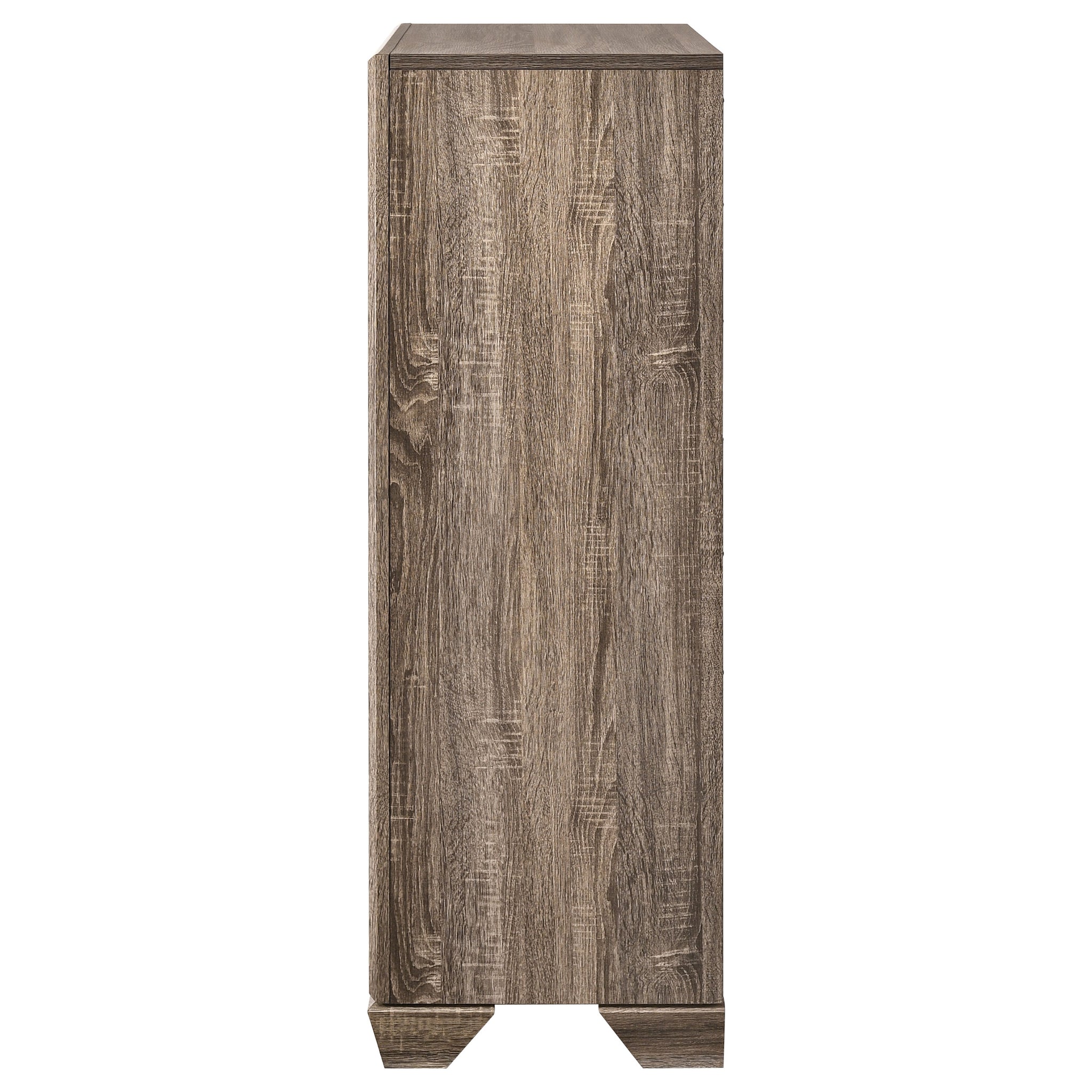 Mid-century modern-inspired, the silhouette of this five-drawer chest adds a retro feel to a contemporary space. Radiate sophistication with a washed taupe finish that highlights a stunning exposed wood grain. Refined and stylish, delicately tapered legs combine with metallic drawer pulls. Emphasize the warm hues and variations in the natural oak with the smooth and sleek edges. Add contrast with black recessed grooves around picture framed case drawer fronts. Key Features: • Five-drawer chest with clean lines and weathered light wood finish • Washed taupe surface reveals oak-inspired grain for rustic-modern charm • Black recessed grooves outline drawers for added dimension and contrast • Chrome drawer handles provide a contemporary accent to the neutral tone • Compact, vertical design offers efficient storage for clothing or linens • Constructed from engineered wood and scratch-resistant paper laminate veneer